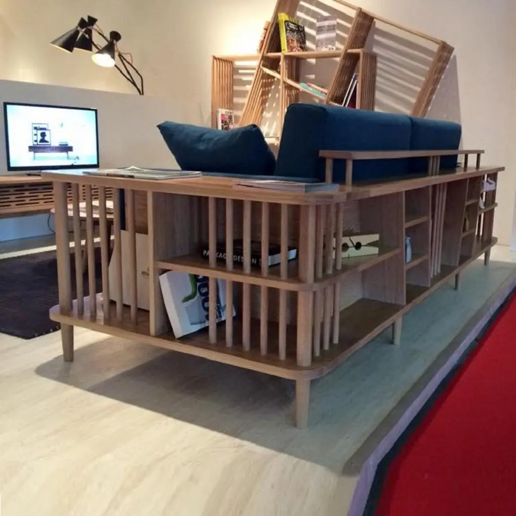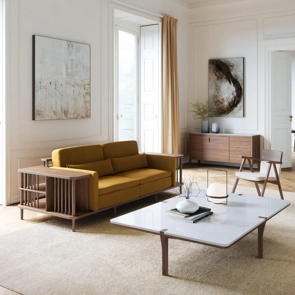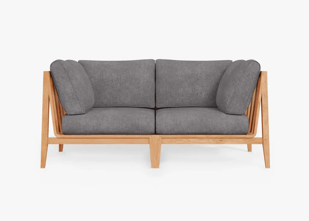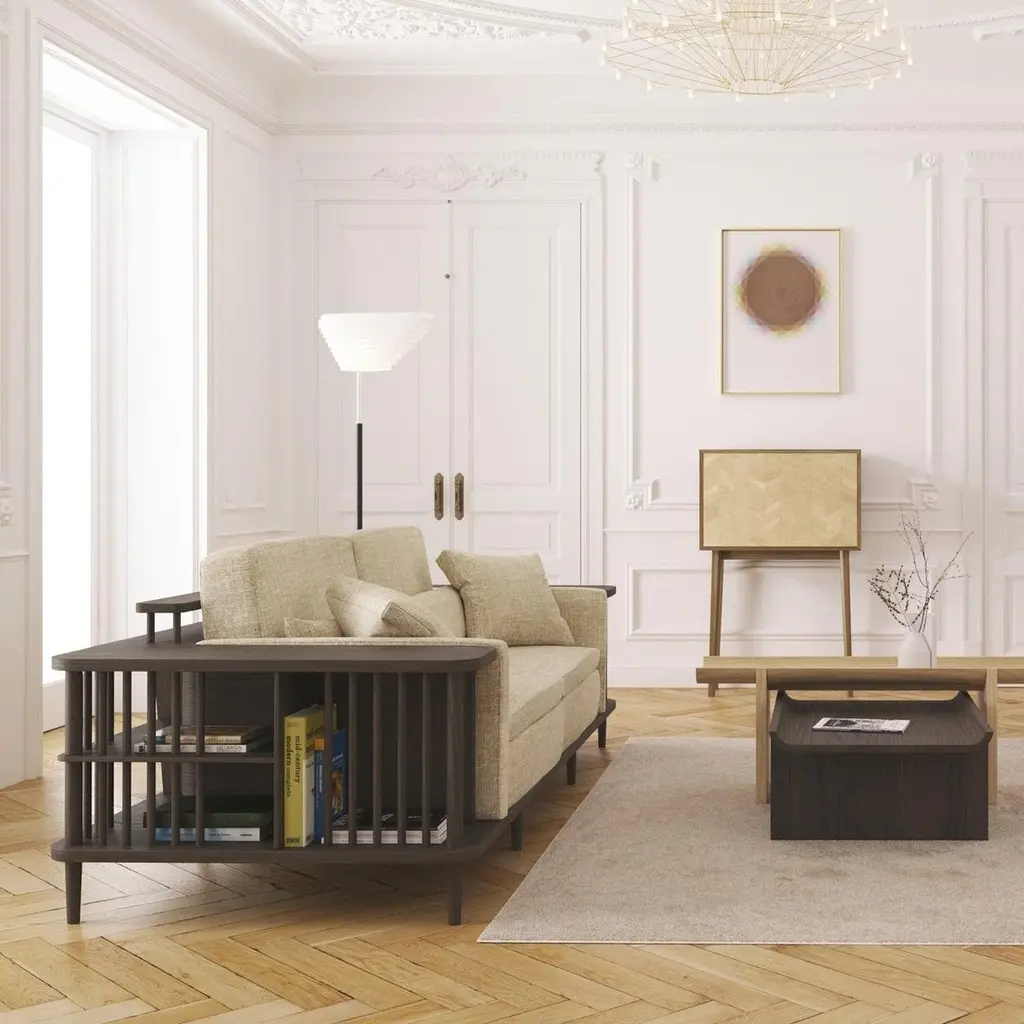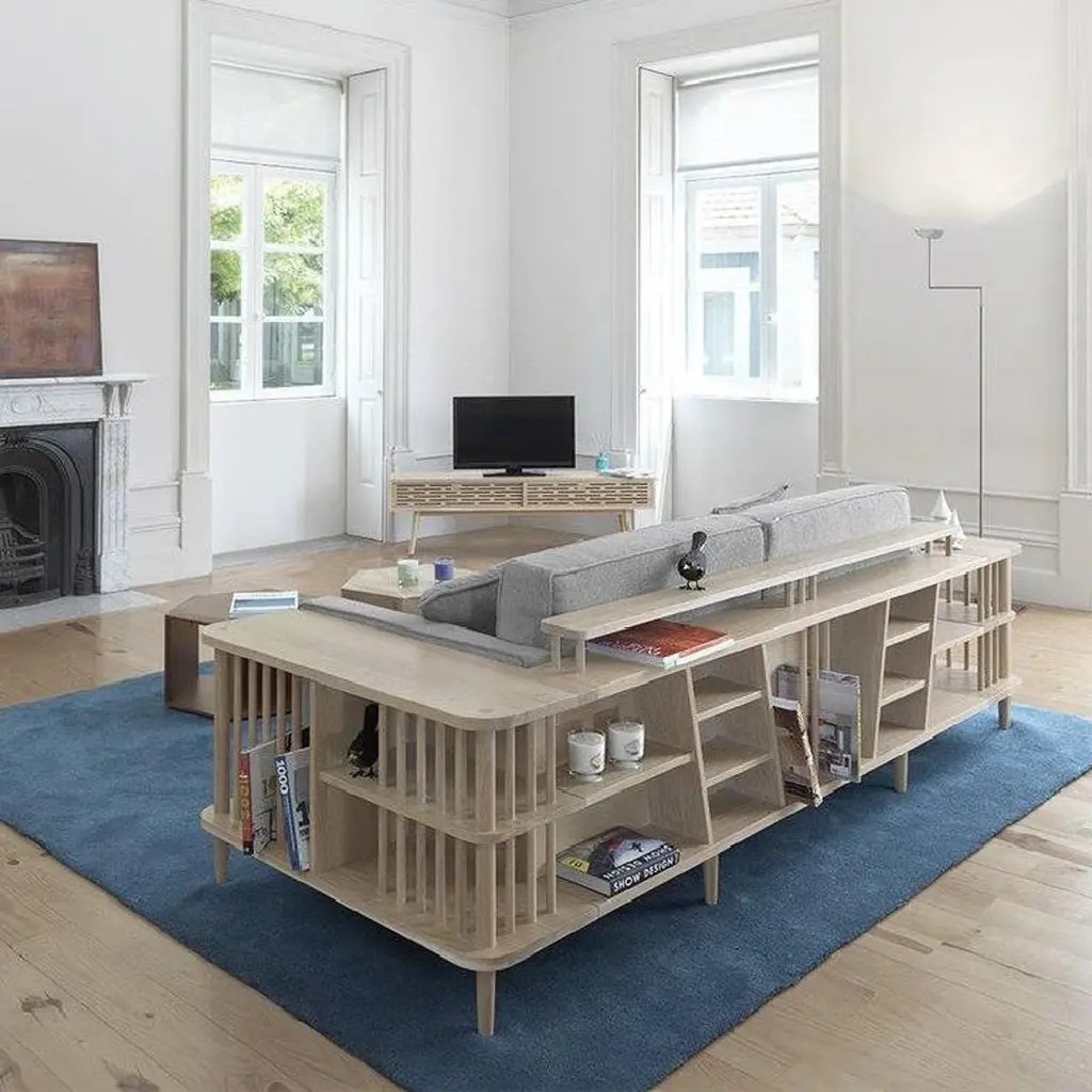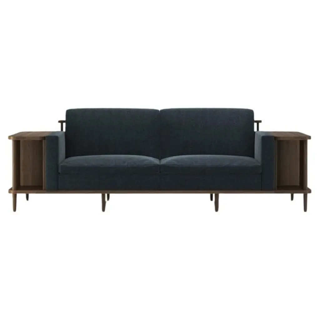 Crafted from premium materials, this sofa offers both comfort and functionality with its surrounding wooden frame doubling as a bookshelf or room divider, showcasing exquisite craftsmanship.The focal point of this sofa is its 100% solid wood structure, characterized by sturdy yet minimalist lines. Enhanced by a natural wood finish, it exudes Scandinavian charm, seamlessly blending into contemporary or traditional interiors.Contact us to enquire about COM/COL production, requirements and material shipping instructions.Please contact us if you have any questions about customization and pricing. We will be glad to check with the factory’s technical team if sizes, finishes, and colors can be customized. We do our best to expedite production and to ship and deliver product within the listed lead time, however current lead times might be longer due to global shipping backlog and delays. These delays are out of our control and cannot be a reason to cancel an order.
