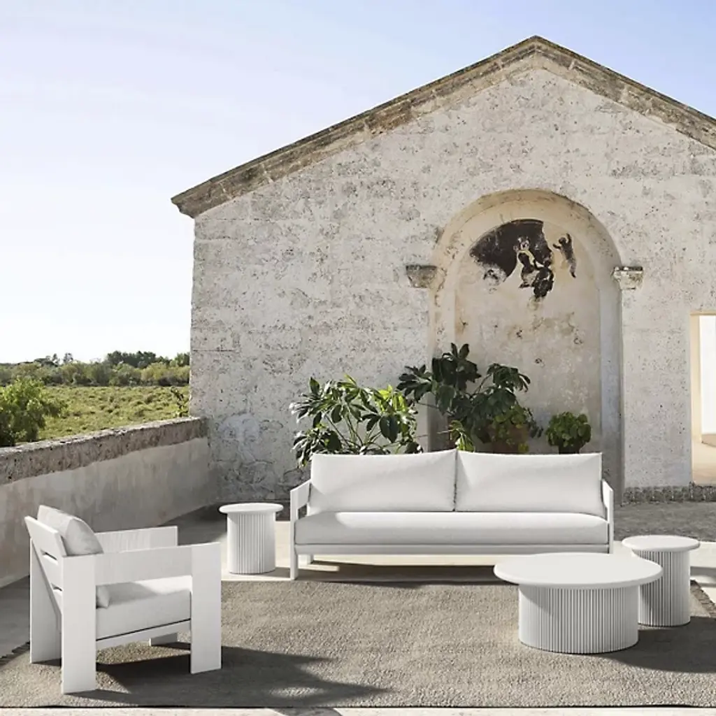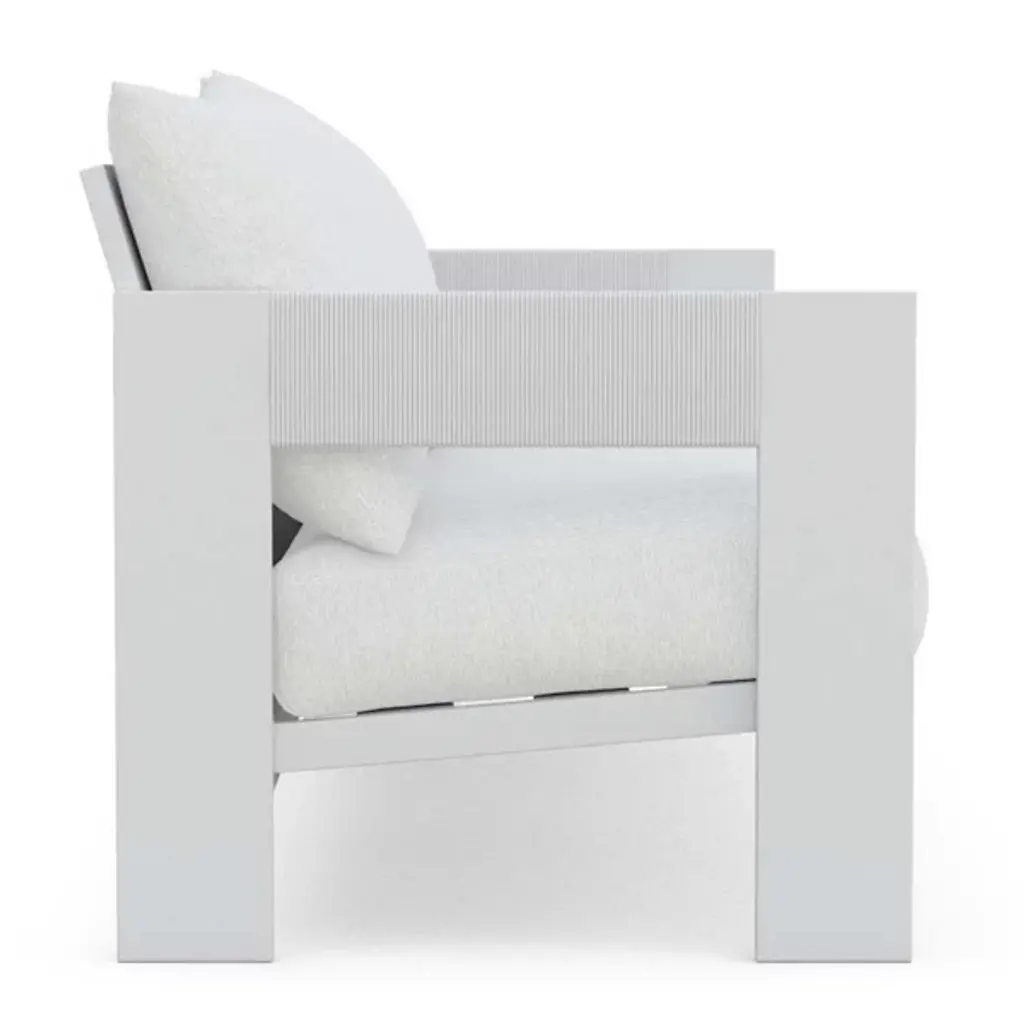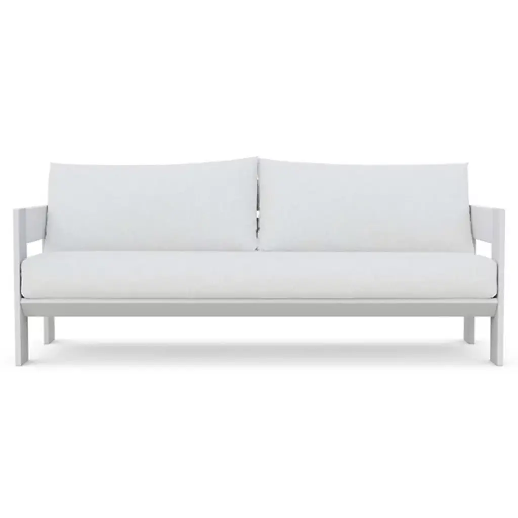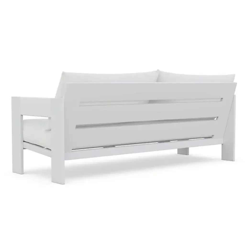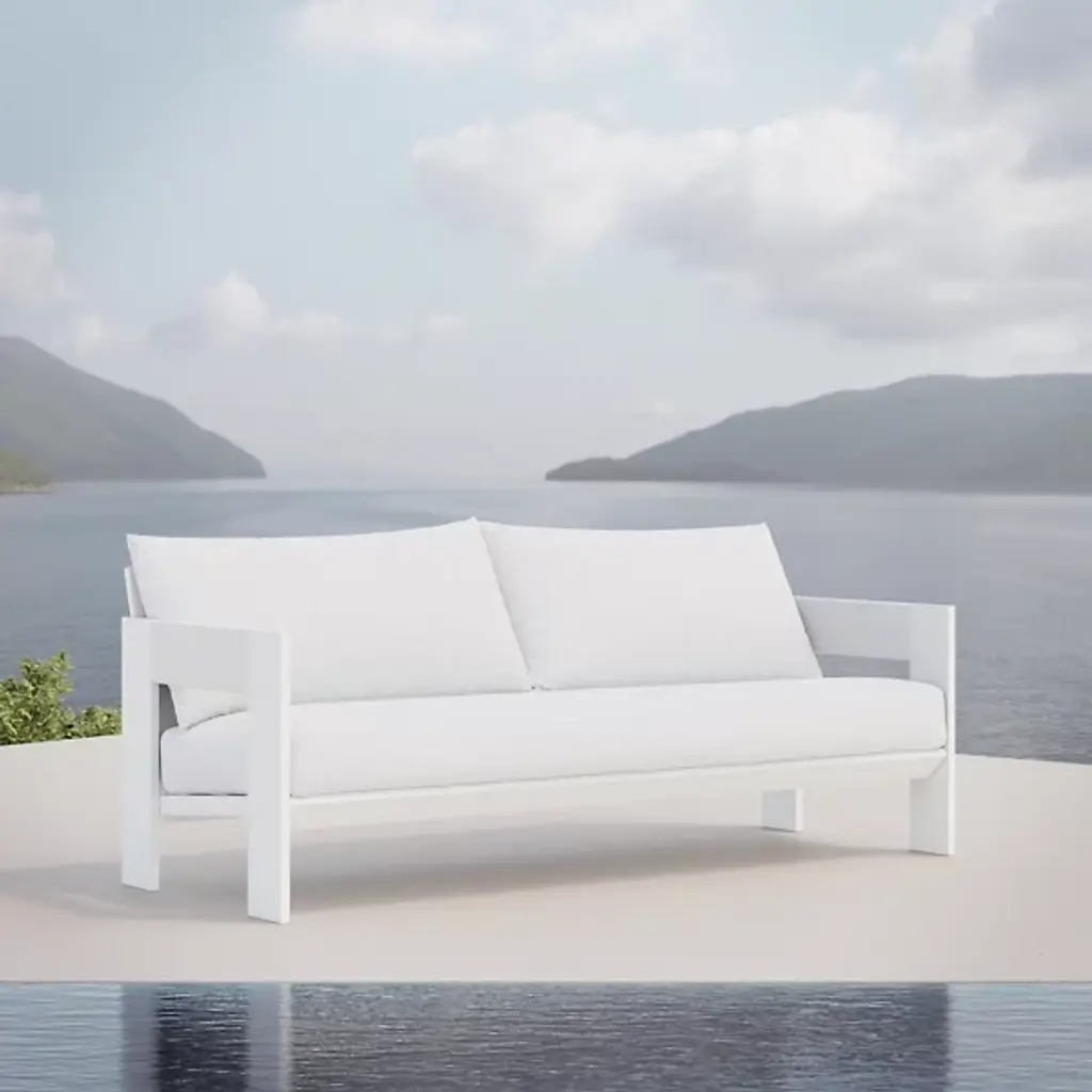 The Mykonos Outdoor 3 Seater Sofa from Azzurro Living brings effortless elegance to outdoor living with its clean lines, bold shape, and refined details. Handwoven all-weather textilene rope pairs seamlessly with a white powder-coated aluminum frame, designed to withstand the elements with ease. Generously sized and contoured for comfort, it features plush Solvita Performance Fabric cushions that offer lasting support. Whether lounging solo or hosting friends, this product invites relaxed moments with timeless style.