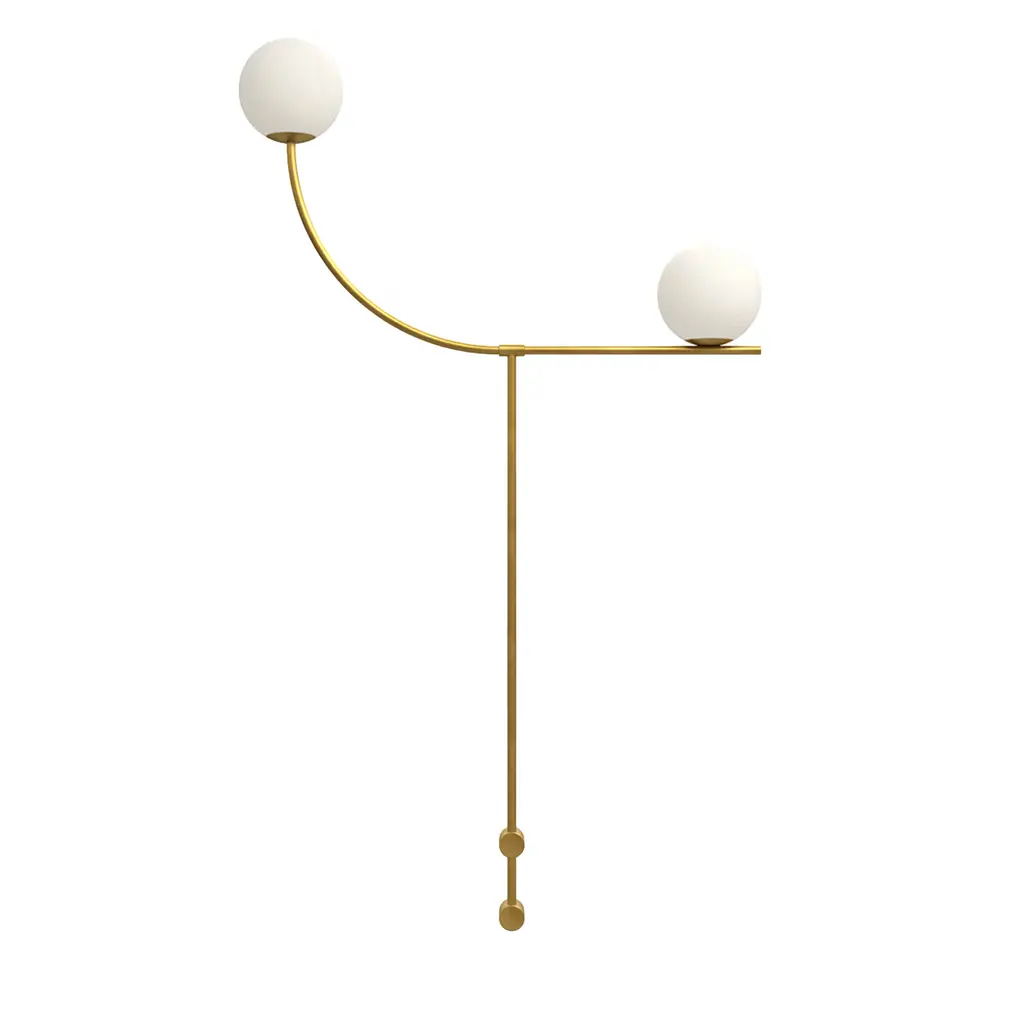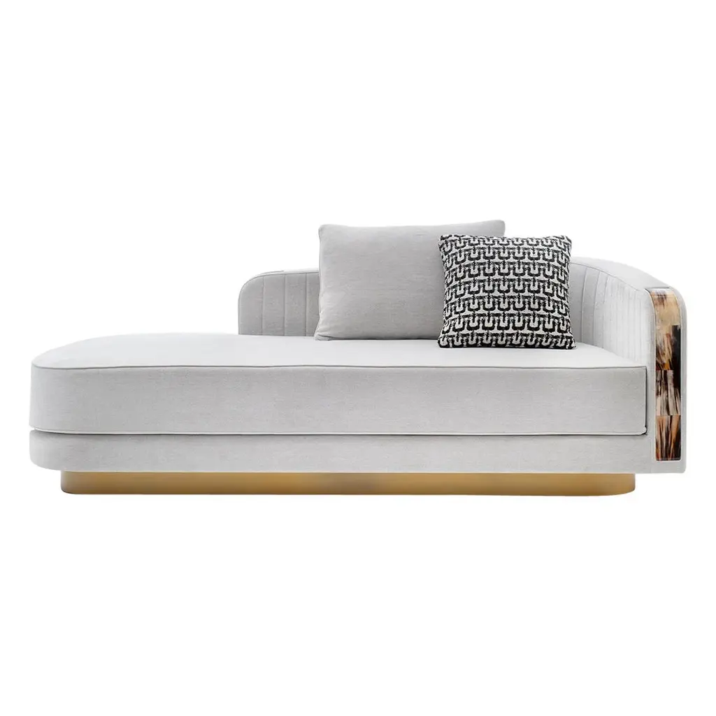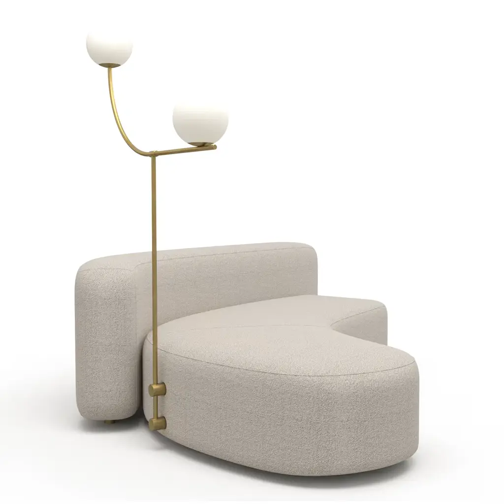 Pure shape and lines, an independent sofa with the possibility of being composed and decomposed according to the functional and aesthetic needs related to the new trends of living. The welcoming and wide seat can be equipped with a floor lamp included in the price through a simple plug-in system. The brass frame of the lamp features a streamlined element sustaining a curved arm where two spheres in opaline glass sit. Designer: La Récréation-P.Angelo Orecchioni Arch.
