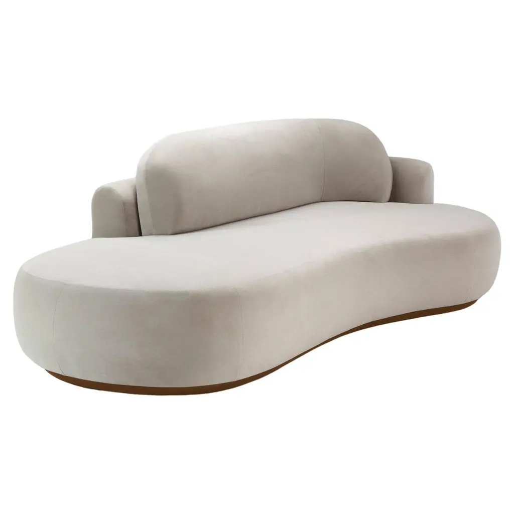 The naked curved sofa with inviting curves and a comfortable seating. Handmade with a solid wood base. The Naked Round sofa is available in a number of different materials, finishes and combinations.MaterialTop : velvet fabric, boucle fabricBase : solid wood, choose from solid wood colorsNatural OakParis MouseDimensionsAvailable in 3 sizes:Small : W 95” x D 52” x H 31” - Seat height 15”Medium : W 110” x D 52” x H 31” - Seat height 15”Large : W 118” x D 52” x H 31” - Seat height 15”Pictured inVigo blossom, natural beech.