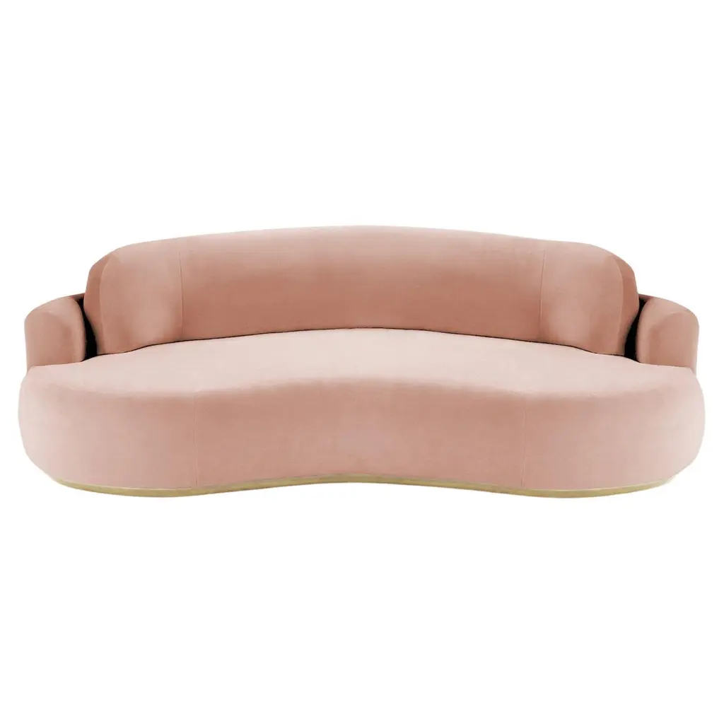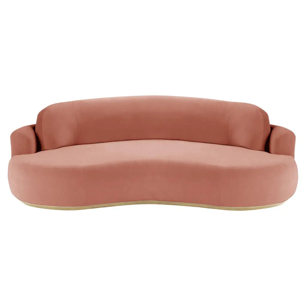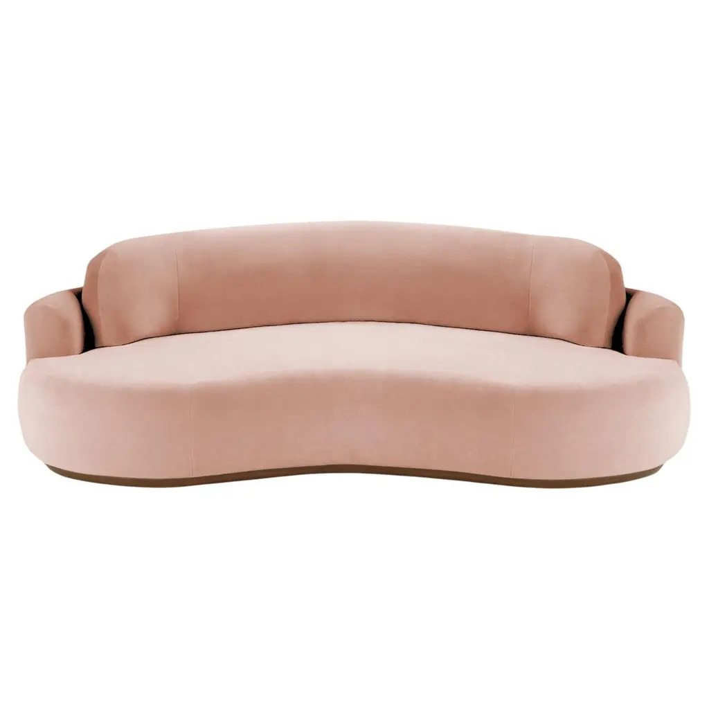 The naked curved sofa with inviting curves and a comfortable seating. Handmade with a solid wood base. The Naked Round sofa is available in a number of different materials, finishes and combinations.MaterialTop : velvet fabric, boucle fabricBase : solid wood, choose from solid wood colorsBeech ash-056-1Paris brickDimensionsAvailable in 3 sizes:Small : W 95” x D 52” x H 31” - Seat height 15”Medium : W 110” x D 52” x H 31” - Seat height 15”Large : W 118” x D 52” x H 31” - Seat height 15”Pictured inSmooth 60, natural beech.