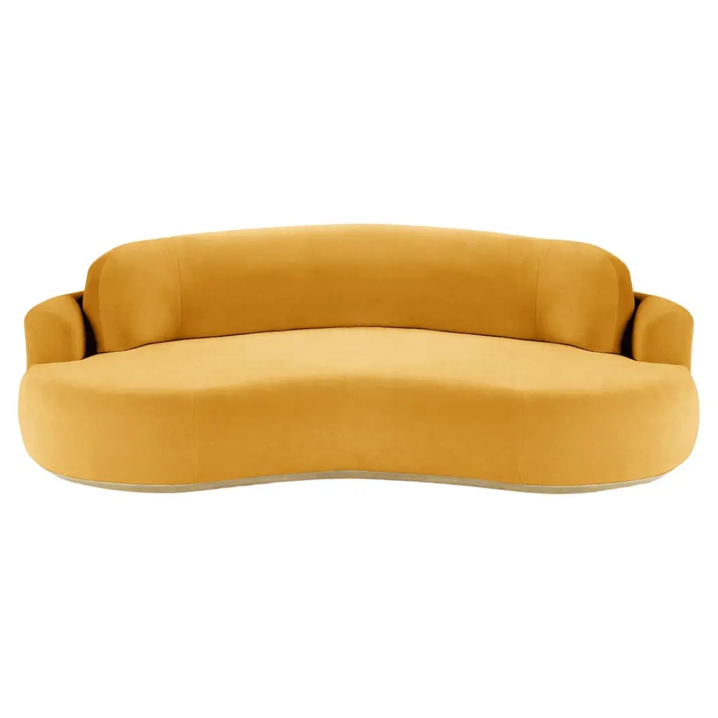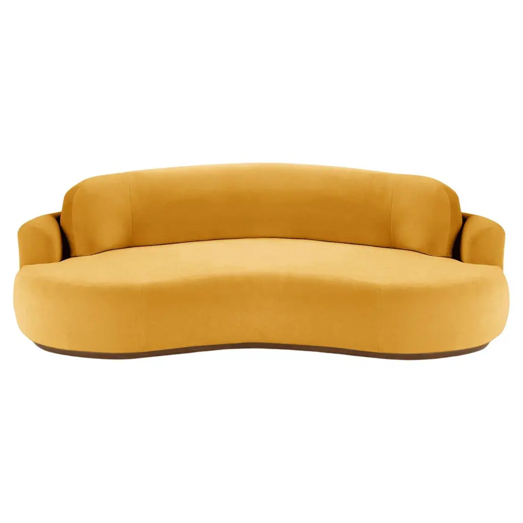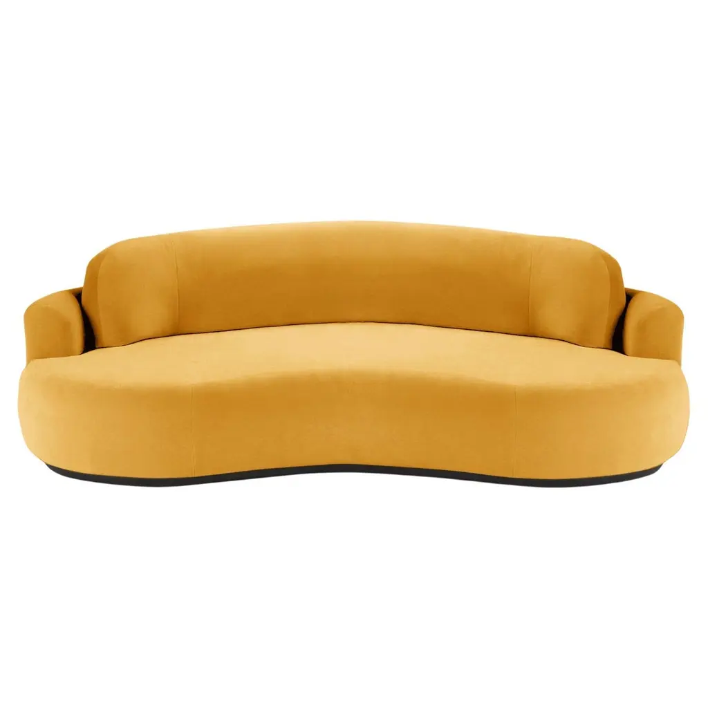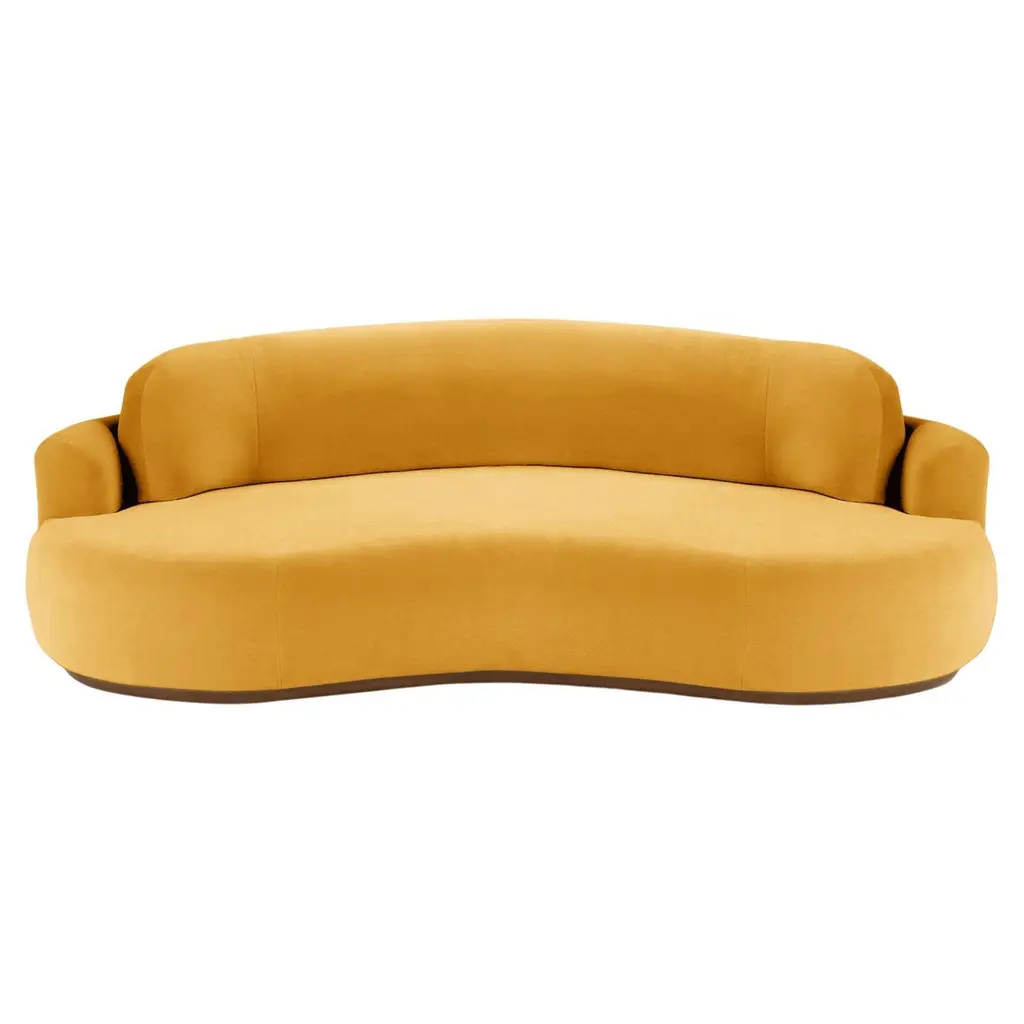 The Naked Curved Sofa with Inviting curves and a comfortable seating. Handmade with a solid wood base. The Naked Round sofa is available in a number of different materials, finishes and combinations.MaterialTop : velvet fabric, boucle fabricBase : solid wood, choose from solid wood colorsBeech Ash-056-5CornDimensionsAvailable in 3 sizes:Small : W 95” x D 52” x H 31” - Seat height 15”Medium : W 110” x D 52” x H 31” - Seat height 15”Large : W 118” x D 52” x H 31” - Seat height 15”Pictured inSmooth 19 Teal, Natural Beech.