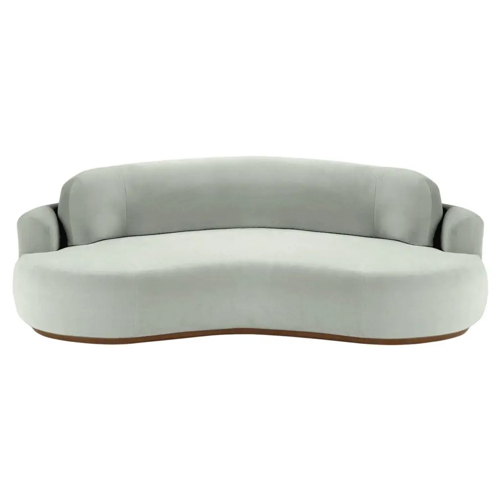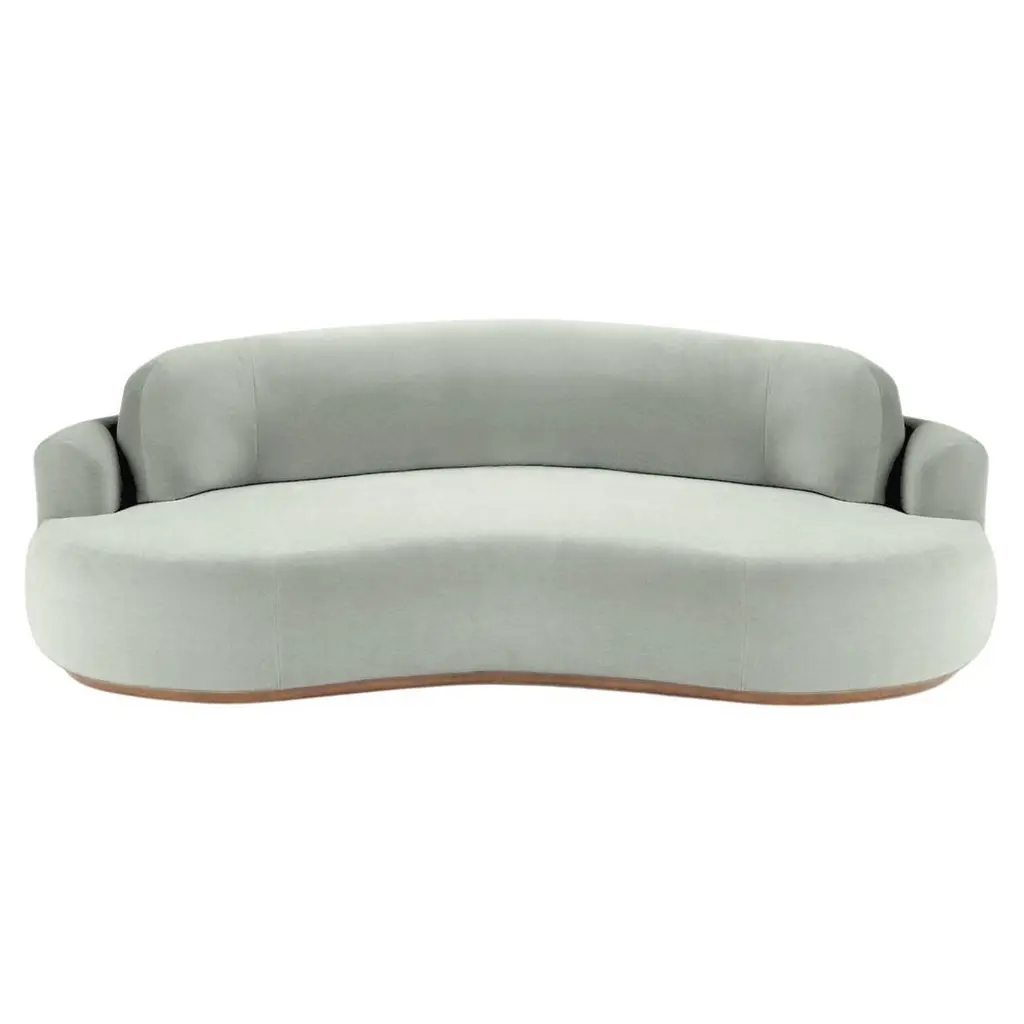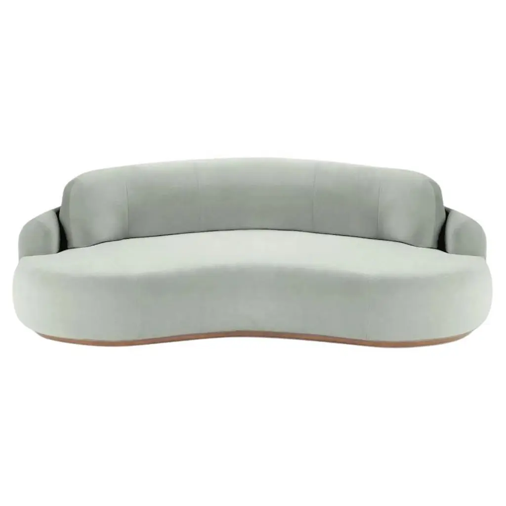 The naked curved sofa with Inviting curves and a comfortable seating. Handmade with a solid wood base. The Naked Round sofa is available in a number of different materials, finishes and combinations.MaterialTop : velvet fabric, boucle fabricBase : solid wood, choose from solid wood colorsNatural OakAluminiumDimensionsAvailable in 3 sizes:Small : W 95” x D 52” x H 31” - Seat height 15”Medium : W 110” x D 52” x H 31” - Seat height 15”Large : W 118” x D 52” x H 31” - Seat height 15”Pictured inSmooth 19 Teal, Natural Beech.