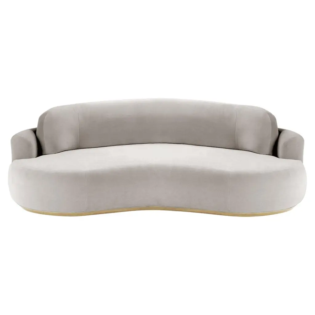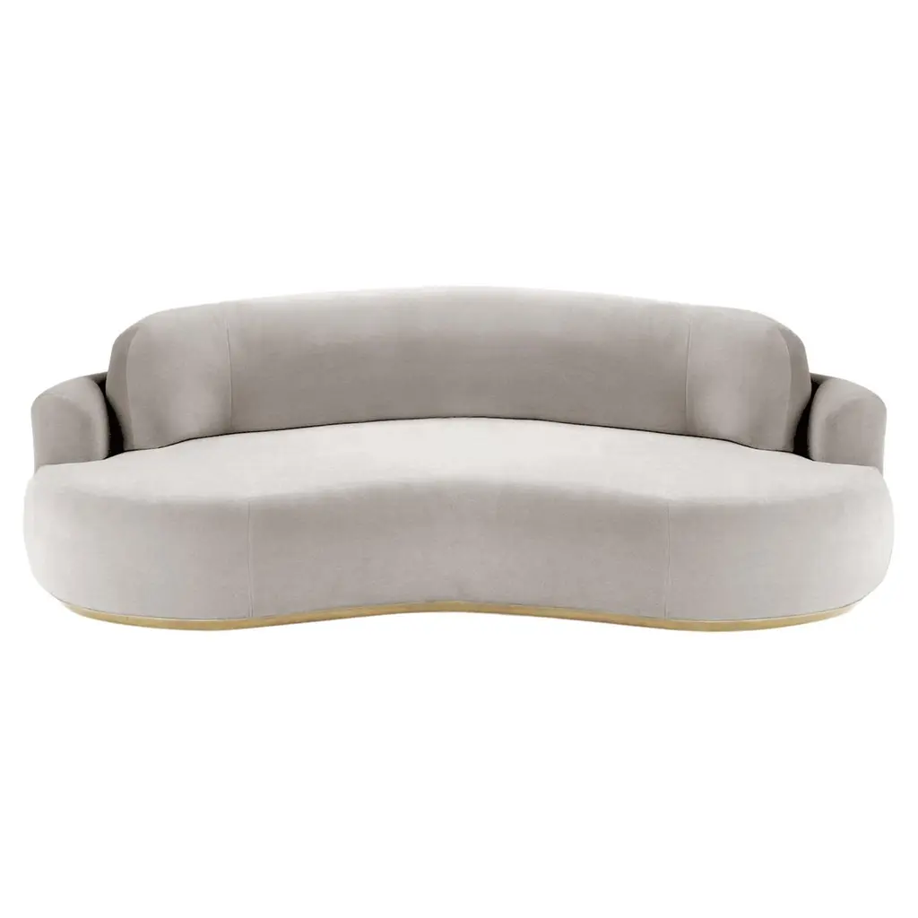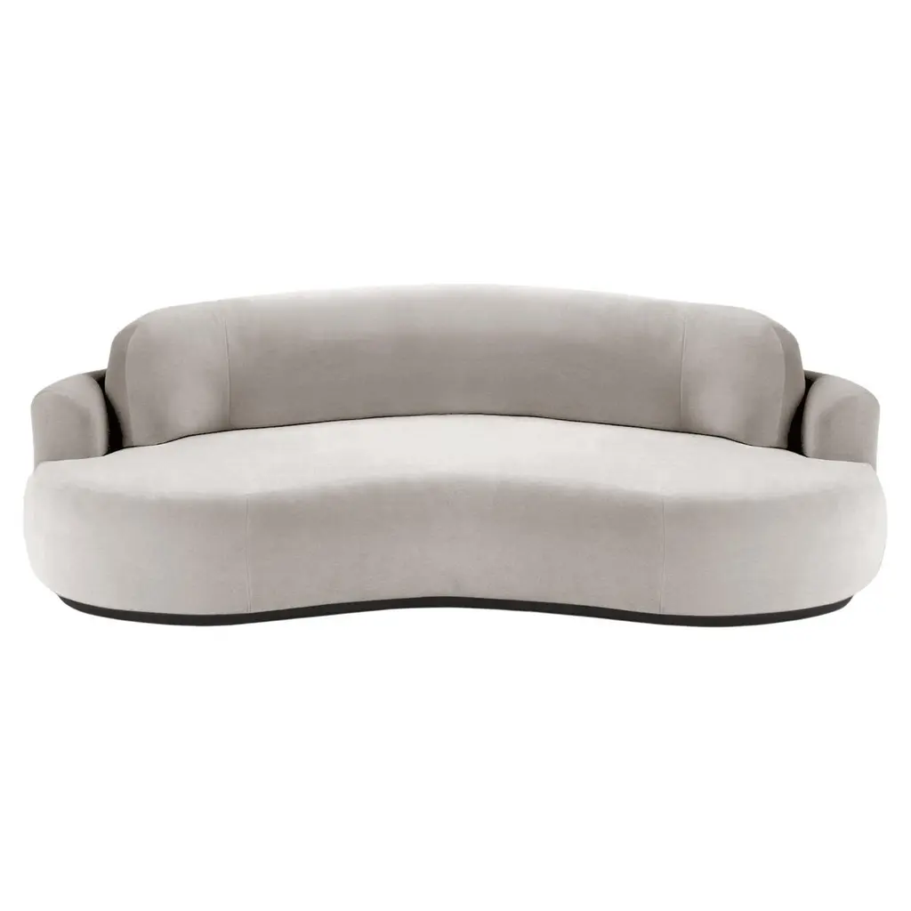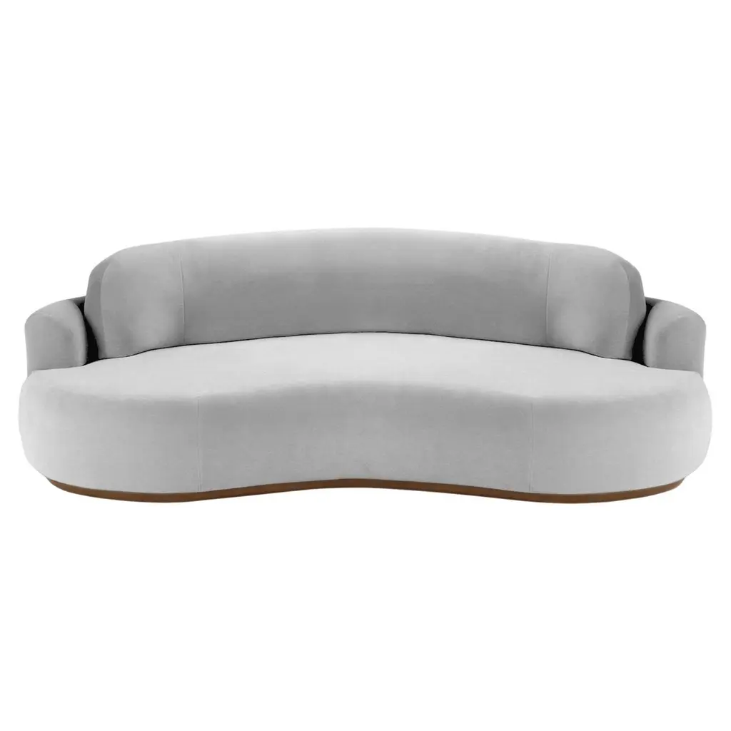 The naked curved sofa with Inviting curves and a comfortable seating. Handmade with a solid wood base. The Naked Round sofa is available in a number of different materials, finishes and combinations.MaterialTop : velvet fabric, boucle fabricBase : solid wood, choose from solid wood colorsNatural OakAluminiumDimensionsAvailable in 3 sizes:Small : W 95” x D 52” x H 31” - Seat height 15”Medium : W 110” x D 52” x H 31” - Seat height 15”Large : W 118” x D 52” x H 31” - Seat height 15”Pictured inSmooth 19 Teal, Natural Beech.