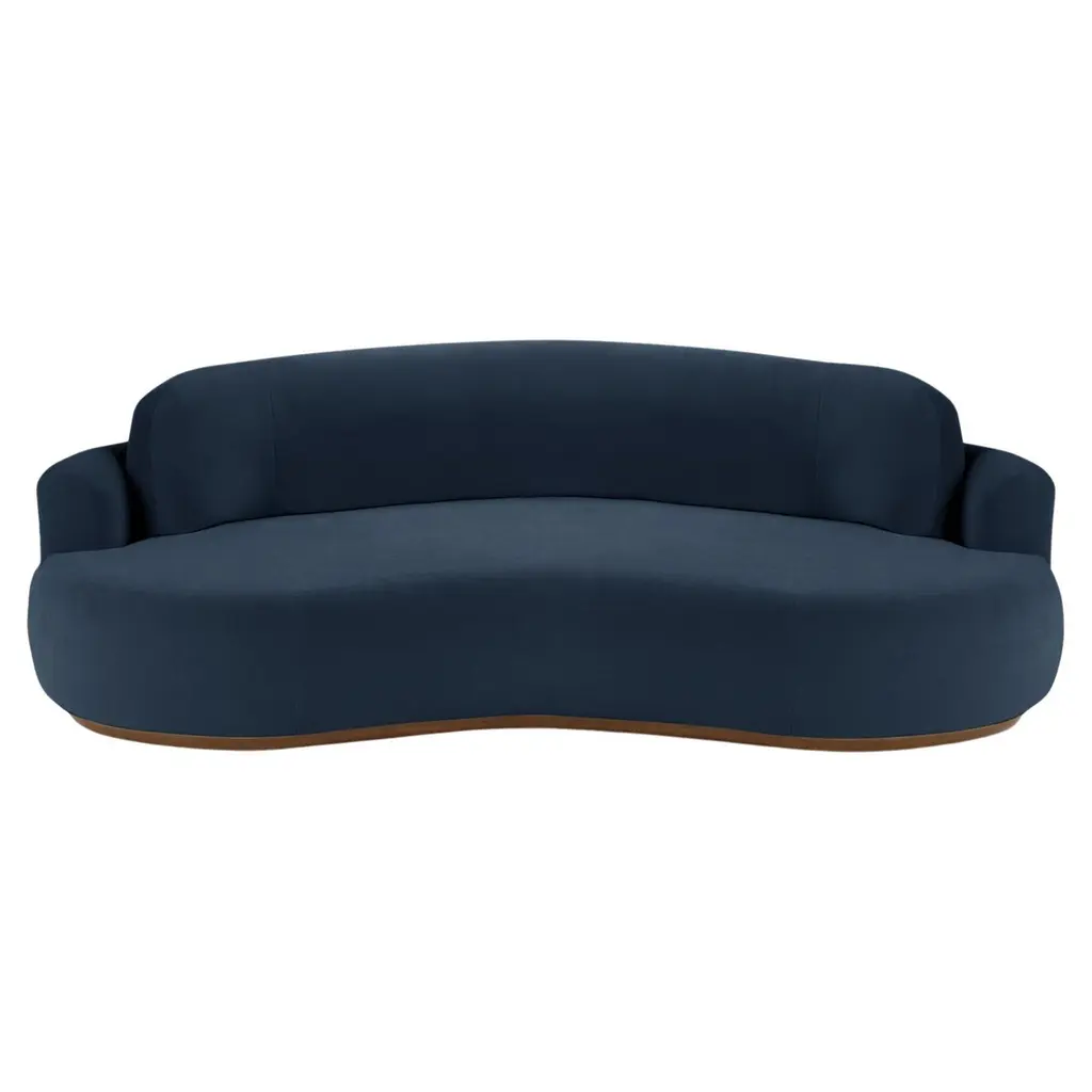 The naked curved sofa with Inviting curves and a comfortable seating. Handmade with a solid wood base. The Naked Round sofa is available in a number of different materials, finishes and combinations.MaterialTop : velvet fabric, boucle fabricBase : solid wood, choose from solid wood colorsNatural oakParis blackDimensionsAvailable in 3 sizes:Small : W 95” x D 52” x H 31” - seat height 15”Medium : W 110” x D 52” x H 31” - seat height 15”Large : W 118” x D 52” x H 31” - seat height 15”Pictured inSmooth 19 teal, natural beech.