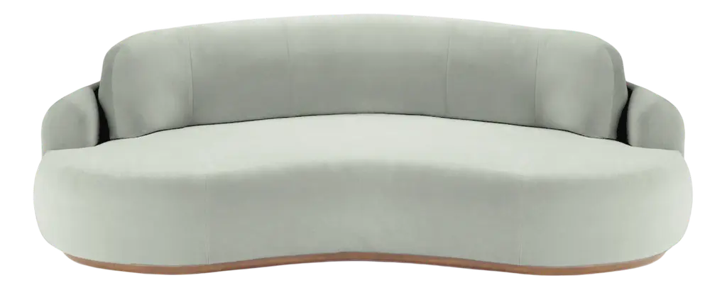 The Naked Curved Sofa with Inviting curves and a comfortable seating. Handmade with a solid wood base. The Naked Round sofa is available in a number of different materials, finishes and combinations.MaterialTop : velvet fabric, boucle fabricBase : solid wood, choose from solid wood colorsWood: Beech Ash-056-1Fabric: Paris Dark BlueDimensionsAvailable in 3 sizes:Small : W 95” x D 52” x H 31” - Seat height 15”Medium : W 110” x D 52” x H 31” - Seat height 15”Large : W 118” x D 52” x H 31” - Seat height 15”Pictured inVigo blossom, Natural Beech.