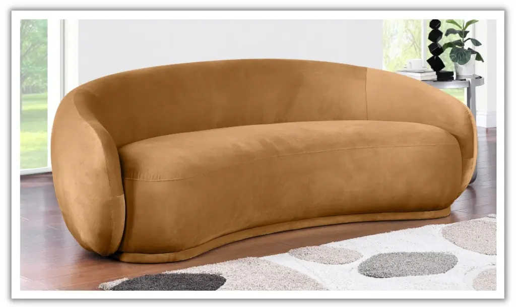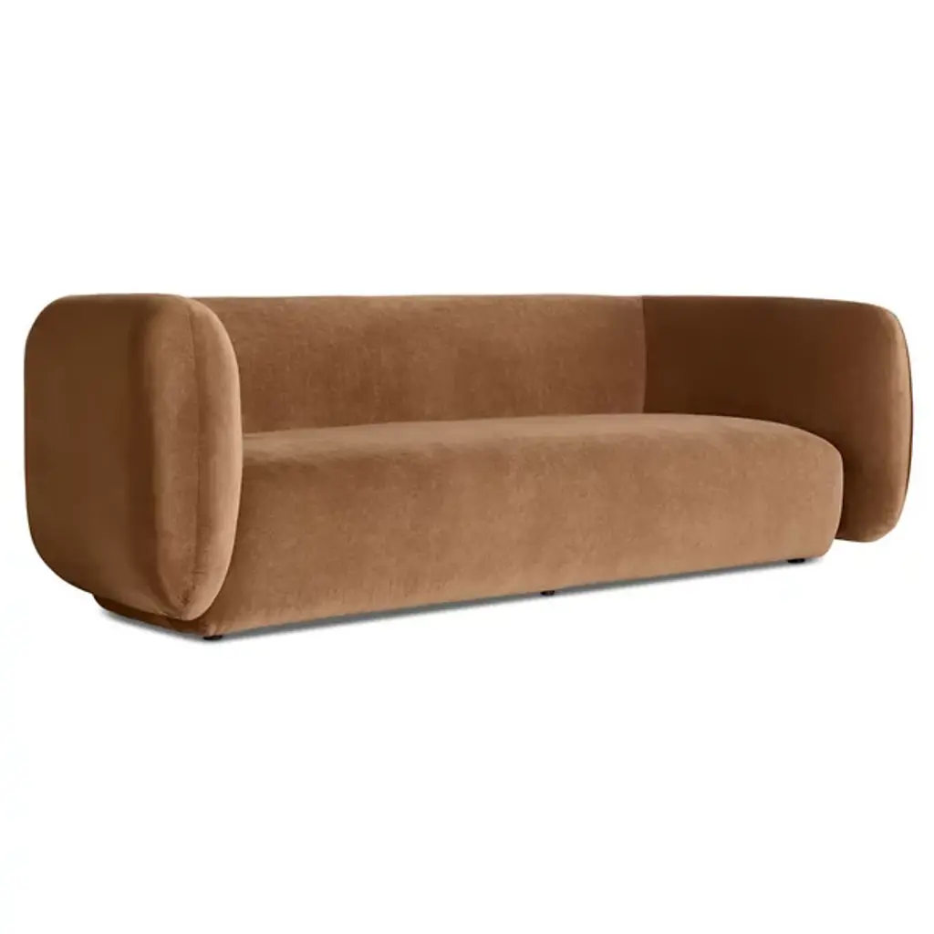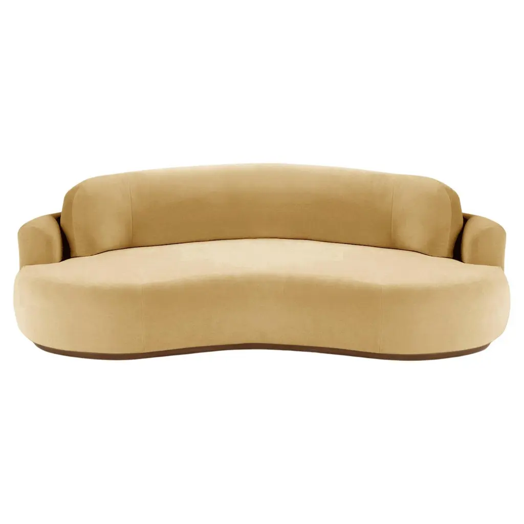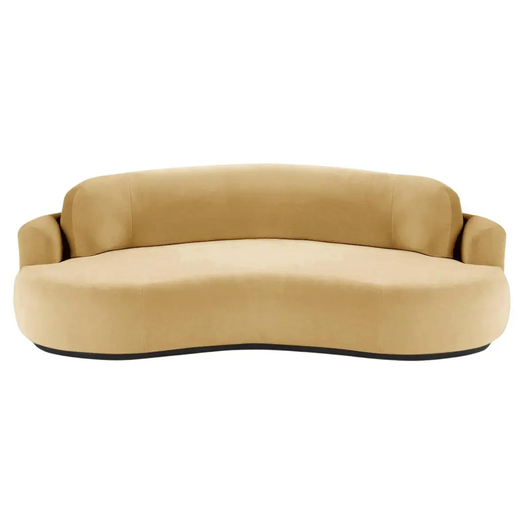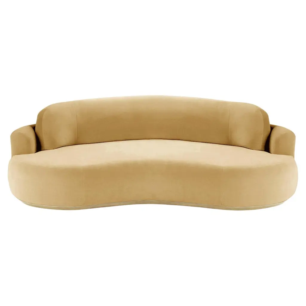 The naked curved sofa with inviting curves and a comfortable seating. Handmade with a solid wood base. The naked round sofa is available in a number of different materials, finishes and combinations.MaterialTop : velvet fabric, boucle fabricBase : solid wood, choose from solid wood colorsWood: beech ash-056-5Fabric: Vigo PlantainDimensionsAvailable in 3 sizes:Small : W 95” x D 52” x H 31” - Seat height 15”Medium : W 110” x D 52” x H 31” - Seat height 15”Large : W 118” x D 52” x H 31” - Seat height 15”Pictured inVigo blossom, Natural Beech.