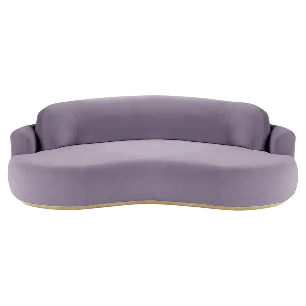The naked curved sofa with inviting curves and a comfortable seating. Handmade with a solid wood base. The naked round sofa is available in a number of different materials, finishes and combinations.MaterialTop : velvet fabric, boucle fabricBase : solid wood, choose from solid wood colorsWood: natural oakFabric: Barcelona LotusDimensionsAvailable in 3 sizes:Small : W 95” x D 52” x H 31” - Seat height 15”Medium : W 110” x D 52” x H 31” - Seat height 15”Large : W 118” x D 52” x H 31” - Seat height 15”Pictured inVigo blossom, Natural Beech.