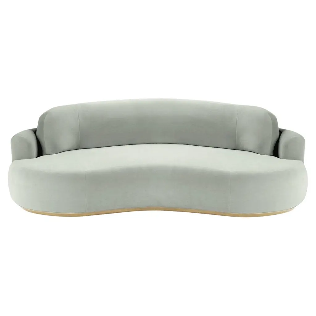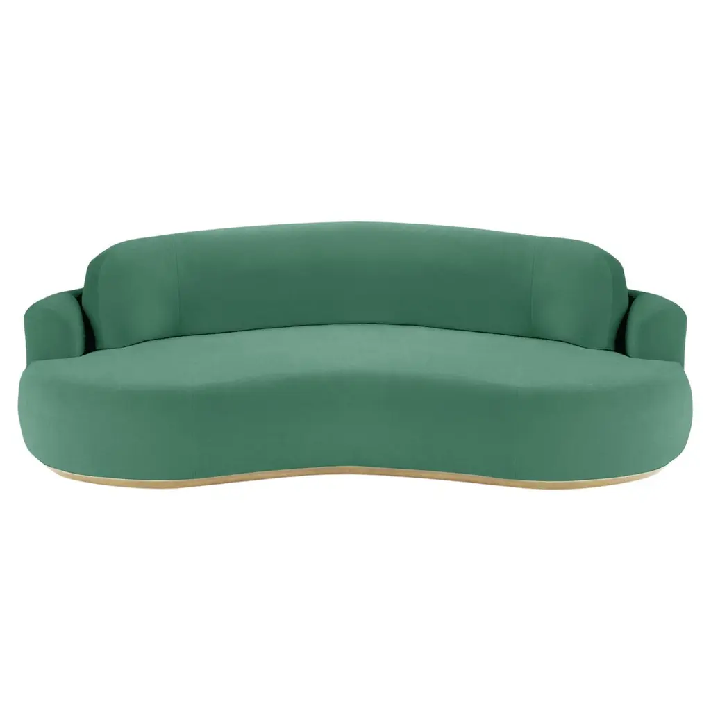The Naked Round Sofa with Inviting curves and a comfortable seating. Handmade with a solid wood base. The Naked Round sofa is available in a number of different materials, finishes and combinations.MaterialTop : velvet fabric, boucle fabricBase : solid wood, choose from solid wood colorsDimensionsAvailable in 3 sizes:Small : W 95” x D 52” x H 31” - Seat height 15”Medium : W 110” x D 52” x H 31” - Seat height 15”Large : W 118” x D 52” x H 31” - Seat height 15”Pictured inSmooth 19 Teal, Natural Beech.