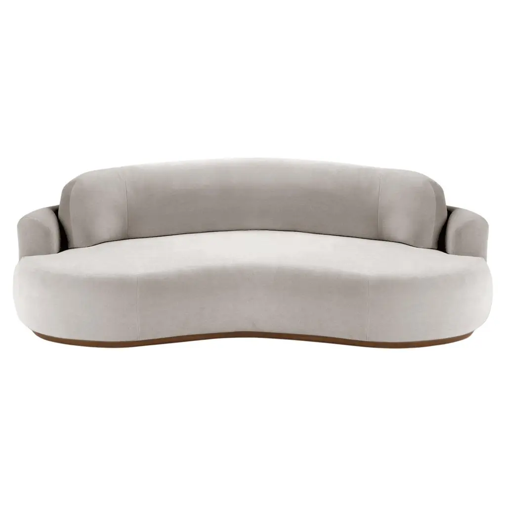 The naked round sofa with Inviting curves and a comfortable seating. Handmade with a solid wood base. The Naked Round sofa is available in a number of different materials, finishes and combinations.MaterialTop : velvet fabric, boucle fabricBase : solid wood, choose from solid wood colorsDimensionsAvailable in 3 sizes:Small : W 95” x D 52” x H 31” - Seat height 15”Medium : W 110” x D 52” x H 31” - Seat height 15”Large : W 118” x D 52” x H 31” - Seat height 15”Pictured inSmooth 19 Teal, Natural Beech.