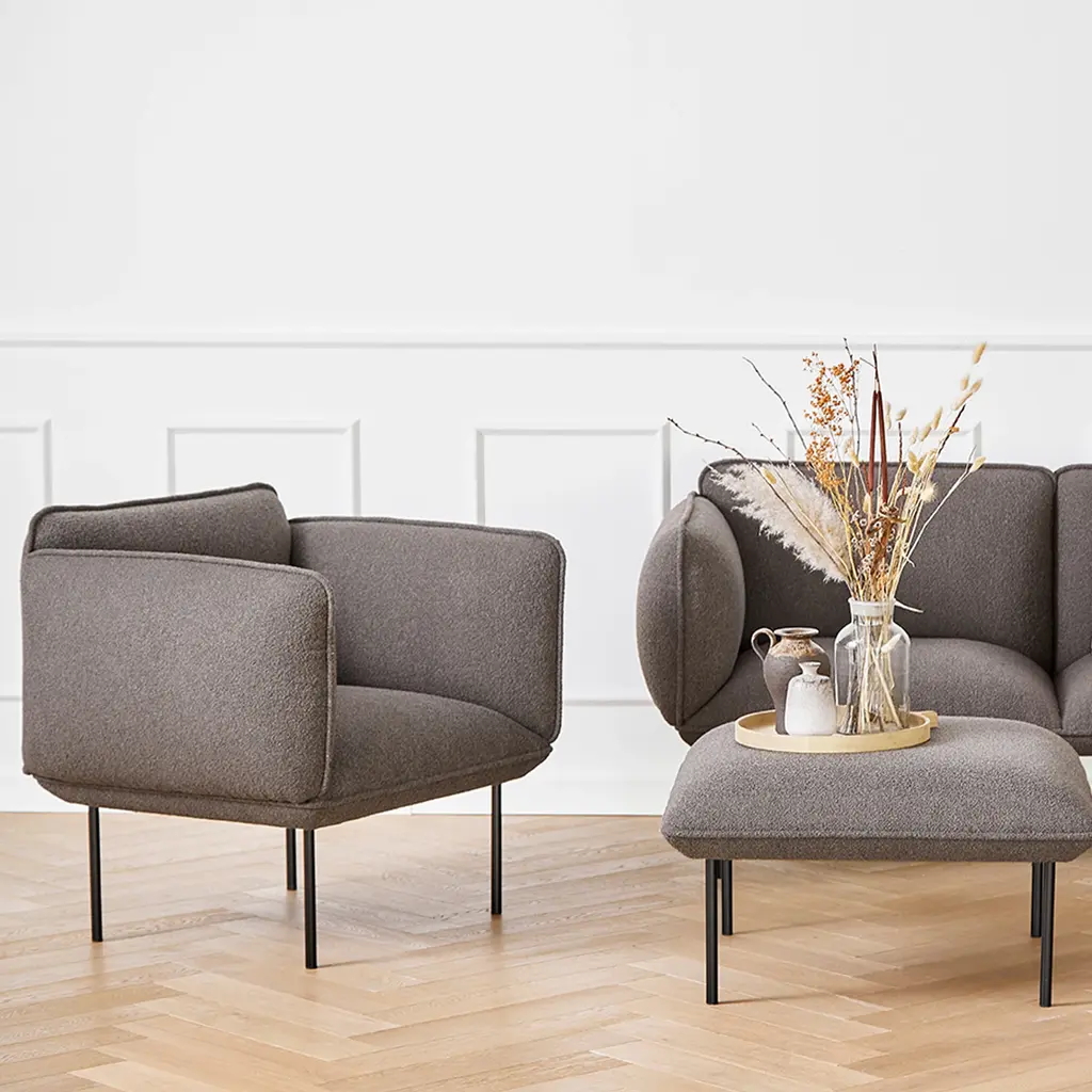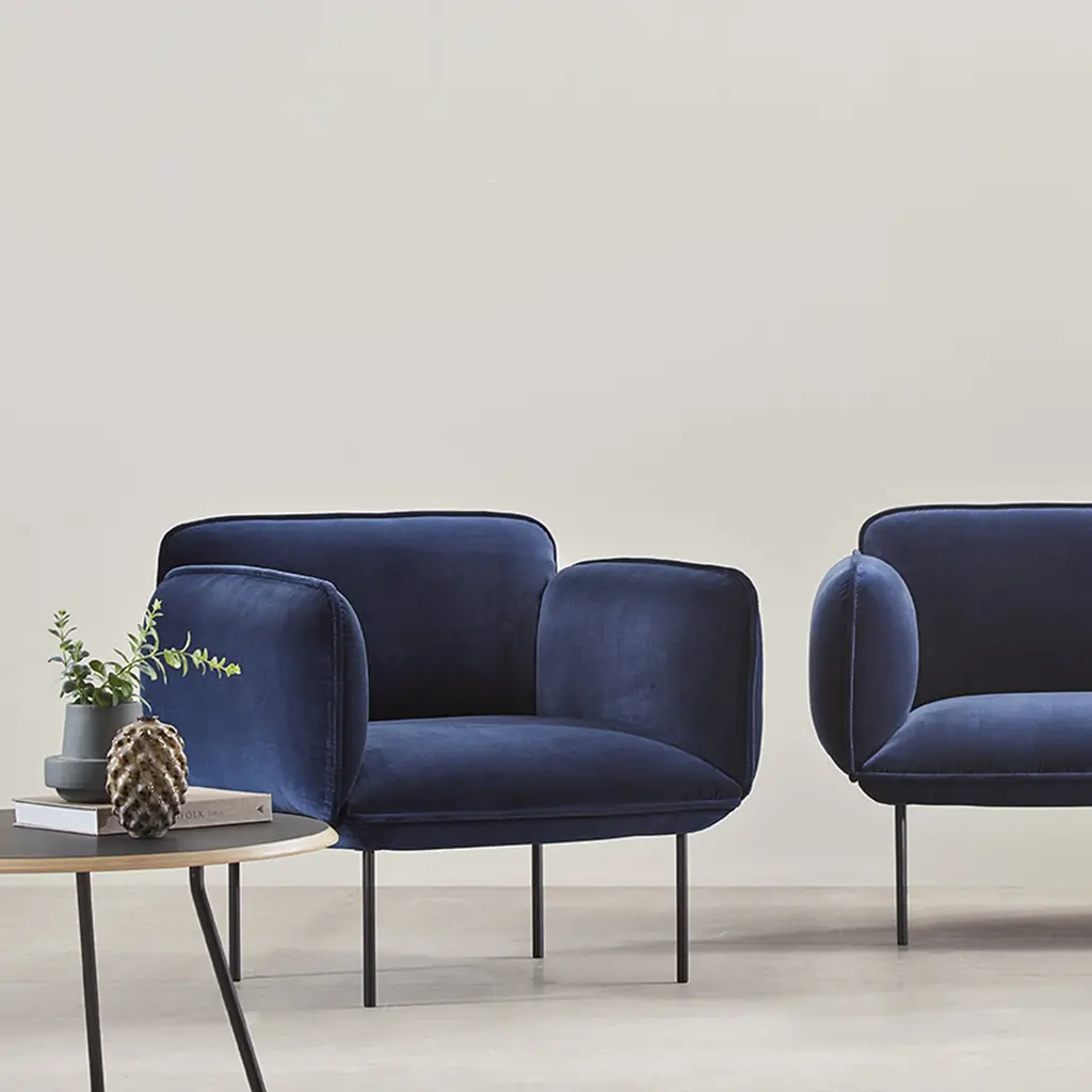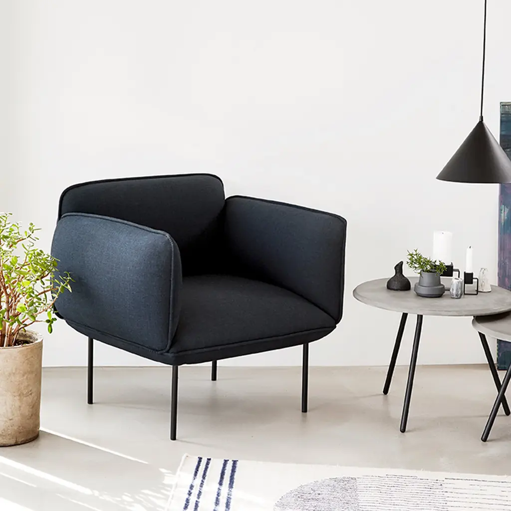 Nakki's generous proportions make it a natural for the lounge chair version in the series from Danish design brand Woud. Voluminously rounded contours promise hours of comfortable sitting with ample yet firm padding. Finnish design star Mika Tolvanen contrasts the plump profile with slender metal legs in a striking juxtaposition of minimalist elements.