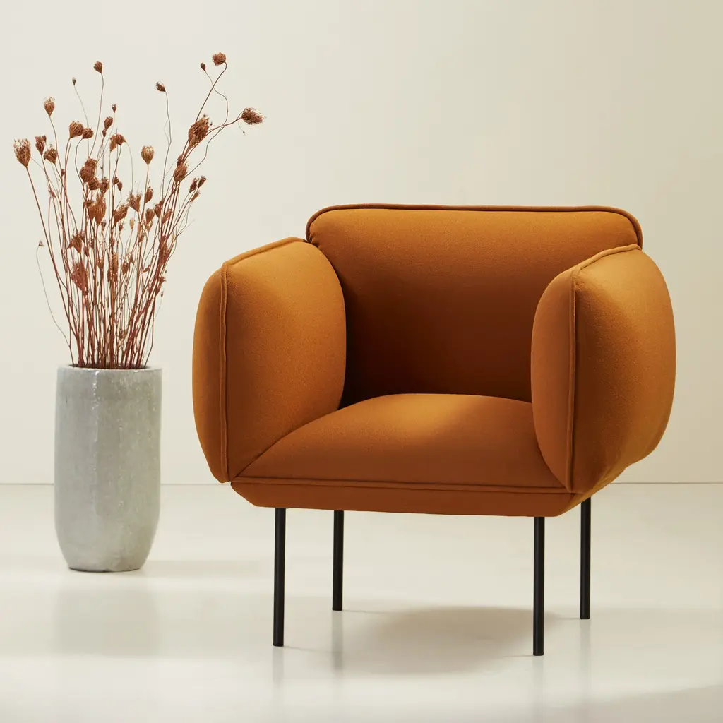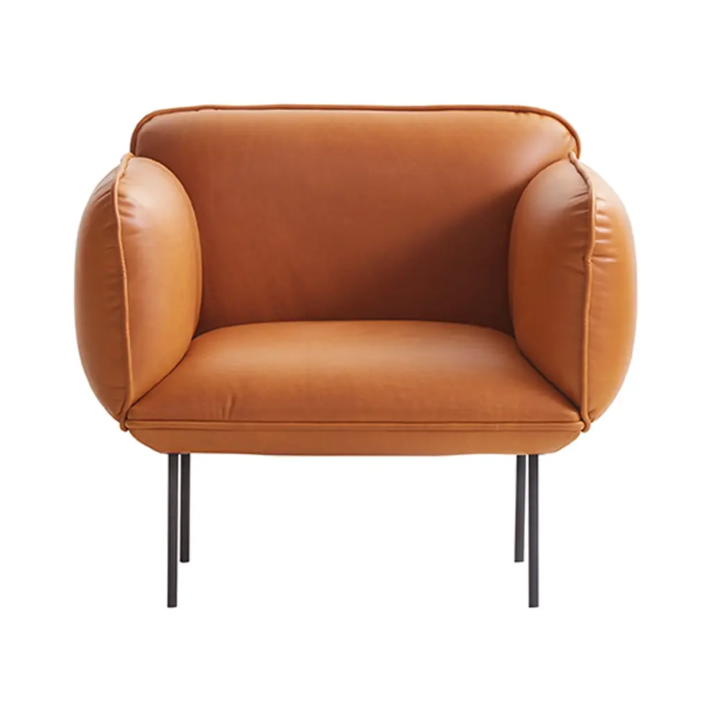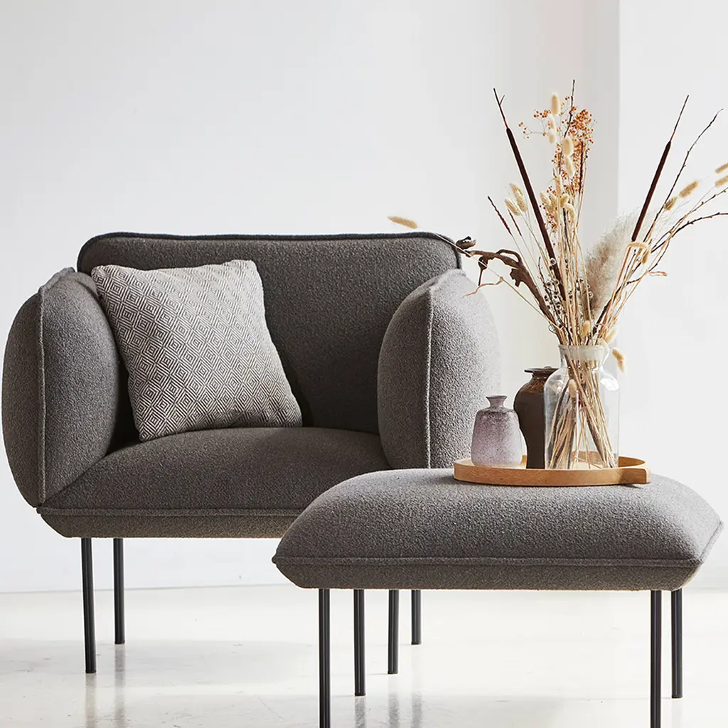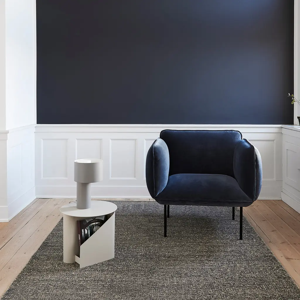 Nakki's generous proportions make it a natural for the lounge chair version in the series from Danish design brand Woud. Voluminously rounded contours promise hours of comfortable sitting with ample yet firm padding. Finnish design star Mika Tolvanen contrasts the plump profile with slender metal legs in a striking juxtaposition of minimalist elements.