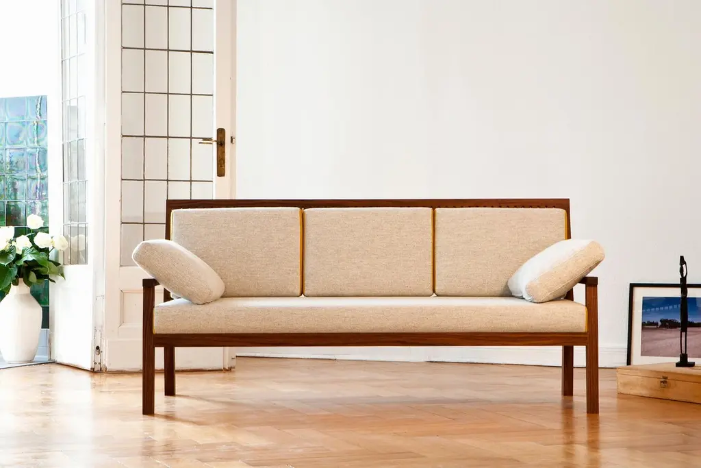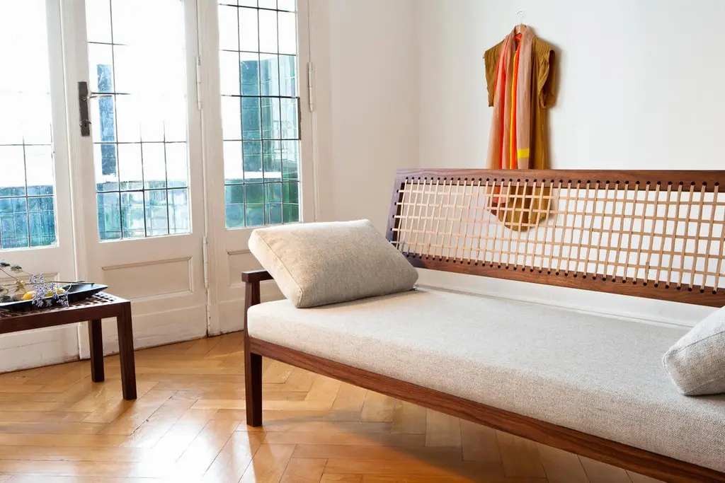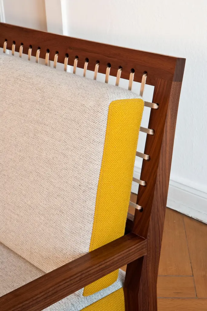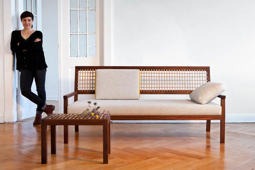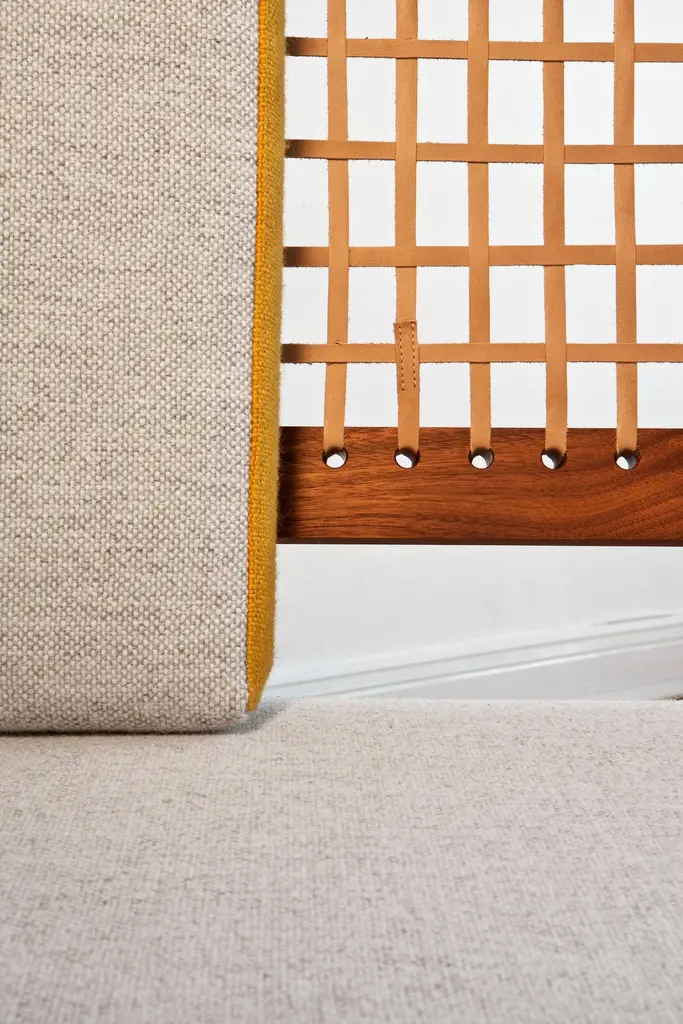 Natú Sofa by Frau CazeDimensions: D 74 x W 182 x H 84 cm.Materials: Oiled walnut, Kvadrat, leather.Sofa Natú was inspired by the cool, stony landscapes of Bolivia and Argentina. The classic walnut frame and clean silhouette echo the expansive horizons of these high-altitude settings.The woven leather backing makes the sofa an attractive, freestanding centerpiece for any room, while the understated design makes for an easy match with existing furniture.High-density foam upholstery supports a healthy posture while sitting or reclining.Manufacturing and obtaining of materials in Europe.A variety of colors and materials are available upon request.Leather netting can be replaced by knitted or cork netting.Although Berlin has been her home for many years, Carolin – the designer behind Frau Caze, with “Caze” being a fusion of her first and last name – has never been one to stand still. She has traveled the world relentlessly in search of inspiration for her work. These travels have greatly influenced her unique sense of atmosphere and texture, as well as her concern for our planet – Frau Caze places a great emphasis on sustainability, quality, and functionality.Currently, Carolin splits her time between Berlin and Lake Constance, and has devoted herself to furniture and interior design ever since studying design at the FH Potsdam and the Escola Superior de Desenho Industrial in Rio de Janeiro until 2012. Founding Frau Caze in 2016, her work pays tribute to her love of natural, high-quality materials as well as sustainable, responsible craftsmanship – including ethical treatment of all people involved in production.