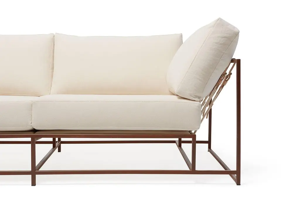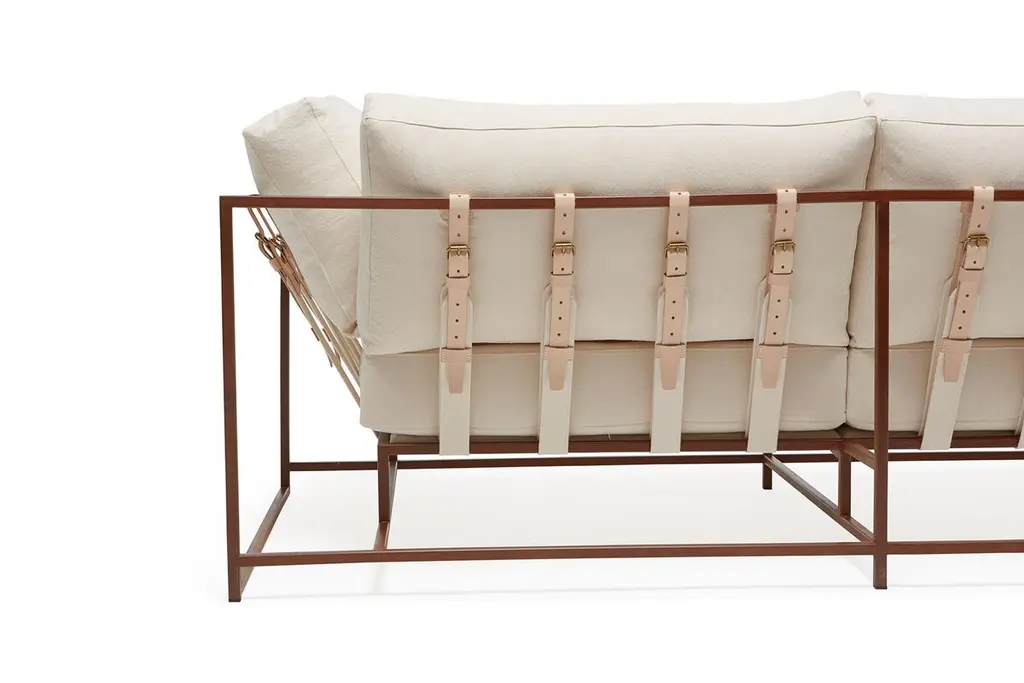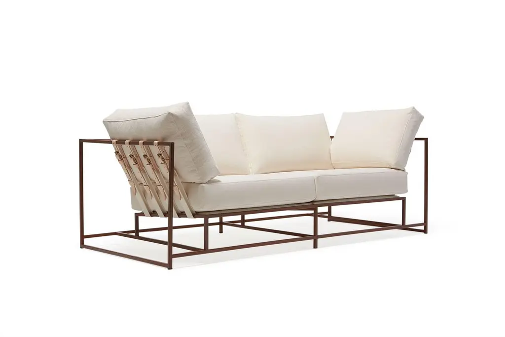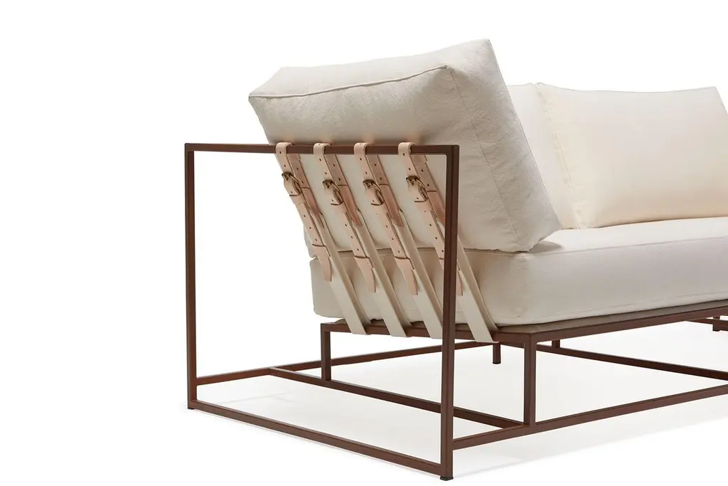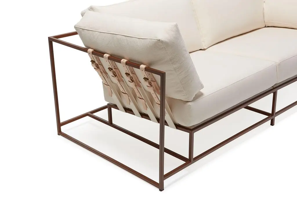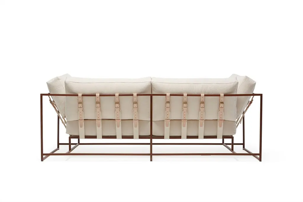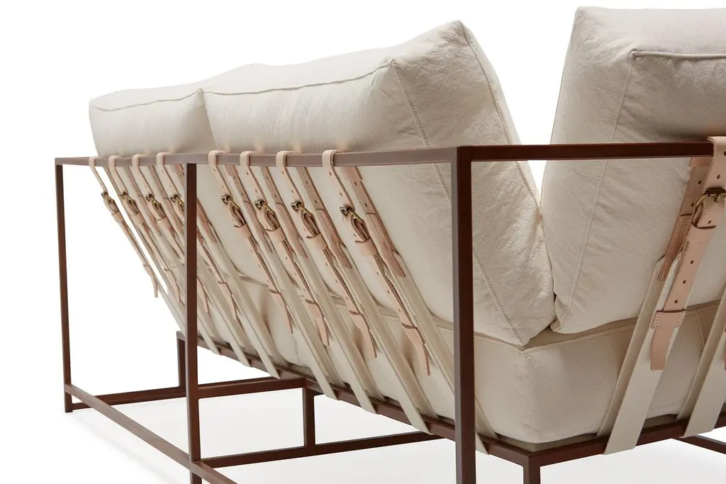 Slightly smaller in size, the two seat sofa is ideal for apartments or smaller spaces requiring a smaller footprint.This variation is upholstered in a natural canvas.. The foam seat cushions have been wrapped in polyfiber, allowing for a soft and comfortable lounge experience. Sitting atop a marbled rust steel frame, the piece has support belts featuring natural cotton webbing, natural veg tan leather, and marbled rust buckles.Every Stephen Kenn piece is made to order through our Los Angeles studio. We create these pieces utilizing a number of small businesses and fabricators in the LA area. We welcome inquiries about custom dimensions or custom material combinations to best fit your space and personal aesthetic.