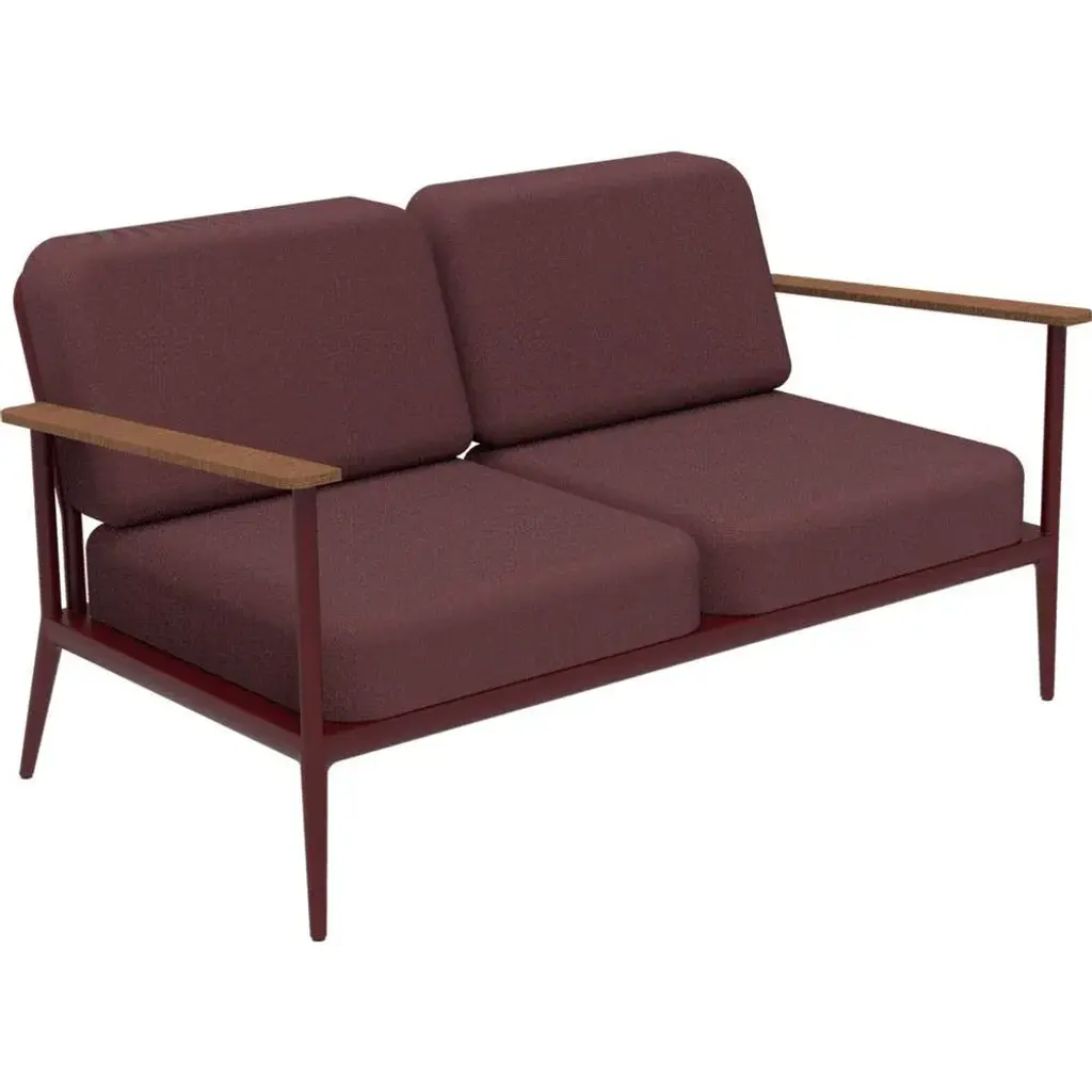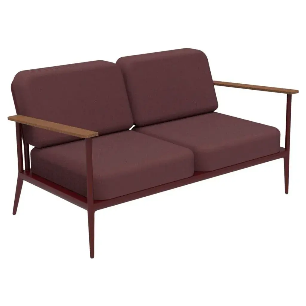 Nature burgundy sofa by mowee. Dimensions: d85 x w151 x h81 cm (seat height 42 cm). Material: aluminum, upholstery and iroko wood. Weight: 32 kg. May be available separately in different colors and finishes. An unmistakable collection for its beauty and robustness. A tribute to the valencian manufacturing tradition as a challenge to innovation, making it sustainable and durable. A fresher version, nature.