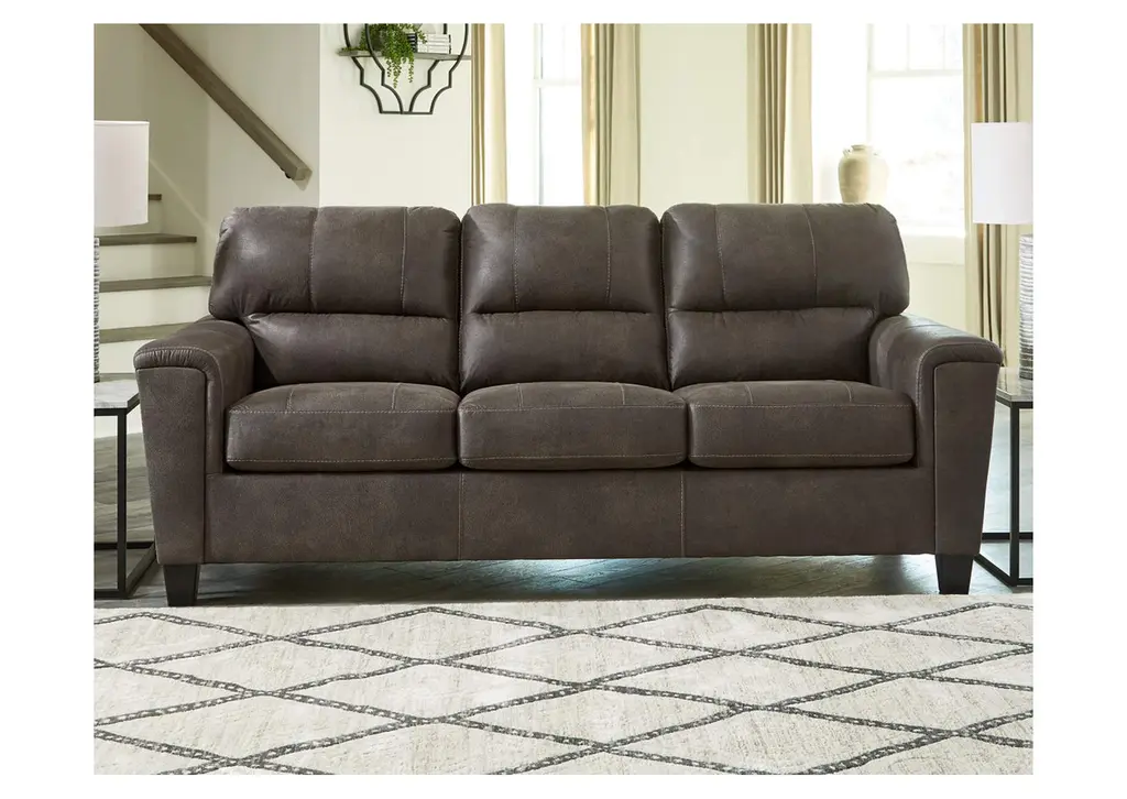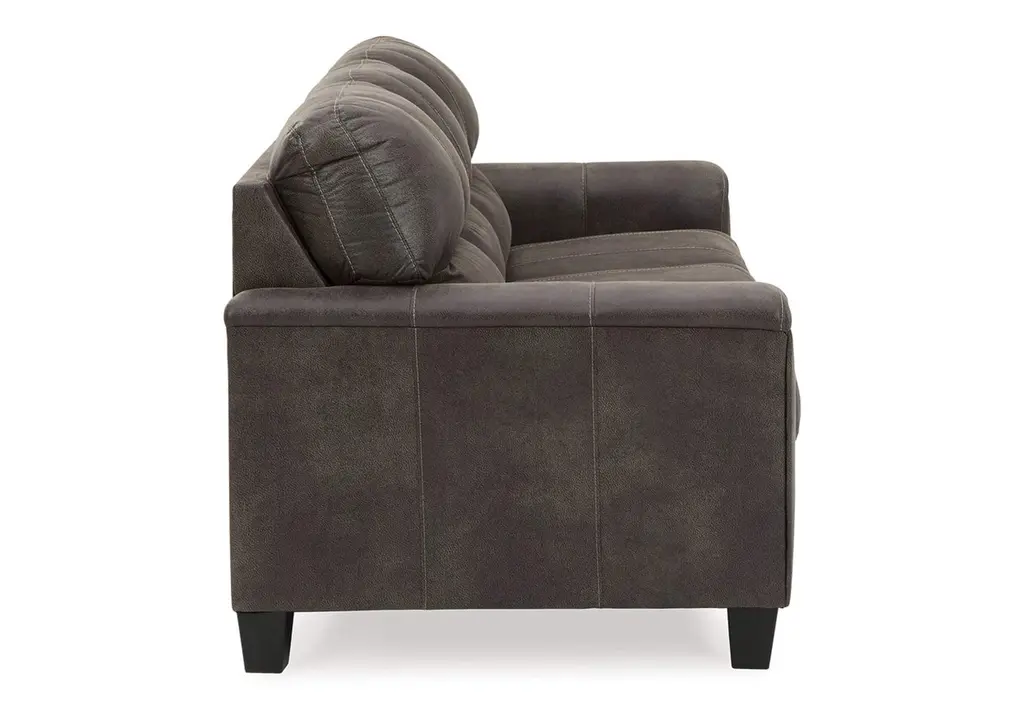 If you love the cool look of leather but long for the warm feel of fabric, you can take comfort in the Navi sofa. Wrapped in a fabulous faux leather with a weathered hue and hint of pebbly texture to resemble the real deal, this decidedly modern sofa proves less is more. Elements include angled side profiling and track armrests wrapped with a layer of pillowy softness for that little something extra. Prominent jumbo stitching and clean-lined divided back styling lend fashion-forward flair. Weight 134.000 lbs. (60.3kgs.)