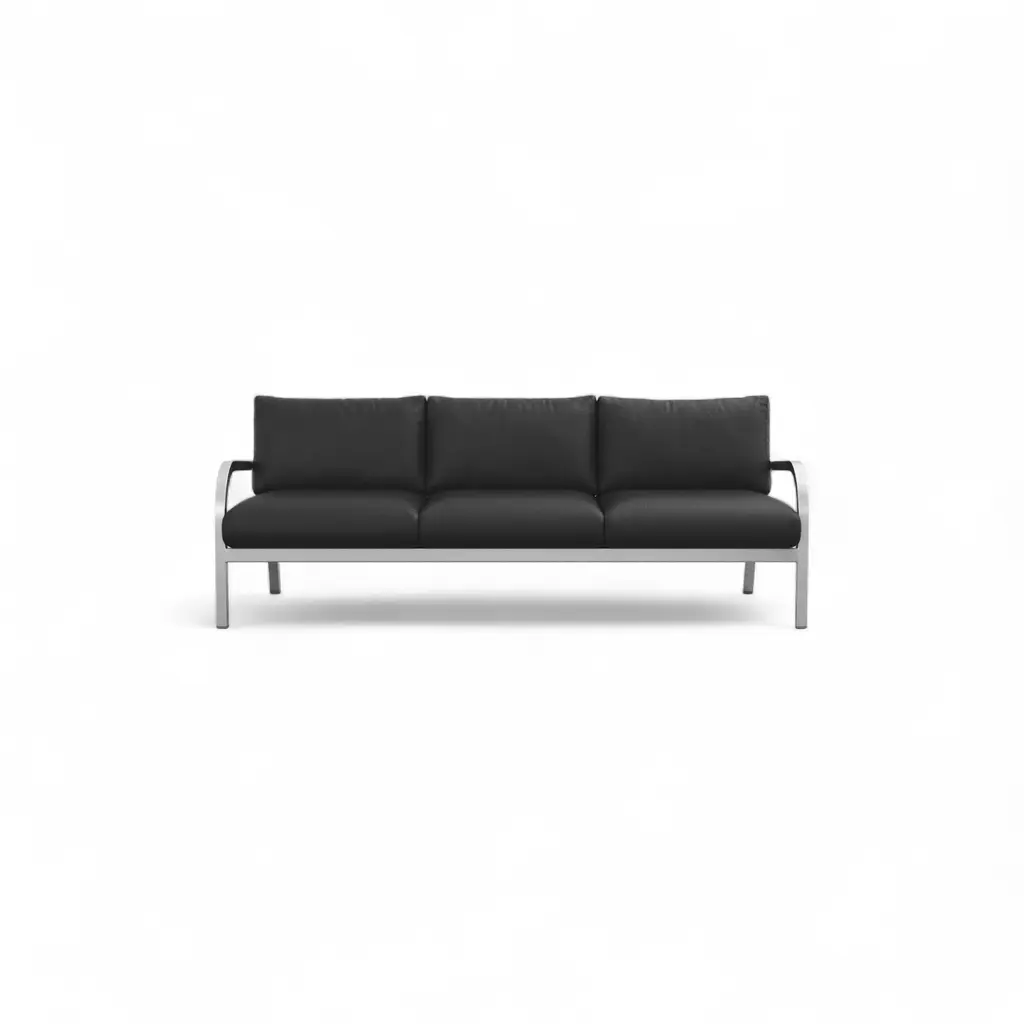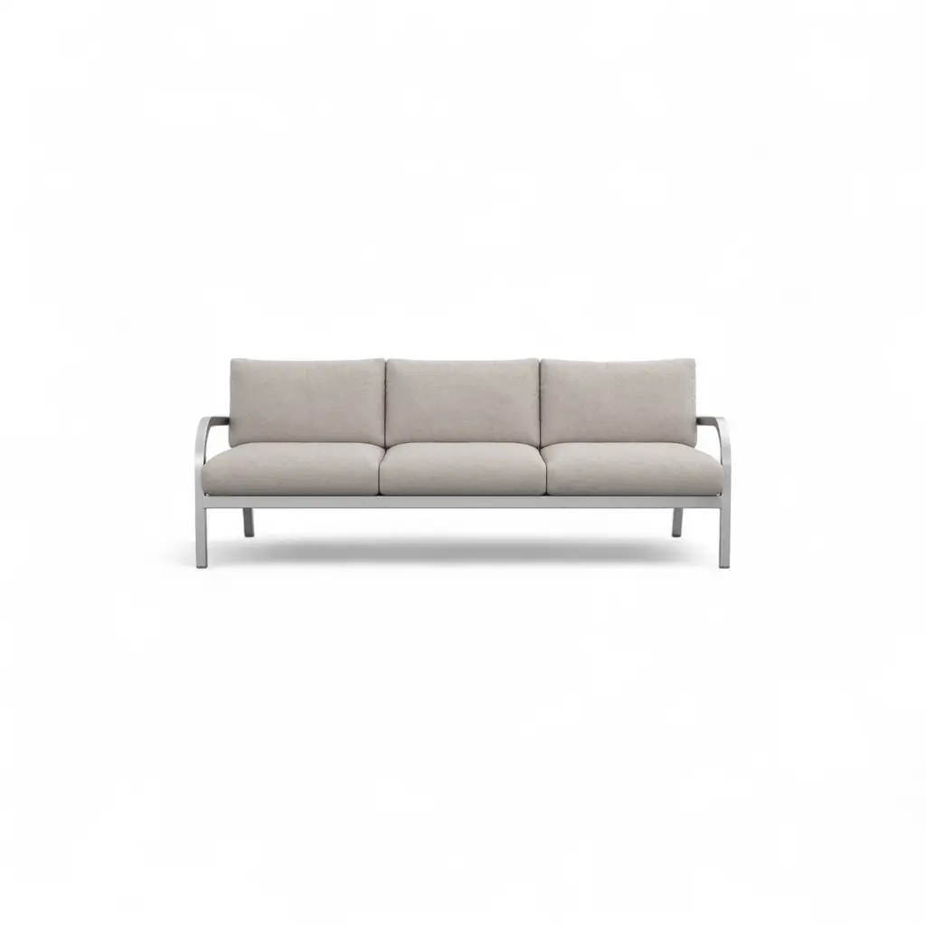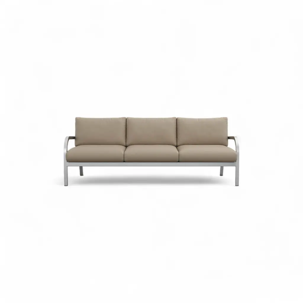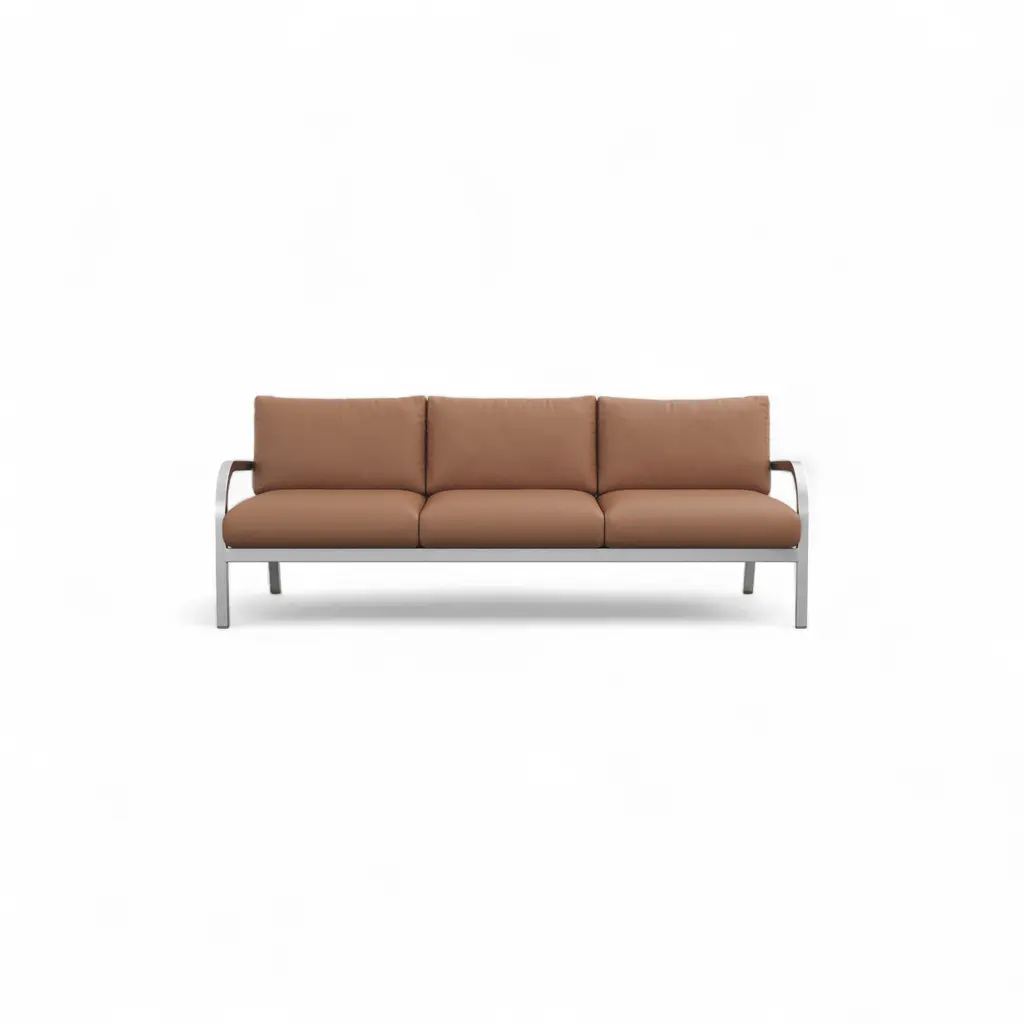 Will fingerprints stand out on brushed aluminum? Not really — the satin grain masks smudges and stands up to moisture anywhere you place it. Here, Morrison’s 2025 update salutes the 1940s original: each frame is TIG-welded from recycled aluminum, kiln-aged for strength, then hand-brushed before a clear powder coat locks in a soft sheen. Despite its airy look, the sofa meets the same 1,500-lb load standard once set for the U.S. Navy. Choose cushions in leather, wool, or outdoor fabric—or send your own material once we okay a swatch. Discreet snaps let you peel everything off for a sudden downpour or end-of-season storage. Park the sofa under a loft skylight, slide it onto a covered veranda, or wheel it poolside for weekend gatherings; the reflective frame echoes nearby colors without ever rusting, and the lifetime warranty follows wherever it goes.