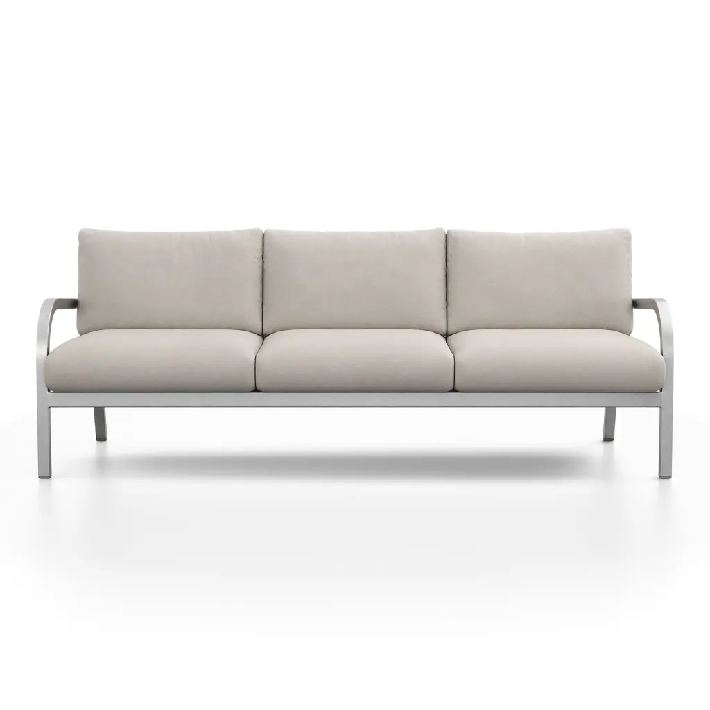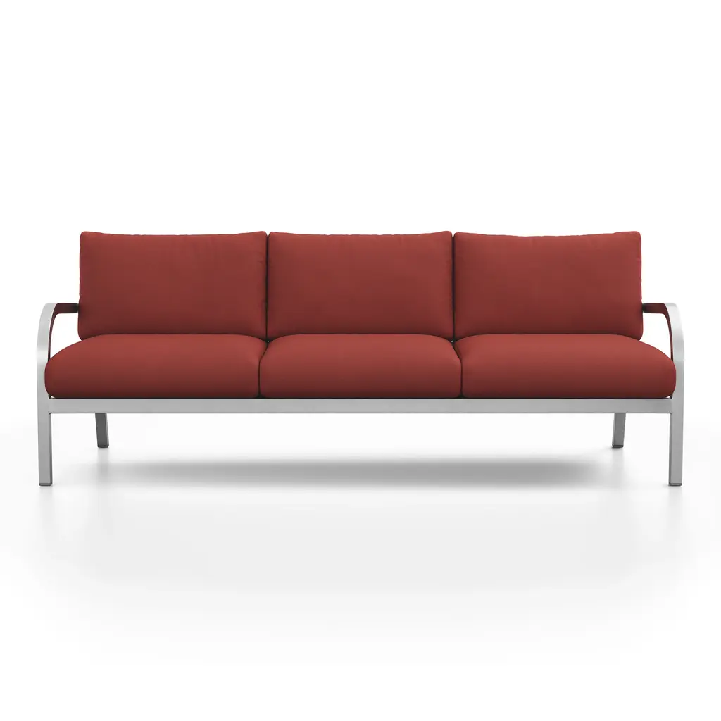 A modern reimagining of Emeco’s iconic 1940s sofa series—originally designed for the U.S. Navy—the Navy Outdoor 3-Seater Sofa delivers the perfect balance of lightness, strength, and timeless style. Its recycled aluminum frame is handcrafted in Hanover, Pennsylvania, using the same meticulous welding and heat-treating process perfected in 1944, resulting in furniture so durable it carries a lifetime warranty, indoors or out. Available in Emeco’s signature hand-brushed finish or a range of powder coat colors, the frame pairs with cushions upholstered in leather, fabric, or outdoor-ready textiles, including Sunbrella® Heritage for all-weather performance. Cushions are removable and secured with snaps and Velcro® for effortless installation, replacement, and seasonal storage. Highlights