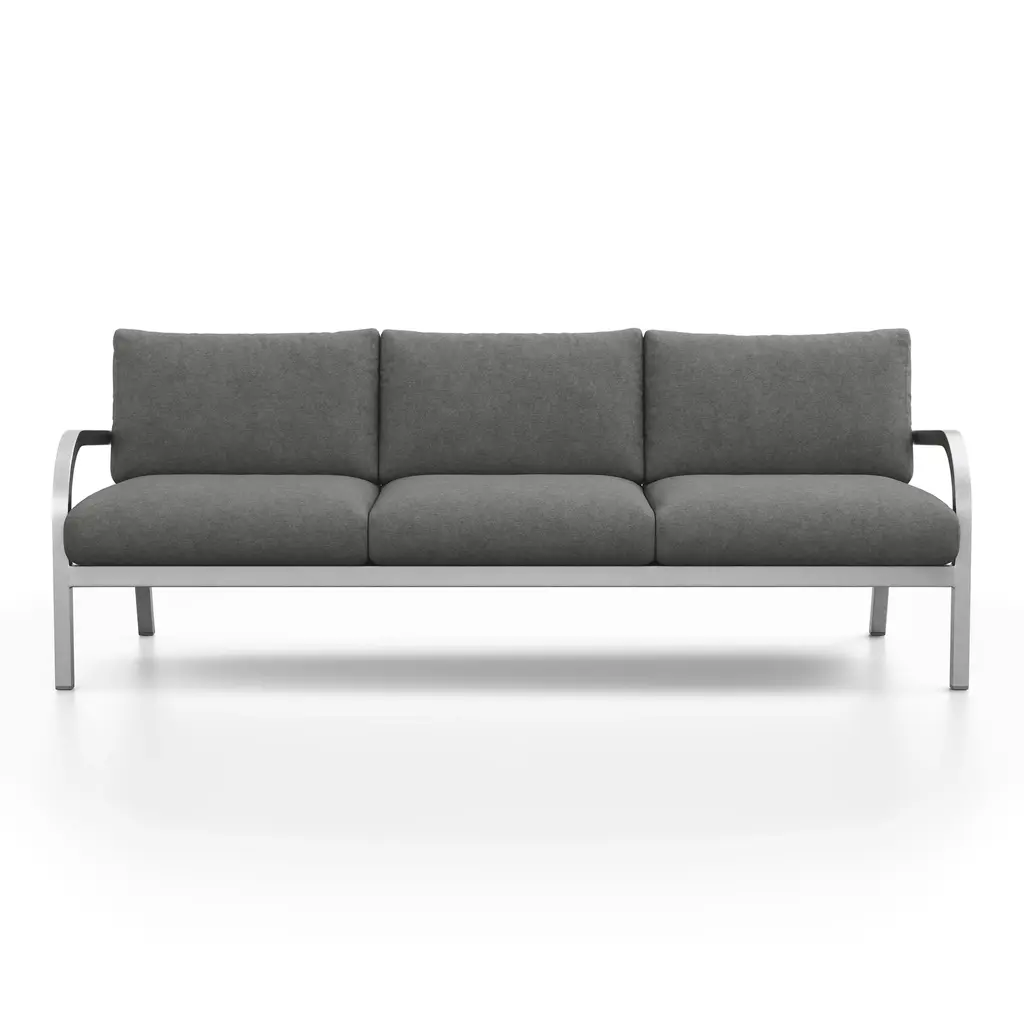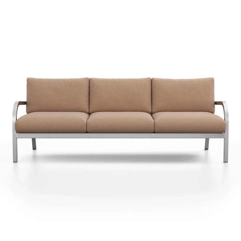A modern reimagining of Emeco’s iconic 1940s sofa series—originally designed for the U.S. Navy—the Navy Outdoor 3-Seater Sofa delivers the perfect balance of lightness, strength, and timeless style. Its recycled aluminum frame is handcrafted in Hanover, Pennsylvania, using the same meticulous welding and heat-treating process perfected in 1944, resulting in furniture so durable it carries a lifetime warranty, indoors or out. Available in Emeco’s signature hand-brushed finish or a range of powder coat colors, the frame pairs with cushions upholstered in leather, fabric, or outdoor-ready textiles, including Sunbrella® Heritage for all-weather performance. Cushions are removable and secured with snaps and Velcro® for effortless installation, replacement, and seasonal storage. Highlights