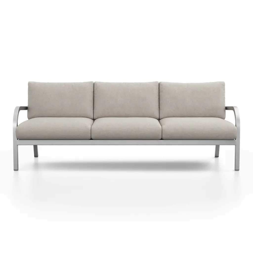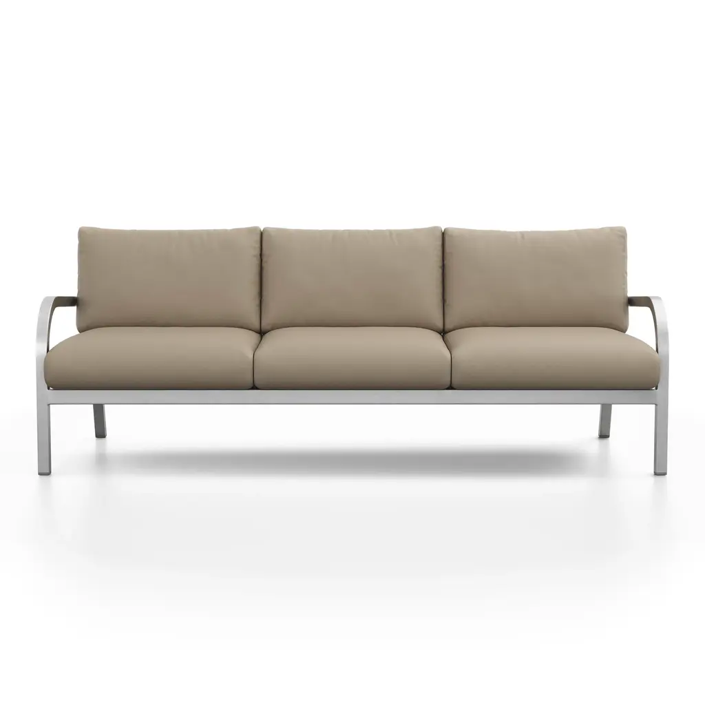 A modern reimagining of Emeco’s iconic 1940s sofa series—originally designed for the U.S. Navy—the Navy Outdoor 3-Seater Sofa delivers the perfect balance of lightness, strength, and timeless style. Its recycled aluminum frame is handcrafted in Hanover, Pennsylvania, using the same meticulous welding and heat-treating process perfected in 1944, resulting in furniture so durable it carries a lifetime warranty, indoors or out. Available in Emeco’s signature hand-brushed finish or a range of powder coat colors, the frame pairs with cushions upholstered in leather, fabric, or outdoor-ready textiles, including Sunbrella® Heritage for all-weather performance. Cushions are removable and secured with snaps and Velcro® for effortless installation, replacement, and seasonal storage. Highlights