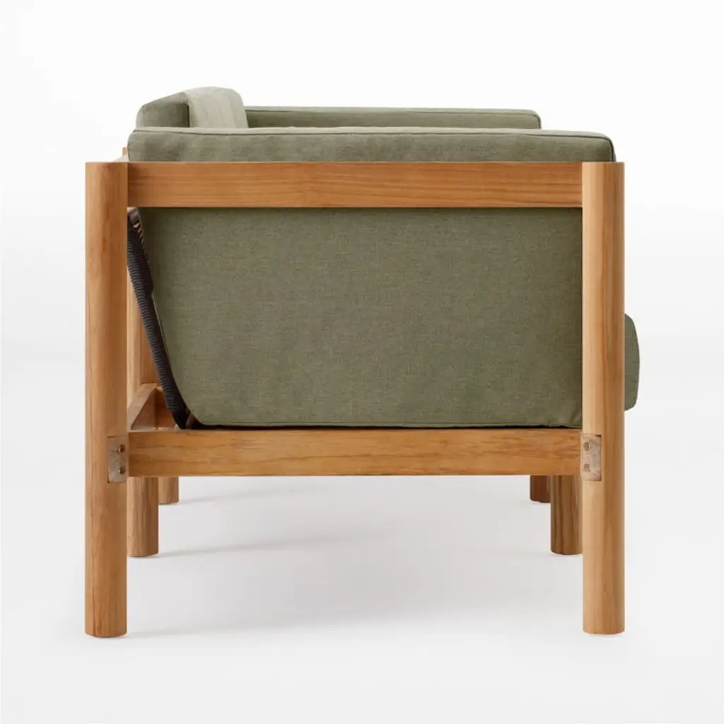 Angled at a slight recline, this deep-seated sofa invites family and friends to kick back and enjoy the great outdoors. Boxy seat and back cushions upholstered in sage green are curl-up comfy, while the sofa's slim side bolsters add a soft layer for draping arms. Natural teak shapes the chunky, rounded frame complemented by a hand-stretched polyester rope back. Offering living-room looks with surprising durability, the outdoor sofa withstands the elements in weather-resistant teak and fast-drying foam cushions.Based in Phoenix, Neighbor crafts beautiful, durable furniture for outdoor living with premium materials such as Sunbrella fabrics and FSC-certified teak. We're thrilled to partner with Neighbor in bringing you Haven, one of the company's first collections designed to build connection and expand livable square footage to outdoor spaces.By choosing FSC ®-certified furniture, you are supporting responsible management of the world's forests.