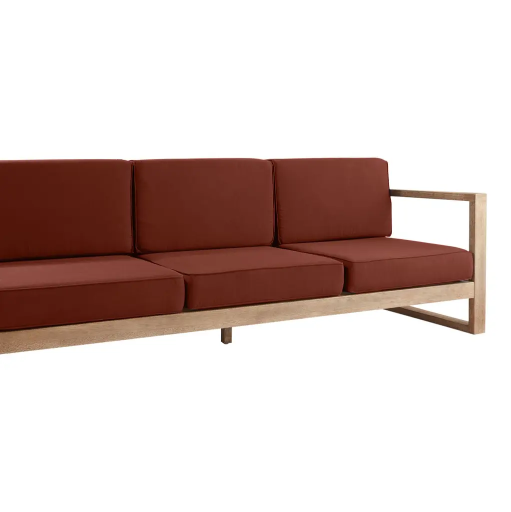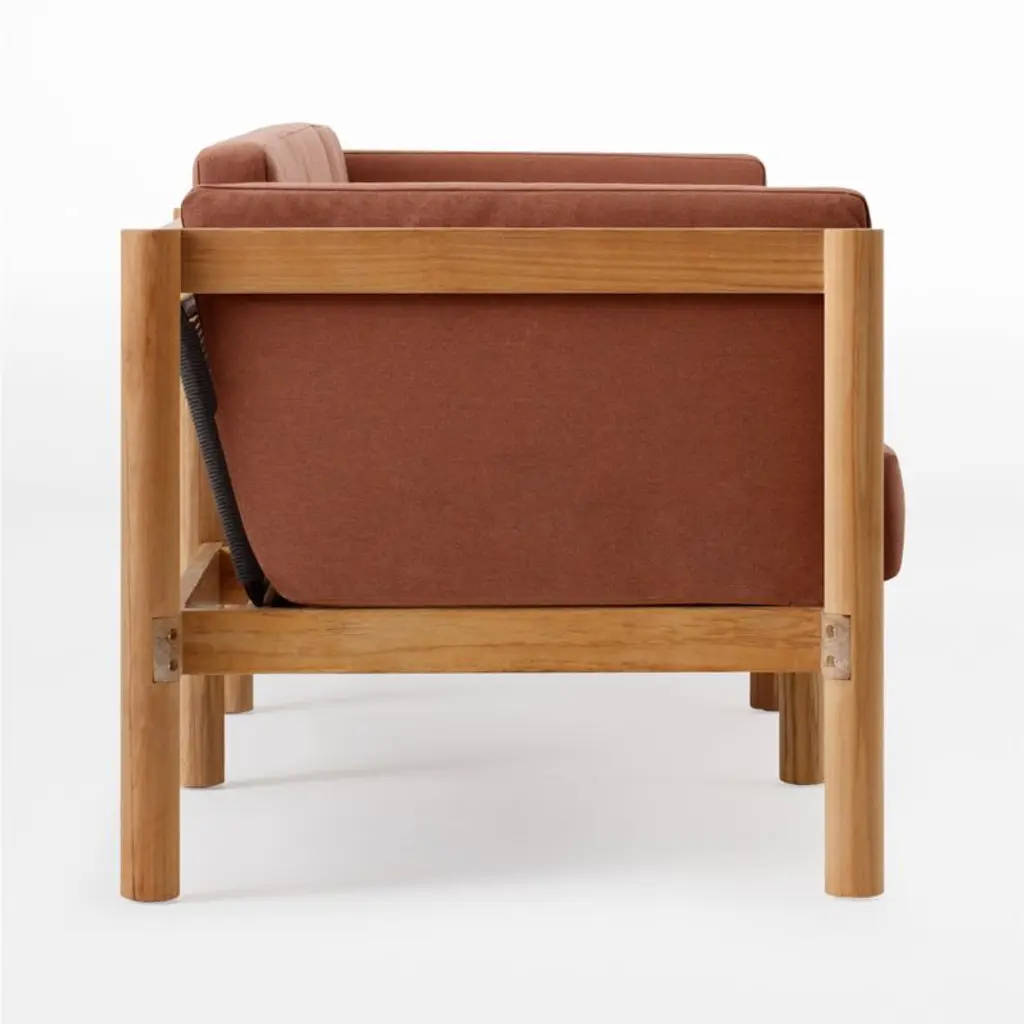 Angled at a slight recline, this deep-seated sofa invites family and friends to kick back and enjoy the great outdoors. Boxy seat and back cushions upholstered in soft rust are curl-up comfy, while the sofa's slim side bolsters add a soft layer for draping arms. Natural teak shapes the chunky, rounded frame complemented by a hand-stretched polyester rope back. Offering living-room looks with surprising durability, the outdoor sofa withstands the elements in weather-resistant teak and fast-drying foam cushions.Based in Phoenix, Neighbor crafts beautiful, durable furniture for outdoor living with premium materials such as Sunbrella fabrics and FSC-certified teak. We're thrilled to partner with Neighbor in bringing you Haven, one of the company's first collections designed to build connection and expand livable square footage to outdoor spaces.By choosing FSC ®-certified furniture, you are supporting responsible management of the world's forests.