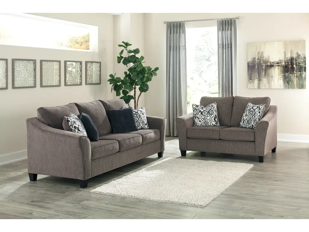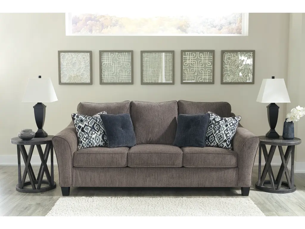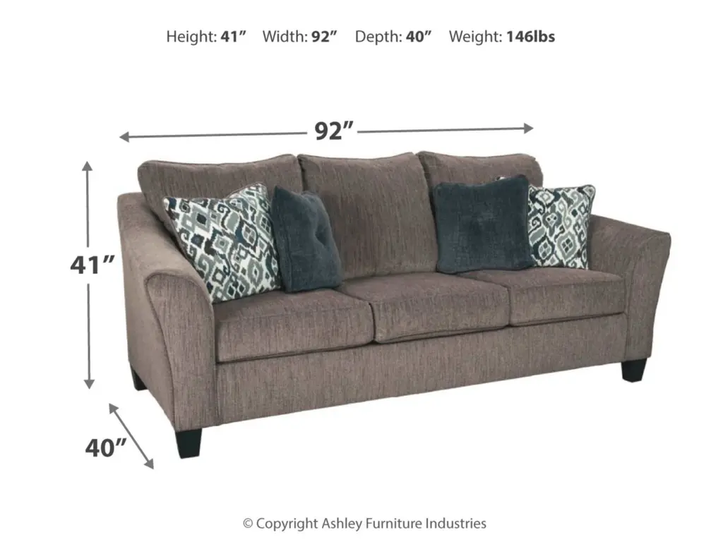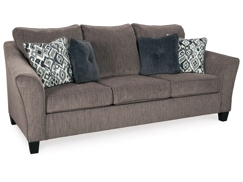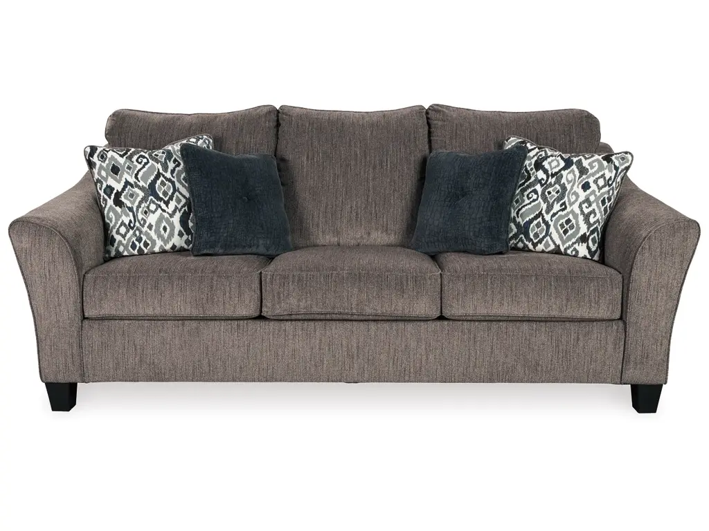 The Nemoli sofa sets the scene for a modern space full of casual flair. Its textured chenille with solid microfiber upholstery provides a luxuriously soft feel that’s inviting. Gently flared arms and plush seat cushions welcome comfort and relaxation. The on-trend slate-colored upholstery offers a perfect background for the four decorative pillows to pop with beauty.