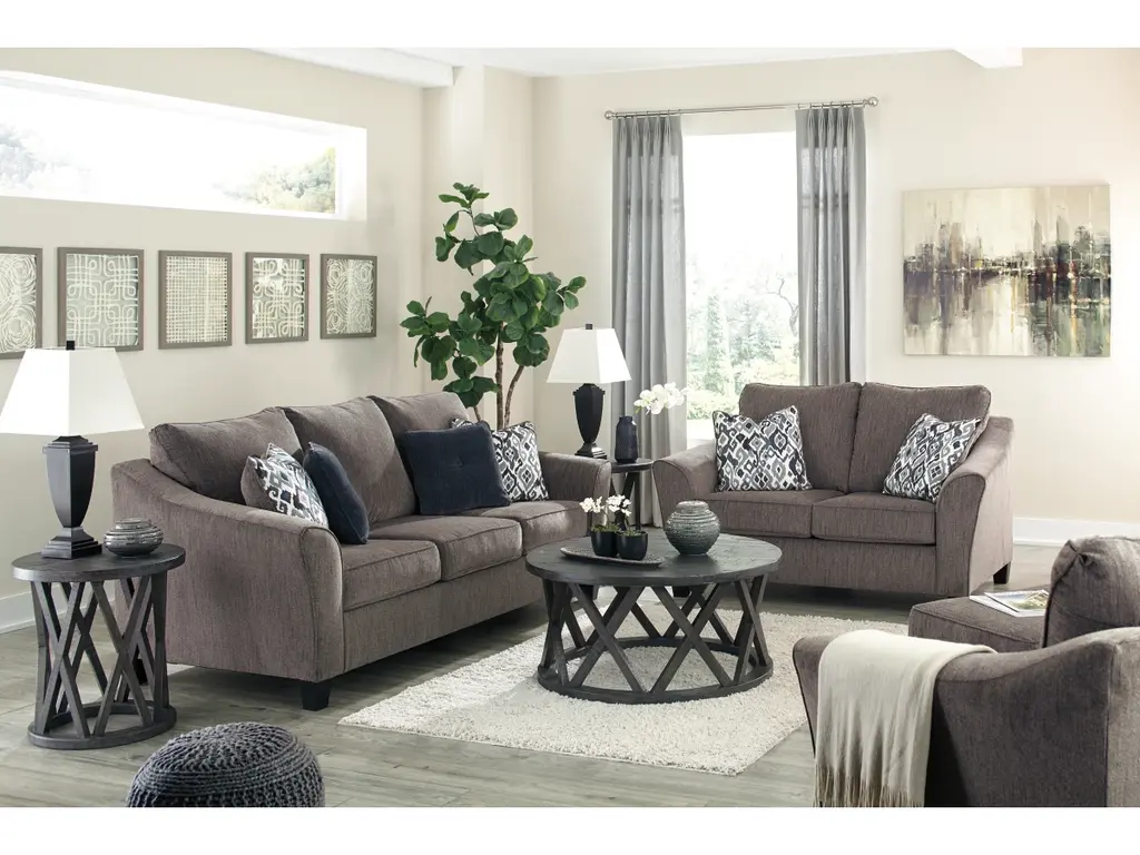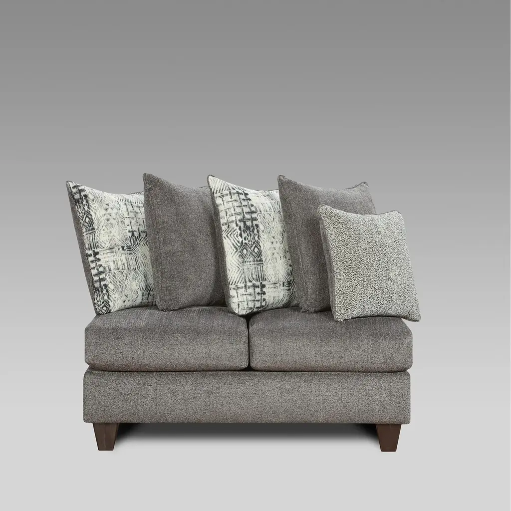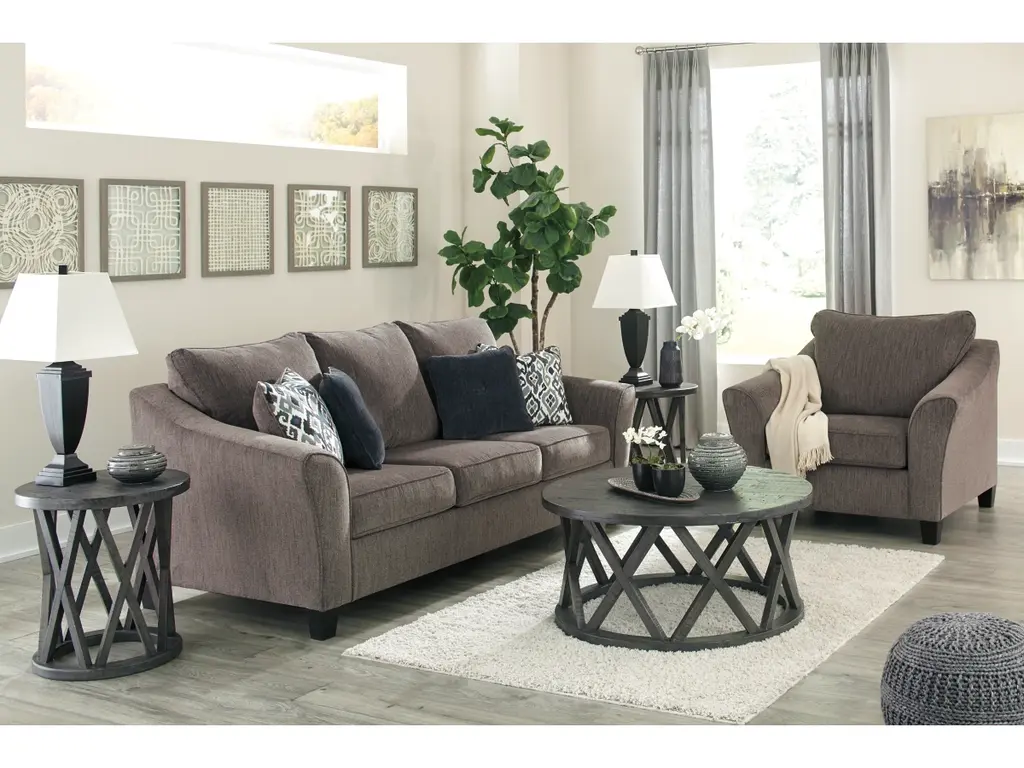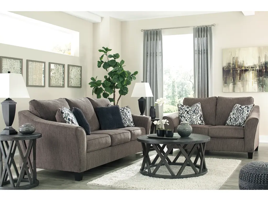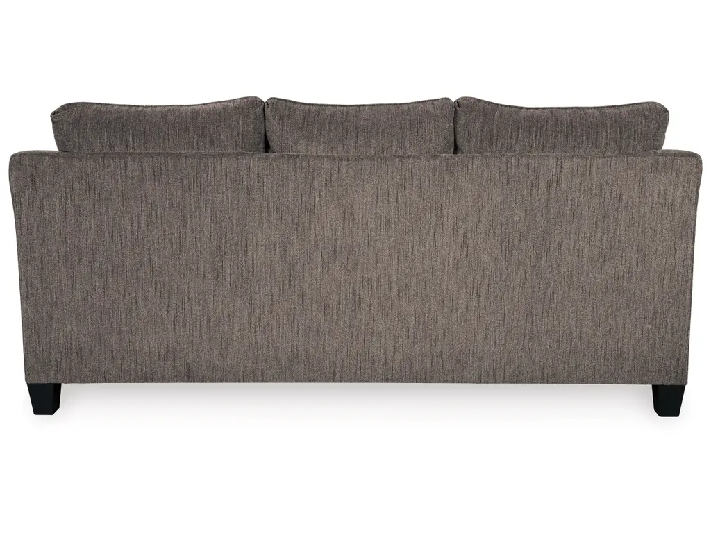 The Nemoli sofa sets the scene for a modern space full of casual flair. Its textured chenille with solid microfiber upholstery provides a luxuriously soft feel that’s inviting. Gently flared arms and plush seat cushions welcome comfort and relaxation. The on-trend slate-colored upholstery offers a perfect background for the four decorative pillows to pop with beauty.