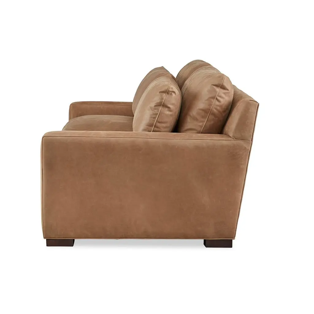 Modern leather upholstered sofa with bold modern lines and raised on bold square block feet. Long loose pillow backs with two long comfort down seat cushions.Completely Made in USA, with traditional 8-way hand-tied construction and US grown - toxin-free - kiln-dried solid Maple frames.Dimensions: Outside: 96" W x 45" D x 35" HInside: 84" W x 21" DSeat: 19" HArms: 24" HSeat cushion - Comfort DownBack cushion - loose pillow, all fiberPriced as shown with luxury leather. (please note that leathers shown may no longer be available) COM and alternative fabrics or leathers are also available. Please contact us for information and further details.Matching armchairs are also available.