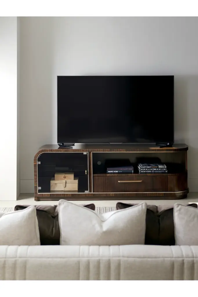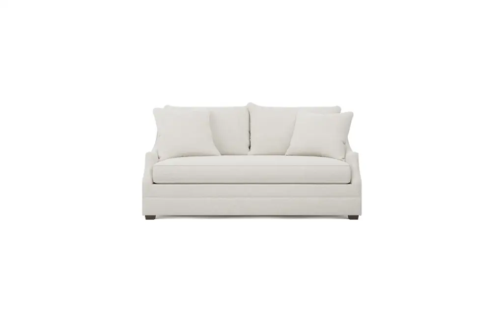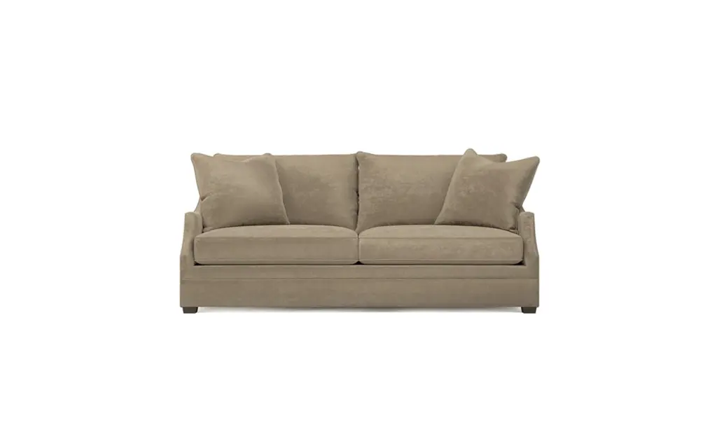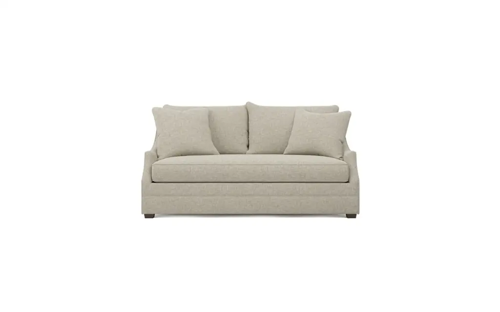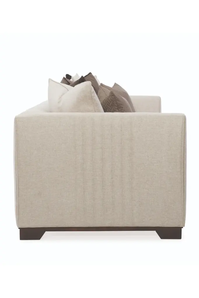 This sofa with squared corners is impeccably tailored. Fully encased in soft brushed neutral linen-look fabric, the back and arms have a vertical stitch detail and a slender blanket wrap feature that envelopes the tapered track arm design. The bench seat adds to its streamlined appeal. Three matching throw pillows are paired with two velvet pillows in a rich espresso and two contrasting pillows showcasing an enlarged herringbone pattern in a lighter espresso shade. Perched on low platform feet finished in Bourbon Glaze, this is a bespoke piece for contemporary living.