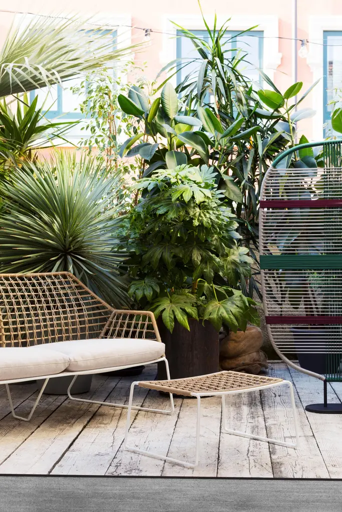 The New York outdoor collection expands with a line of exclusive woven seating made entirely by hand. New York Sofa Soleil is the product of careful research into materials and the desire to maintain the unique original design. Woven nautical cords of different colors softly cover the painted metal rod structure. The ergonomic cushion is covered in a quick-drying, non-absorbent technical fabric, and its superior performance in the Martindale test guarantees abrasion resistance as well as hygienic breathability. In 2020 the collection adds a new element: the Lounge Armchair. The New York Soleil embodies outdoor living with a casual style and colorful charm. It is available in different blends and solid colors. The collection includes a sofa, an armchair, a pouf, a chair with or without armrests and a stool. Fully removable covers.Born in 1953 he left formal education and began, almost by chance, his experience in the field of the padded furniture. Fascinated by the world that surrounded him, he eagerly devoted himself to researching building forms and techniques which have borne fruit for the companies in which he worked. In 1991 he opened his studio as an independent designer and in 1993 he came across Saba Italia. New challenges and new incentives lead to the creation of the “nomad sofa”: Taos, Ananta, Limes, Nesting, Pixel. Creations that were born from reflection of new desires that encourage us to live in a less formal way, equipped with systems that enable change with simple gestures, by playing with shapes.Structure: In 12 mm wire drawn covered with interweaving of polyester tops diameter 4 mm. Painting with cataphoresis primer.Padding: The seat and back cushions are filled with a special 30 water-draining polyurethane, and covered in polyester-backed fiber 300gr/sqm on polyester lining 100%.Additional information:Material: Polyurethane, upholstery, polyester ropesFrame finish: HempLeg finish: Painted whiteUpholstery: Vip, A2 - col.07Dimensions: 139 W x 79 D x 70 H cmSeat height: 42 cmAvailable in other frame finish options: Black, grey, blue, orangeAvailable in other leg finish options: BlackAvailable in other upholstery options: Extra, lusso, special, royal