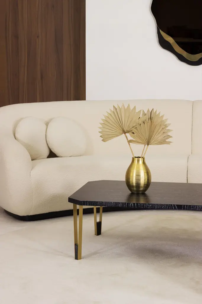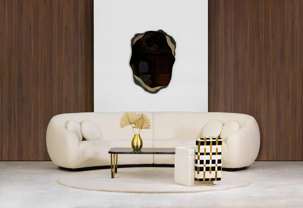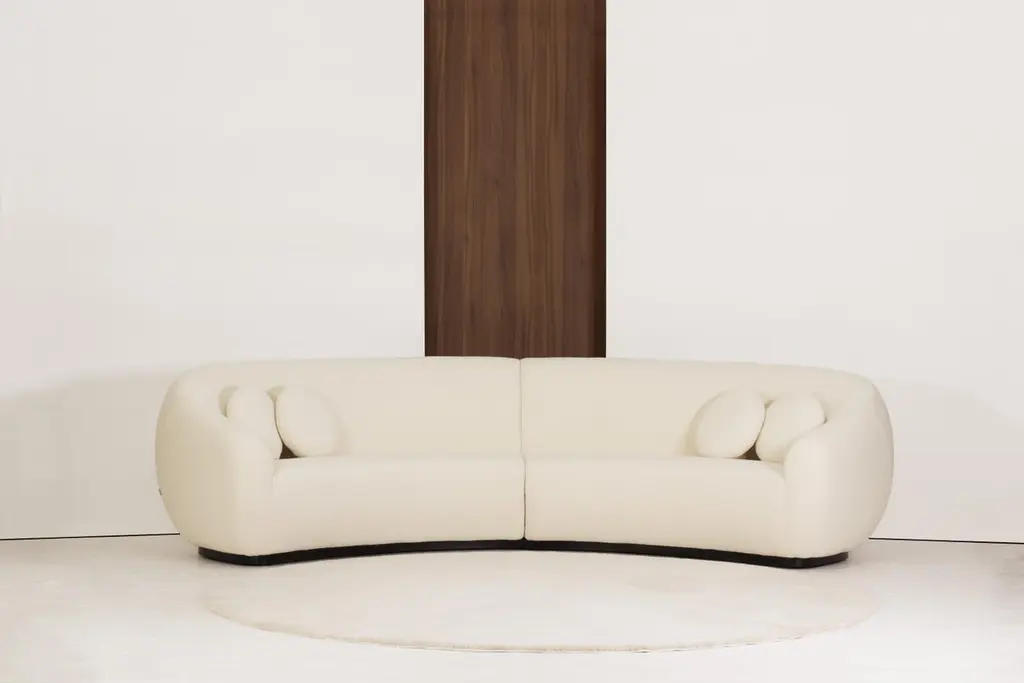 The Niemeyer II round sofa is named after the Brazilian Architect Oscar Niemeyer whose Architecture was spread like sculptural poetry in the History of humankind.The rounded lines of the sofa are influenced by the remarkable ‘Casa das Canoas’ designed by Niemeyer in 1951. The flat roof offers its flowing forms to the round seat. The backward movement of the curve that frames a large granite boulder is recreated by the location of the seams in a meticulous upholstered work that flows all around the arms of the sofa.The sophisticated round sofa is a statement piece with serene beauty designed for bold interior living spaces. Product detailsUpholstery: InsidherLand Lama Ref.1Base: dark oak finished in matte varnish.COM: 20m 787.40in. (Standard width 140cm 55in.)Product optionsUpholstery: InsidherLand fabrics or client fabric.Base: other woods or any Ral Classic color finished in matte, half gloss or high gloss varnish.Weight120Kg 264.6 lbsMade to order. Custom sizes and other finishes are available under request.Designed by Joana Santos Barbosa, 2021. Handmade in Portugal.