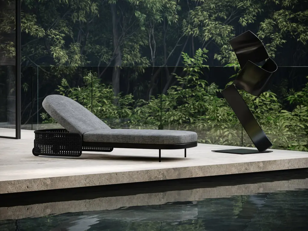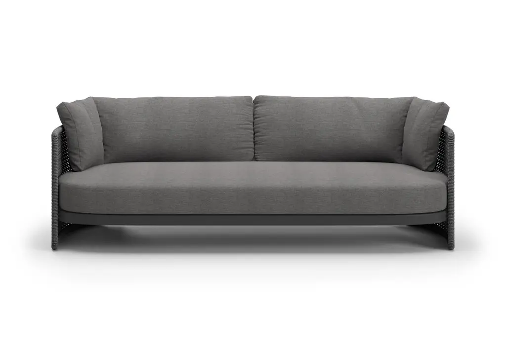 Nightfall Miura Seater Sofa 3 by SNOCDimensions: W 230 x D 82.5 x H 80 cm.Materials: Acrylic Rope, Aluminium. The Miura outdoor collection is an invitation to comfort and elegance. The softly shaped, voluminous seats catch the eye with their woven shell, a distinctive feature achieved through the use of cords of different diameters. This weaving not only gives a unique look but also adds an appealing tactile sensation.Miura offers a diverse range of elements for outdoor environments, guaranteeing solutions for different needs. From lounge elements, which invite relaxation and comfort, to dining sets that combine style and functionality for convivial gatherings, up to sun loungers, each piece is designed to give character to the surrounding environment. The collection comes in two color variations: one bright and warm, suitable for environments surrounded by nature, and the other darker and more formal, perfect for creating a refined and sophisticated atmosphere.SnocSince their foundation in 2004, SNOC’s history has been interwoven with that of international design. Each chapter written with care, each product reflecting its passion. The company understands that a real story exists behind each object and behind that story, a real person desiring something more. Their ever-developing methodology focuses on defining the core of a brand and utilizing those characteristics to help nurture its soul, aiding in forging real connections. This approach , results in their unique “work in progress” style: original, versatile solutions that in their signature blend of sound, vision and design best-suit every environment and situation, arousing a range of emotions on a daily basis as well as standing the test of time.Driven by functional research, an inclusive project and product culture, and deep care for the environment, we exist as the timeless yet present essence of outdoor furniture design elevating private and public space a like with thoughtfully presented, endlessly adaptive creations.
