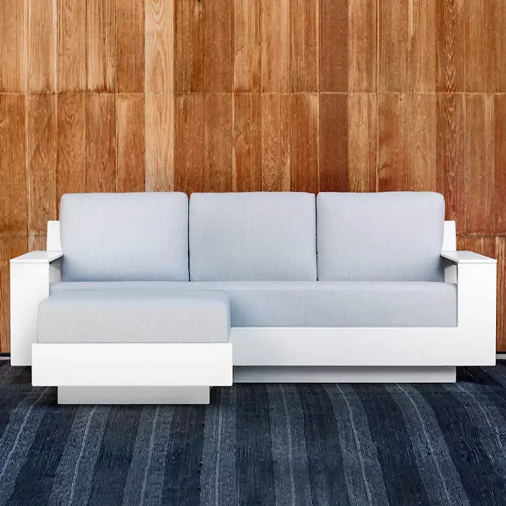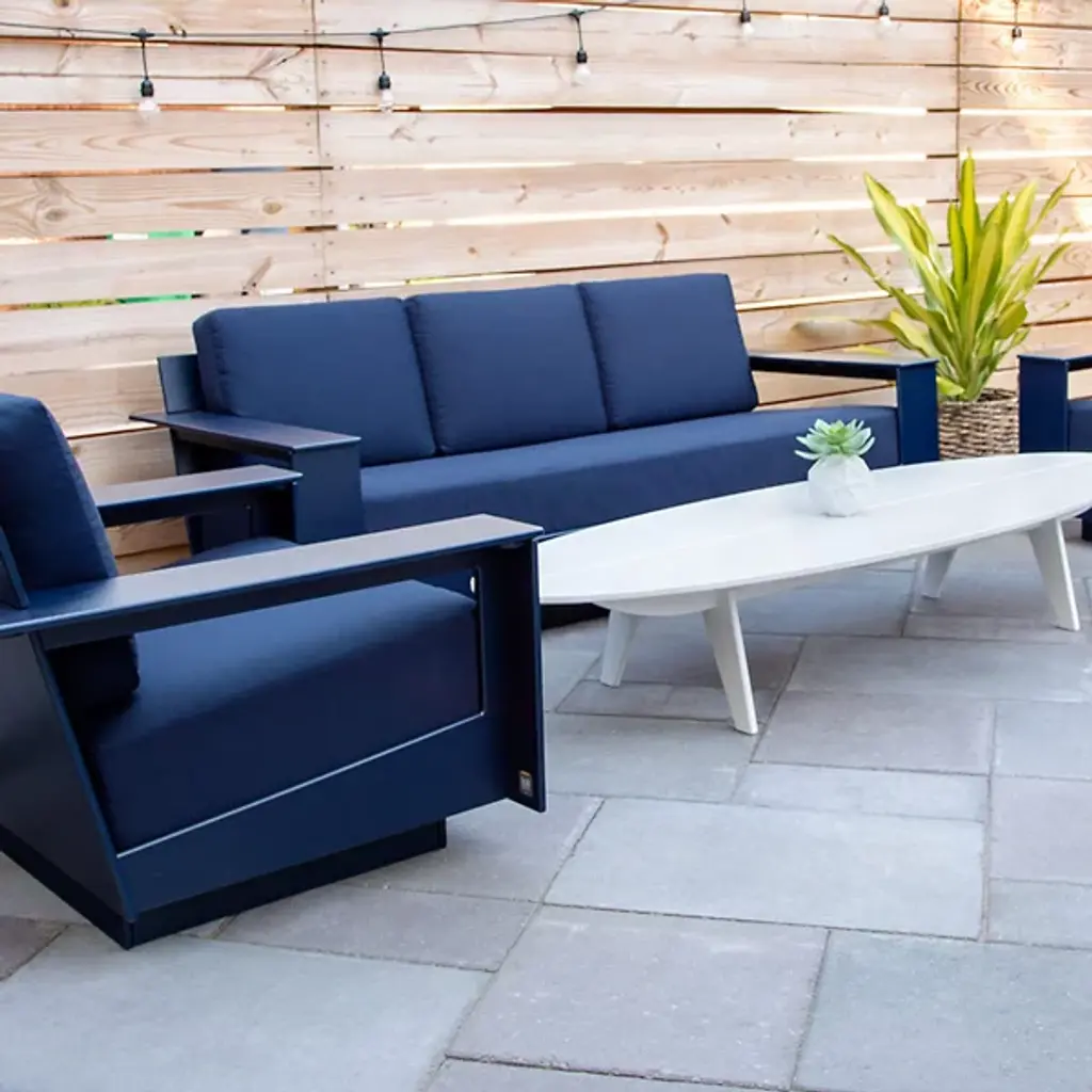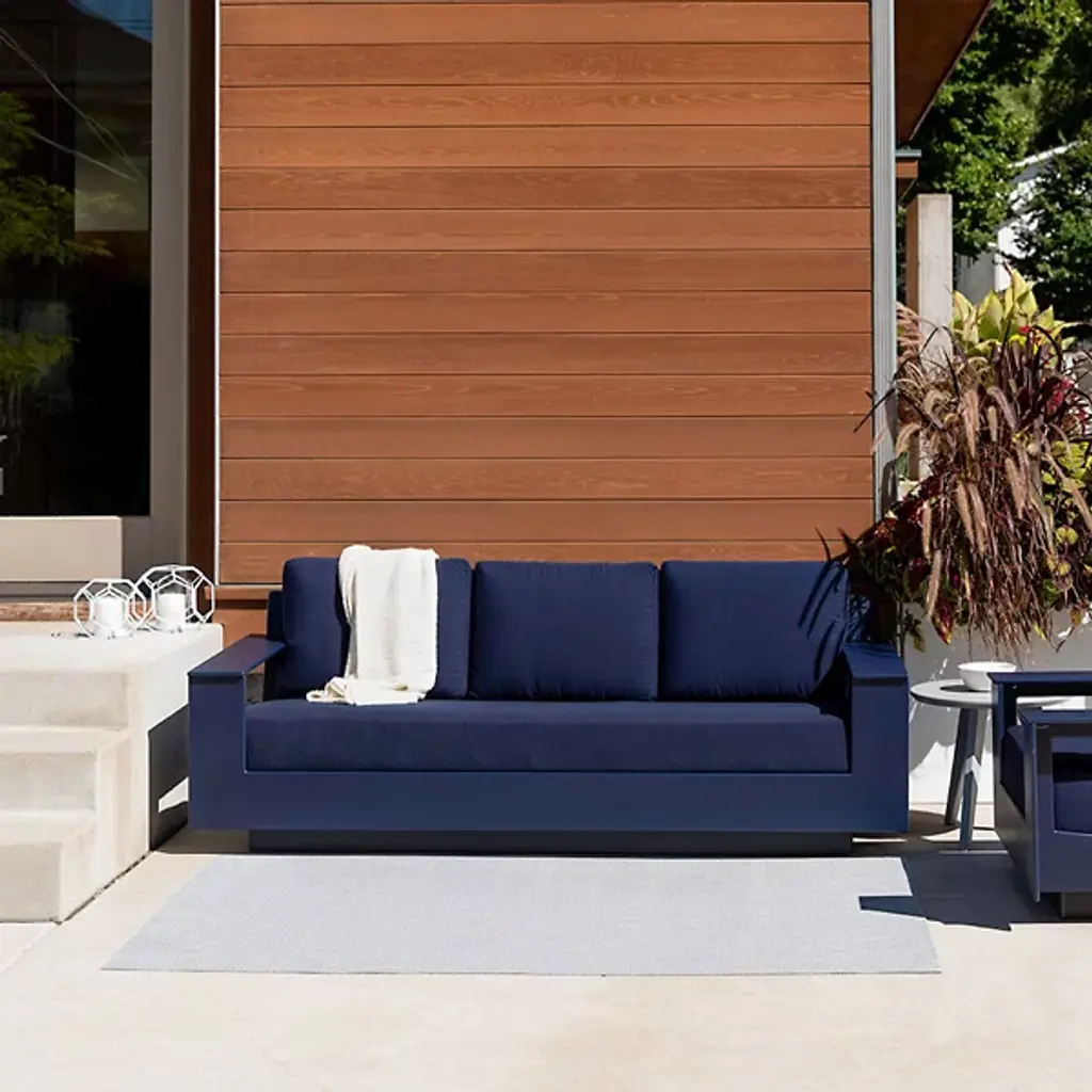Bring the feeling of lakeside relaxation to your modern exteriors with the Nisswa Outdoor Sofa by Loll Designs. Named after the popular lake area in northern-central Minnesota, this sleek sofa is first defined by its highly sustainable and environmentally-conscious composition. Its modular frame is made of recycled milk jugs and non-recycled HDPE, with wide arms and an open design offering a clean and modern look. Durable Sunbrella fabric upholstery protects its cushions, offering a lasting, fade-resistant, and weather-repelling seat.
