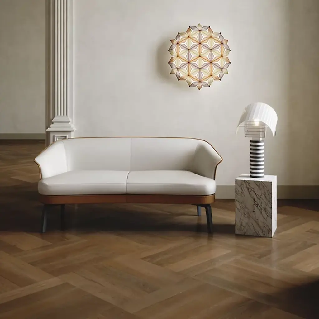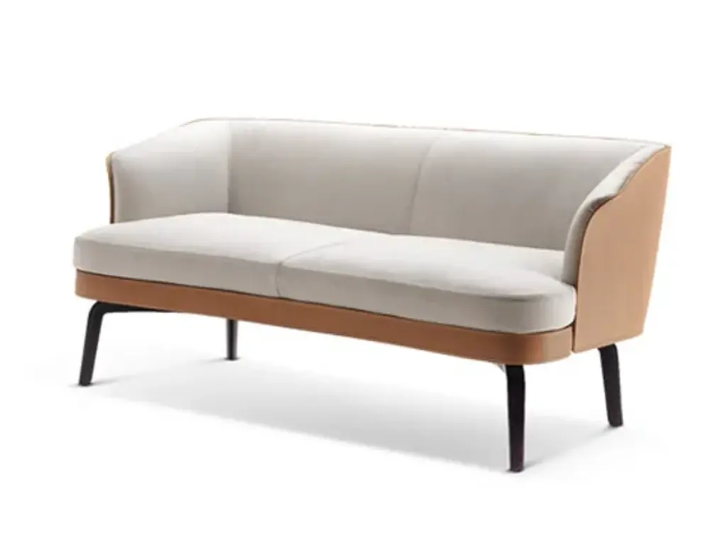 Elegant and expressively open, the Nivola Sofa from Poltrona Frau infuses its environment with a lasting feminine allure. A Roberto Lazzeroni design that focuses on simple yet precise lines, its expressive design is enhanced by rich natural materials. The result is a memorable retro-modern construction ascending from solid ash wood legs with rich surface detail; it supports a leather-sheathed structure above, with plush cushions and a padded back of polyurethane foam accompanied by goose down and creating a soft, soothing interior structure that contrasts well with the rich leather exterior, and the fine stitching on full display.