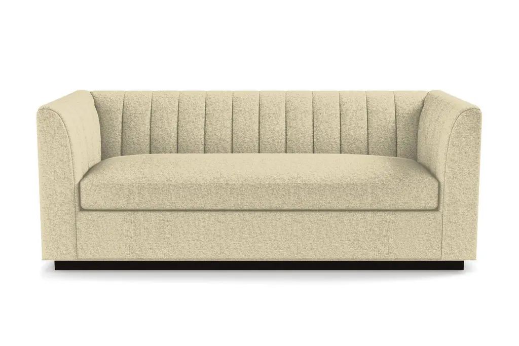 This sleek, and oversized sofa has a tight channel-tufted back that has an art deco flair with a modern silhouette. With high arms and a high back this chair envelopes you like an old school restaurant booth but the deep seat has you staying for dessert.