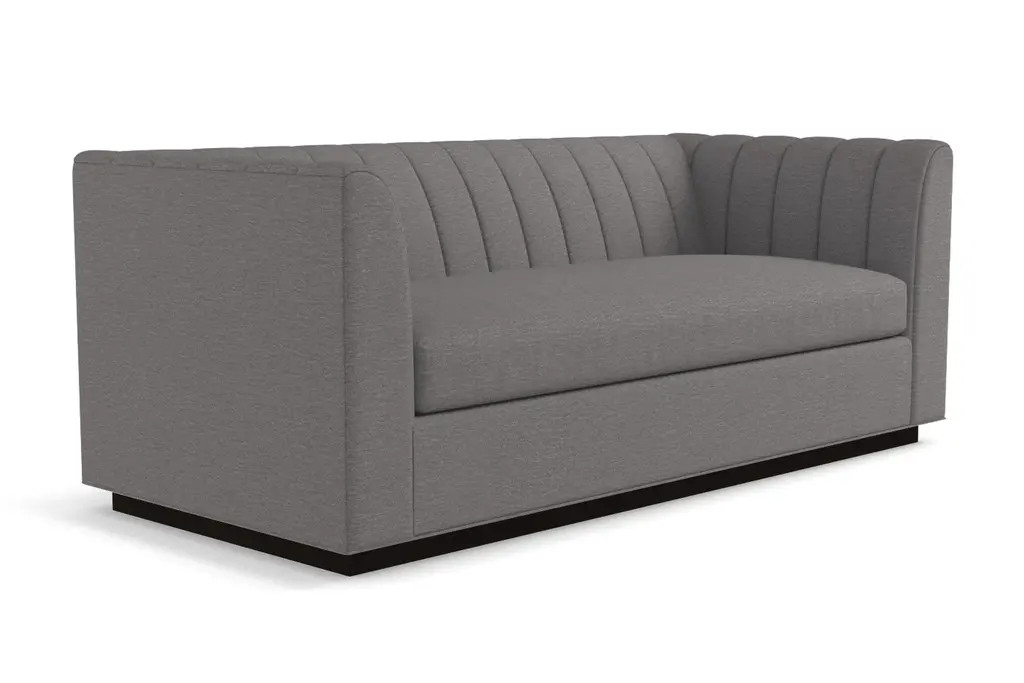 This sleek, and oversized sofa has a tight channel-tufted back that has an art deco flair with a modern silhouette. With high arms and a high back this chair envelopes you like an old school restaurant booth but the deep seat has you staying for dessert.