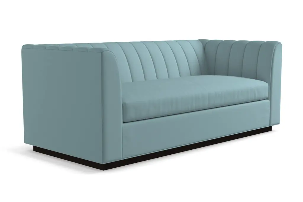 This sleek, and oversized sofa has a tight channel-tufted back that has an art deco flair with a modern silhouette. With high arms and a high back this chair envelopes you like an old school restaurant booth but the deep seat has you staying for dessert.