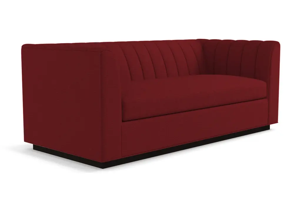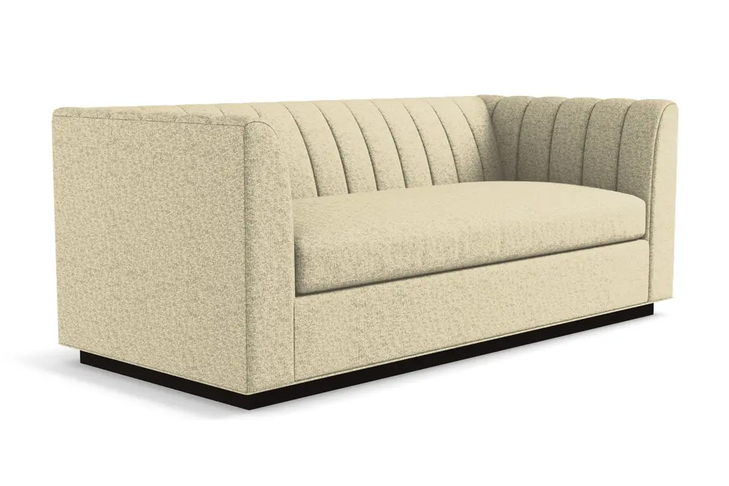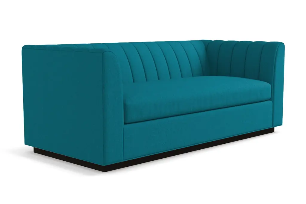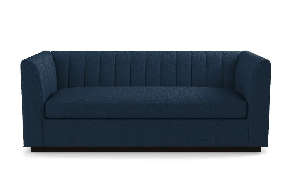 This sleek, and oversized sofa has a tight channel-tufted back that has an art deco flair with a modern silhouette. With high arms and a high back this chair envelopes you like an old school restaurant booth but the deep seat has you staying for dessert.