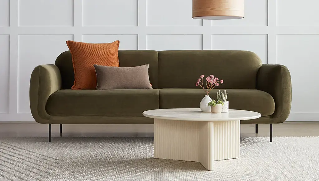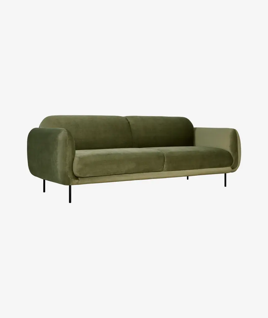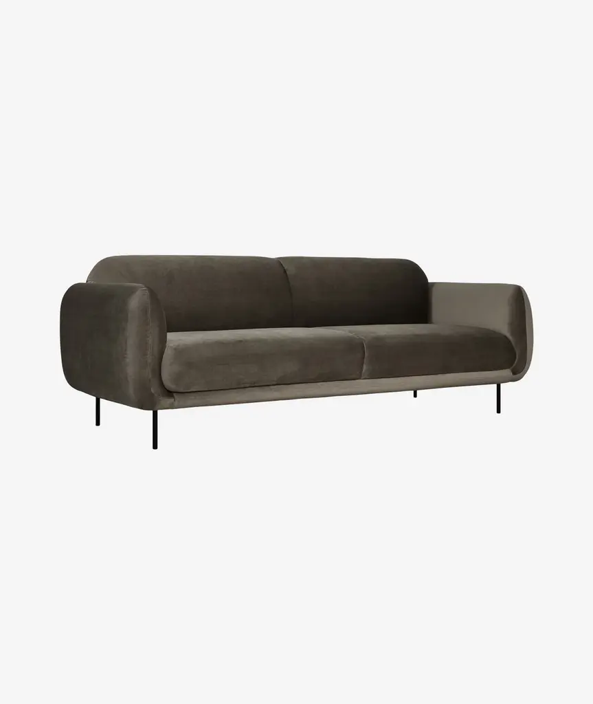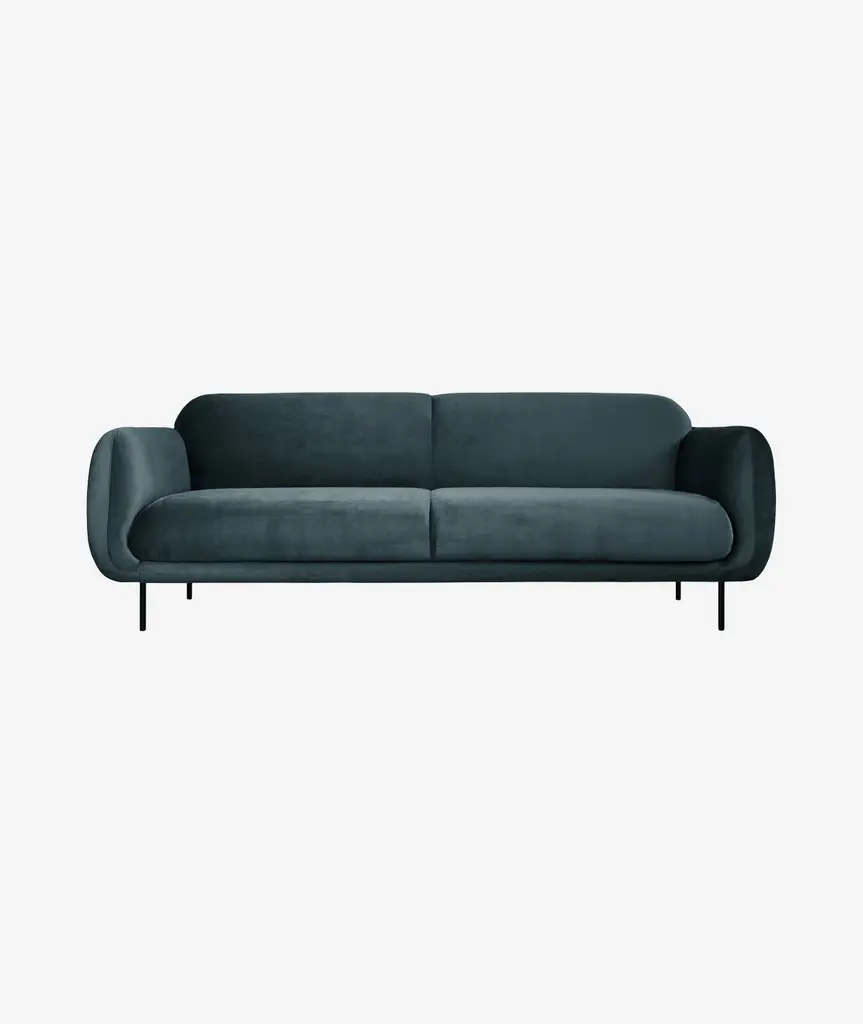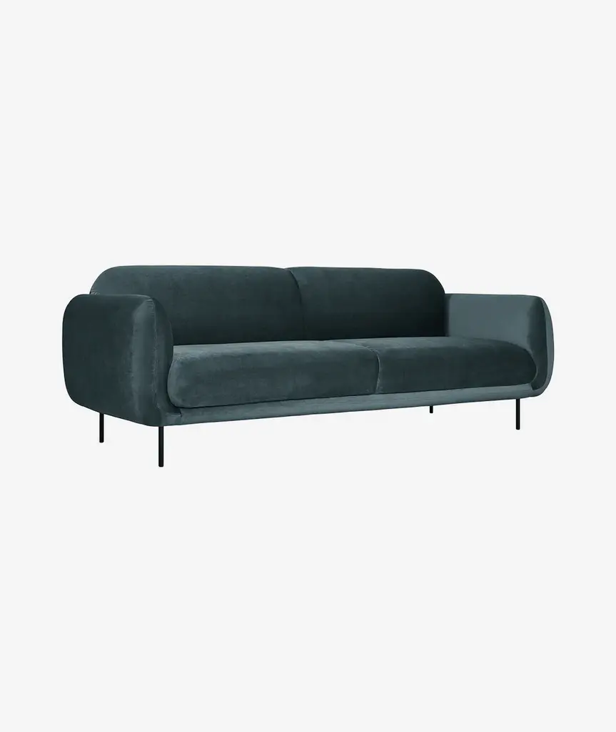 Envelop yourself in mod luxury with the plush and sophisticated Nord Sofa. With an elegant, curved silhouette, the Nord Sofa invites you to sink in and stay awhile, with a retro yet timeless shape that’s emphasized by an ample, low profile back and feminine curved arms. Each piece has been expertly crafted in lush fabric, with a tight seat and back atop black steel legs that add a modern touch to the piece’s striking ‘70s-inspired sensibilities.