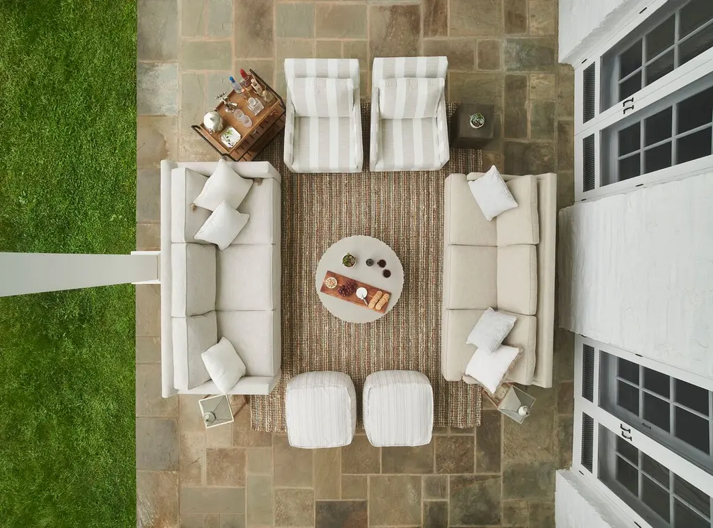Exclusive to One Kings Lane: With a petite track arm offering increased interior seating, this style can pair perfectly with your outdoor space. It is upholstered in Inside Out, an eco-friendly UV high-performance fabric that repels stains, spills, bacteria, and mold. Constructed of marine-grade birch and teak, an outdoor slat suspension system, and reticulated foam cushions featuring open cell foam which allows water to drain, ensures comfort and easy maintenance. Each style includes a custom outdoor cover constructed of heavy-duty Sunbrella canvas with elastic at the bottom to ensure a proper and snug fit. Each piece is handcrafted by skilled artisans in High Point, NC.