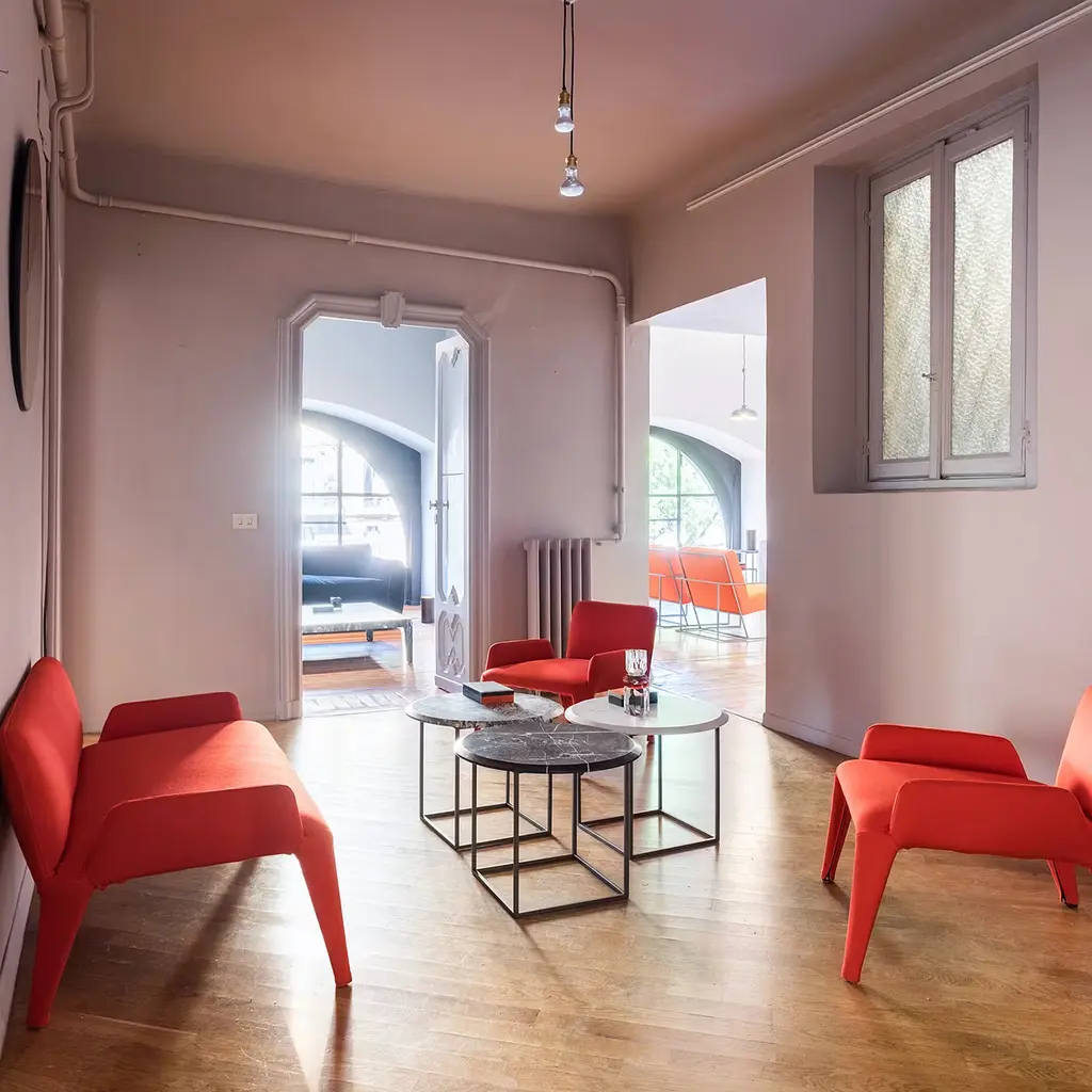 Designed by Federico Carandini in 2017, this two-seat sofa will bring a pop of color into a contemporary living room, adding charm even to a small room. The modern and fresh silhouette features four slanted legs and two small armrests. The lightweight, metal structure is equipped with elastic support belts and cushions in polyurethane with a dacron lining. The cover is in fabric with an intense red hue, but it can also be in leather. Please ask the concierge for details with changes in upholstery. The cover is completely removable.