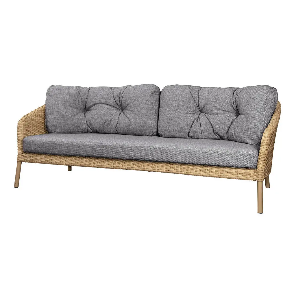 The Ocean Large sofa is designed by Cane-line Design and is a beautiful combination of modern design and traditional craftsmanship. An elegantly constructed sofa made from durable Cane-line materials on a strong aluminium frame. The playful and aesthetic wicker pattern is made from Cane-line materials, ideal material for outdoor use due to durable and weather-resistant features. The sofa comes with comfy and ultra-soft cushions lending a soft touch to its appearance. The cushions include the QuickDry + Airflow system, ensuring that the cushions are dry approximately 1 hour after a downpour.