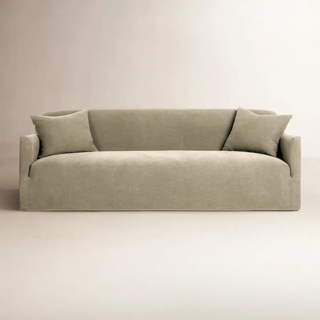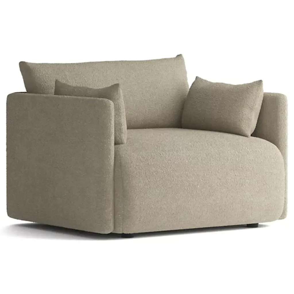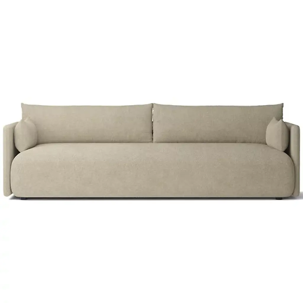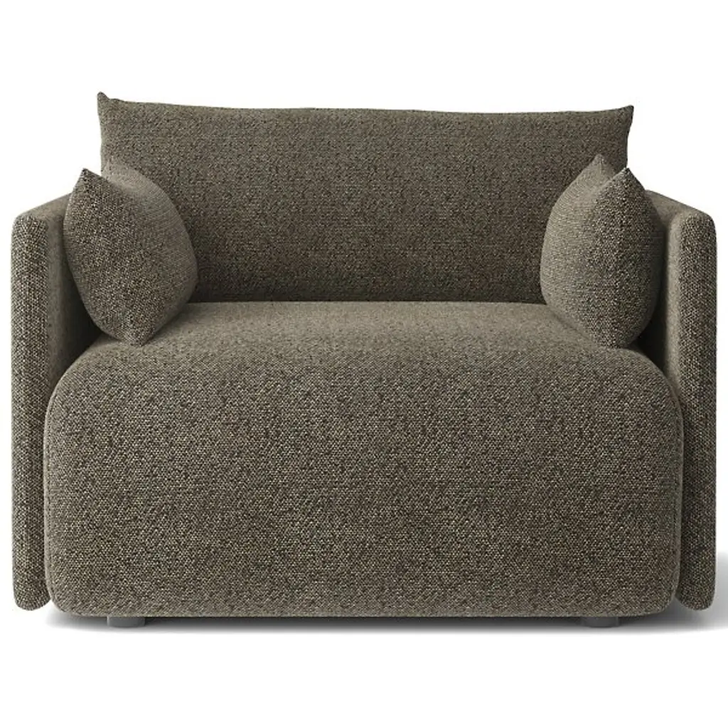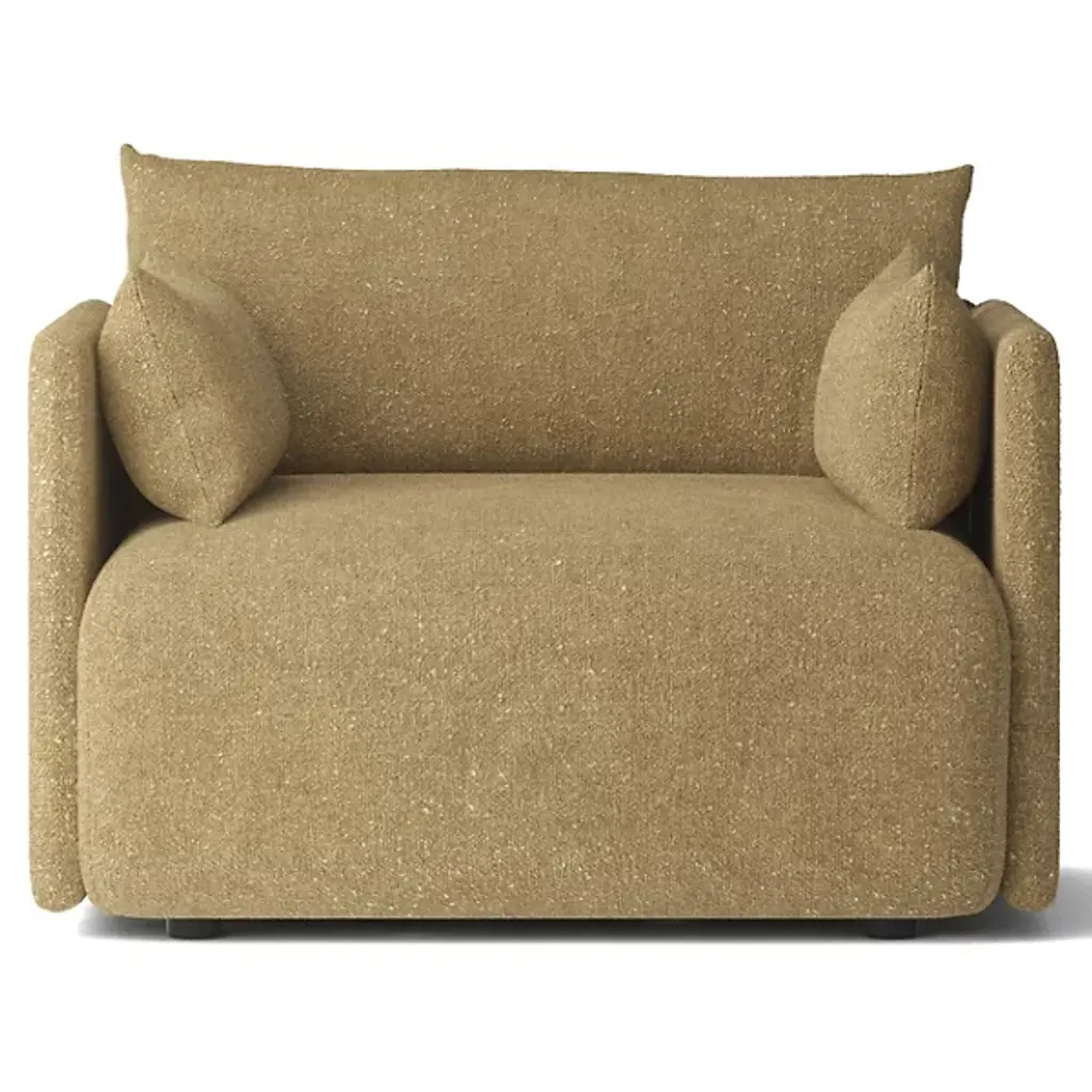 The Offset Sofa by Audo Copenhagen, formerly known as Menu, was created by Norm Architects as they researched balance. They wanted to create a piece that embraces a set of paradoxes: something that was substantial yet delicate in appearance and architectural yet inviting. The creation process included experimenting with offsetting – playing with proportions, which resulted in a clean-lined and boxy shaped sofa that has a minimalistic look. A structural frame supports a set of comfortable foam cushions that do not contain zig-zag springs, making it a great spot to relax. Narrow armrests complete this design, and it is elevated slightly thanks to a set of metal legs. A foam granulate and feather blend comprises the sofa's comfy filler.