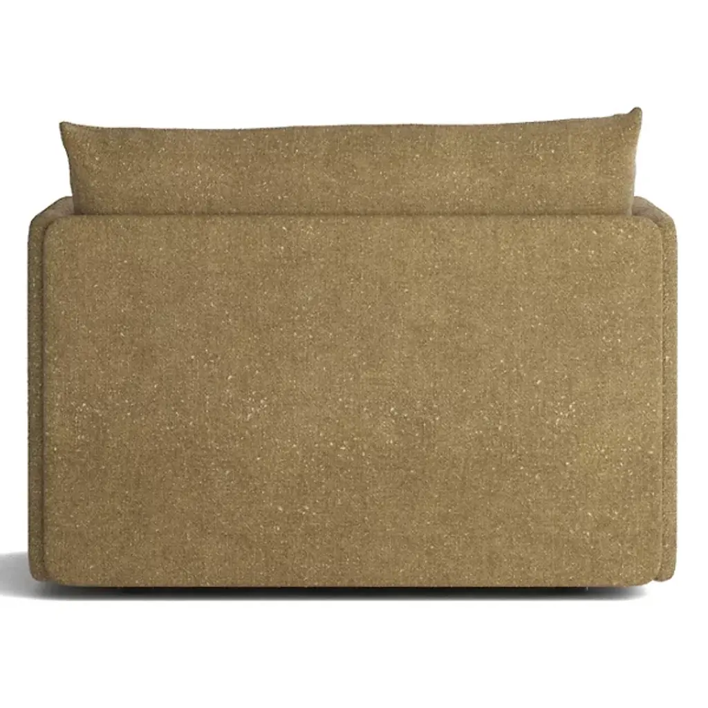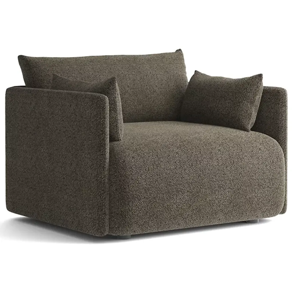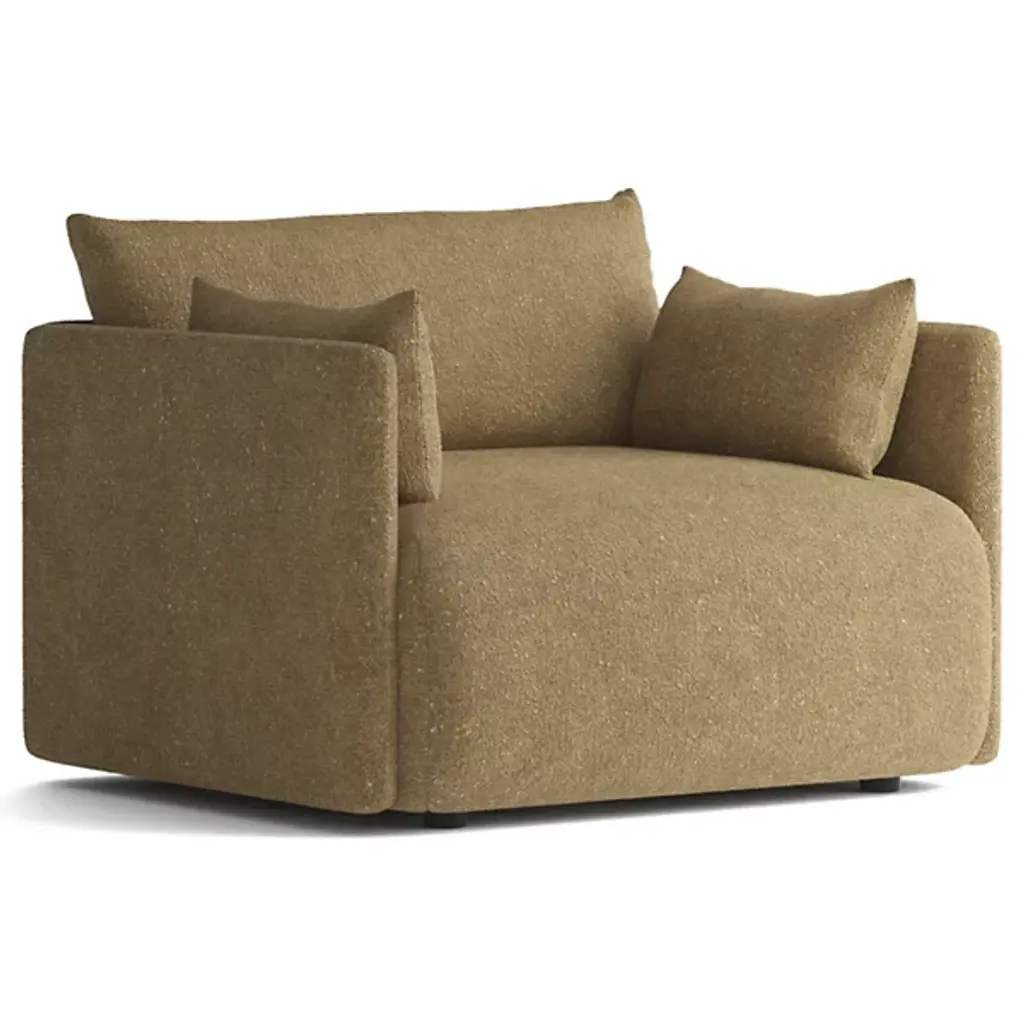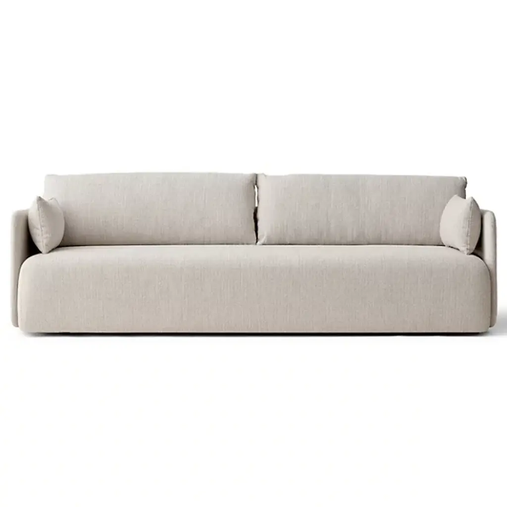The Offset Sofa by Audo Copenhagen, formerly known as Menu, was created by Norm Architects as they researched balance. They wanted to create a piece that embraces a set of paradoxes: something that was substantial yet delicate in appearance and architectural yet inviting. The creation process included experimenting with offsetting – playing with proportions, which resulted in a clean-lined and boxy shaped sofa that has a minimalistic look. A structural frame supports a set of comfortable foam cushions that do not contain zig-zag springs, making it a great spot to relax. Narrow armrests complete this design, and it is elevated slightly thanks to a set of metal legs. A foam granulate and feather blend comprises the sofa's comfy filler.