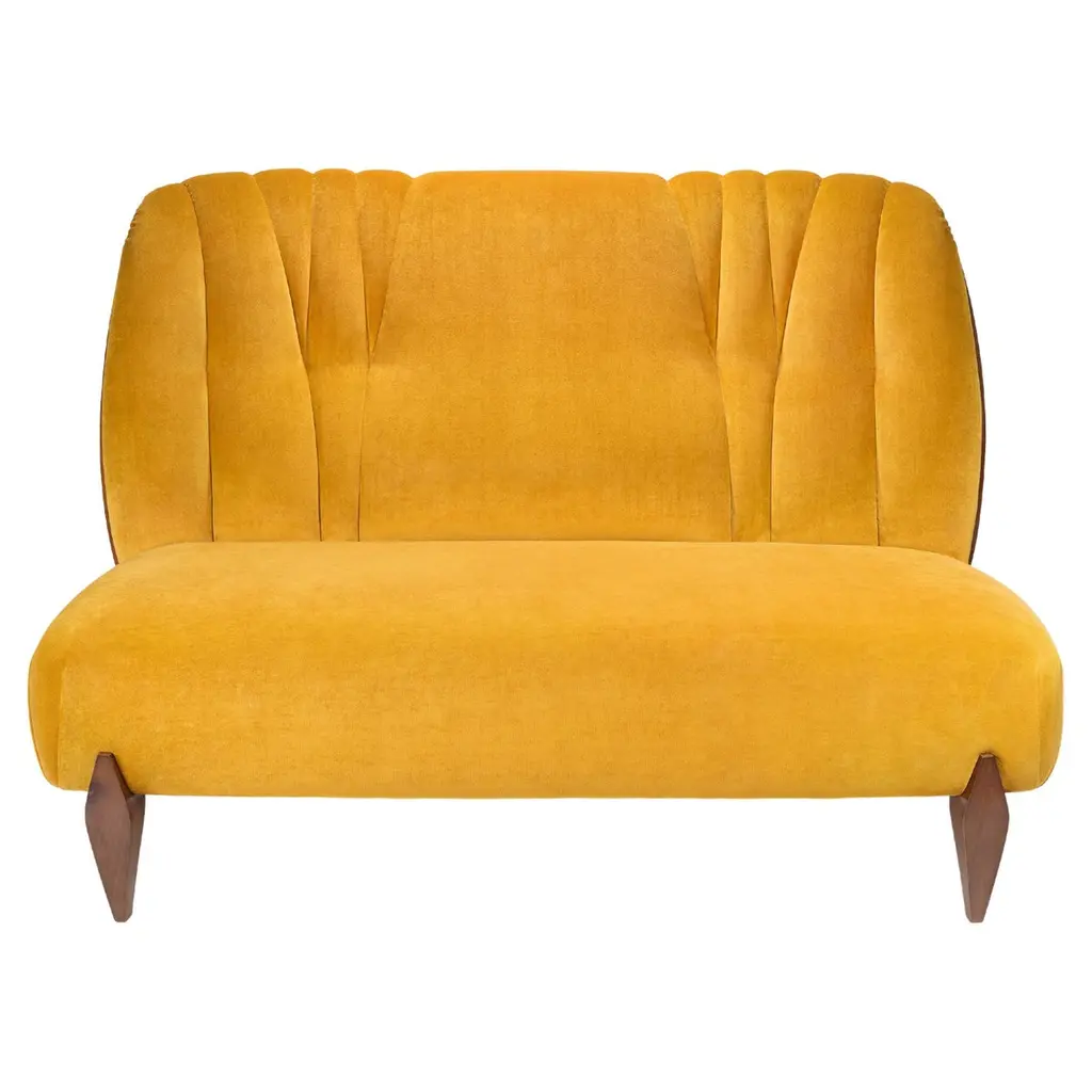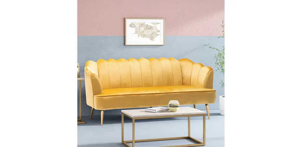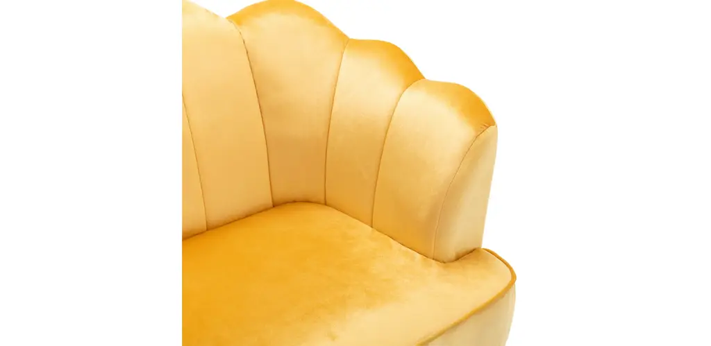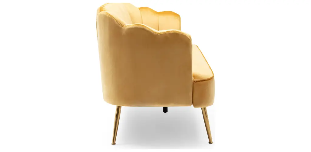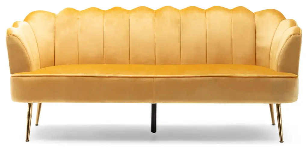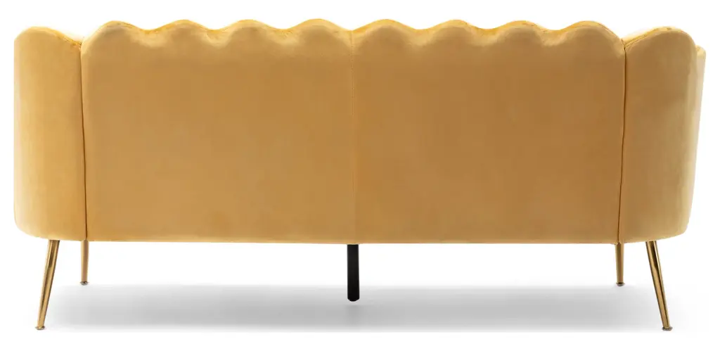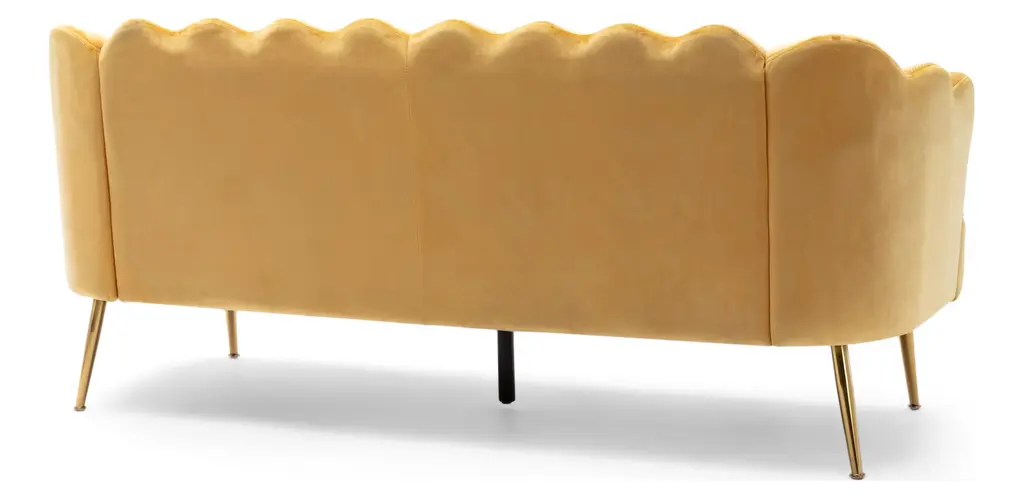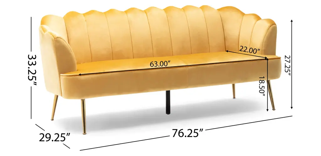 Turn your indoor lounge area into one of luxurious style. Our three-seater sofa offers your interior space eye-catching aesthetics with its beautiful shell design and elegant channel stitching, making this piece a perfect modern glam addition for any room. Finished with soft velvet upholstery and sleek tapered legs, this piece not only secures your decor in refined elegance but also provides incredible relaxation for all. From cozy movie night gatherings to casual conversations, our sofa will have you anchored in style.MODERN GLAM: Our sofa showcases smooth velvet textures and jewel-like colors that pair seamlessly with clean, straight lines for a luxurious modern glam look. Complemented with a curvaceous shell design and minimalistic structure, this sofa brings a sleek touch to any decor.CHANNEL STITCHING: The channel stitching in the backrest and arms offers an extra touch of sophistication that provides a smooth design. The straight stitch pattern adds a bit of texture without sacrificing any comfort.VELVET: Our velvet is 100% polyester, featuring a featherlike softness and unique sheen. With a built-in resistance to wrinkles and outstanding durability, this velvet is hands down the best option amongst velvets.IRON LEGS: Constructed of iron, the legs of this sofa are made to be incredibly durable, ensuring that this piece will hold up under use. Refined with a stunning gold finish, these beautifully tapered legs bring an elegant touch to this piece, making it an understated yet chic addition to your home.DIMENSIONS: Choose an accessory that is the perfect size for you and your furniture. This sofa is 76.25" W x 29.25" D x 33.50" H. You will love how much your space can transform with the simple addition of this charming sofa.Material: VelvetLeg Material: IronMultiple Color OptionsHand-Crafted DetailsAssembly RequiredDimensions: 29.25 inches deep x 76.25 inches wide x 33.25 inches highSeat Dimensions: 22.00 inches deep x 63.00 inches wide x 18.50 inches highArm Height: 27.25 inches