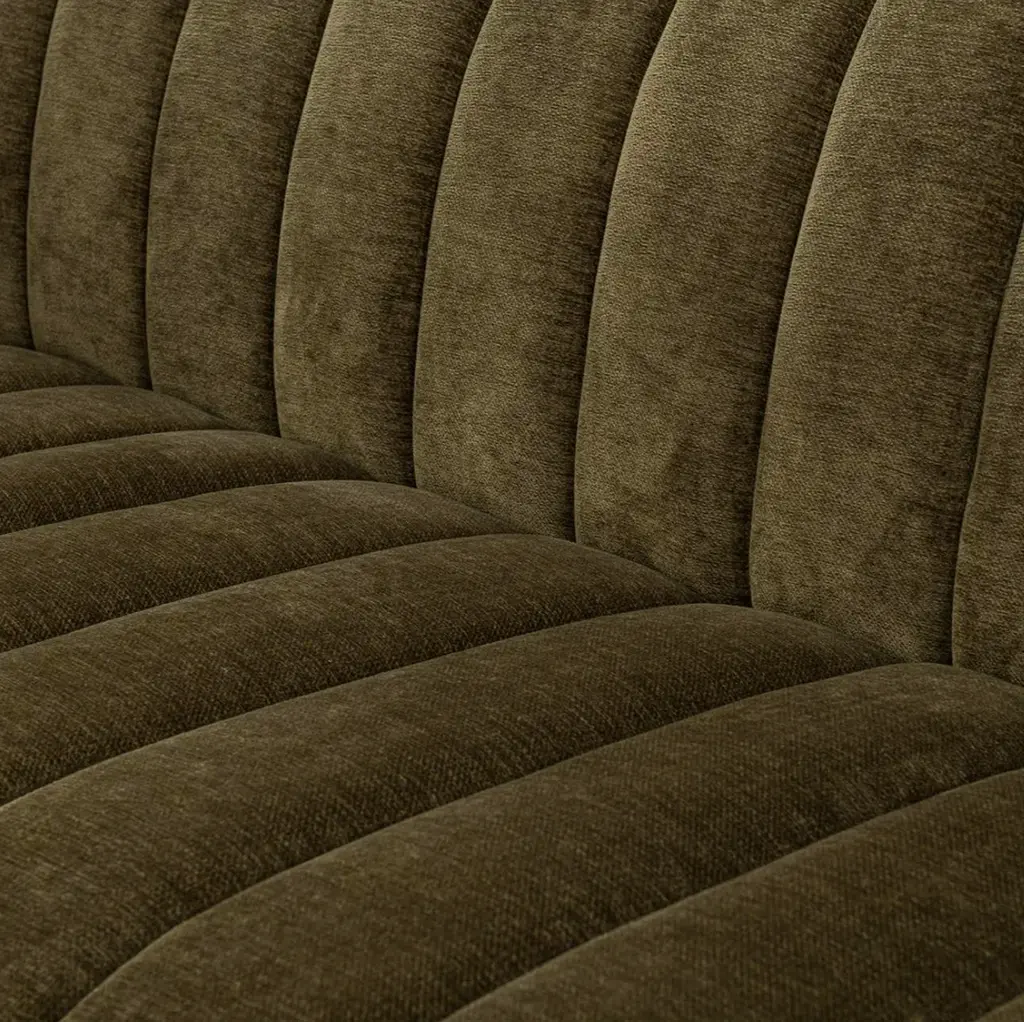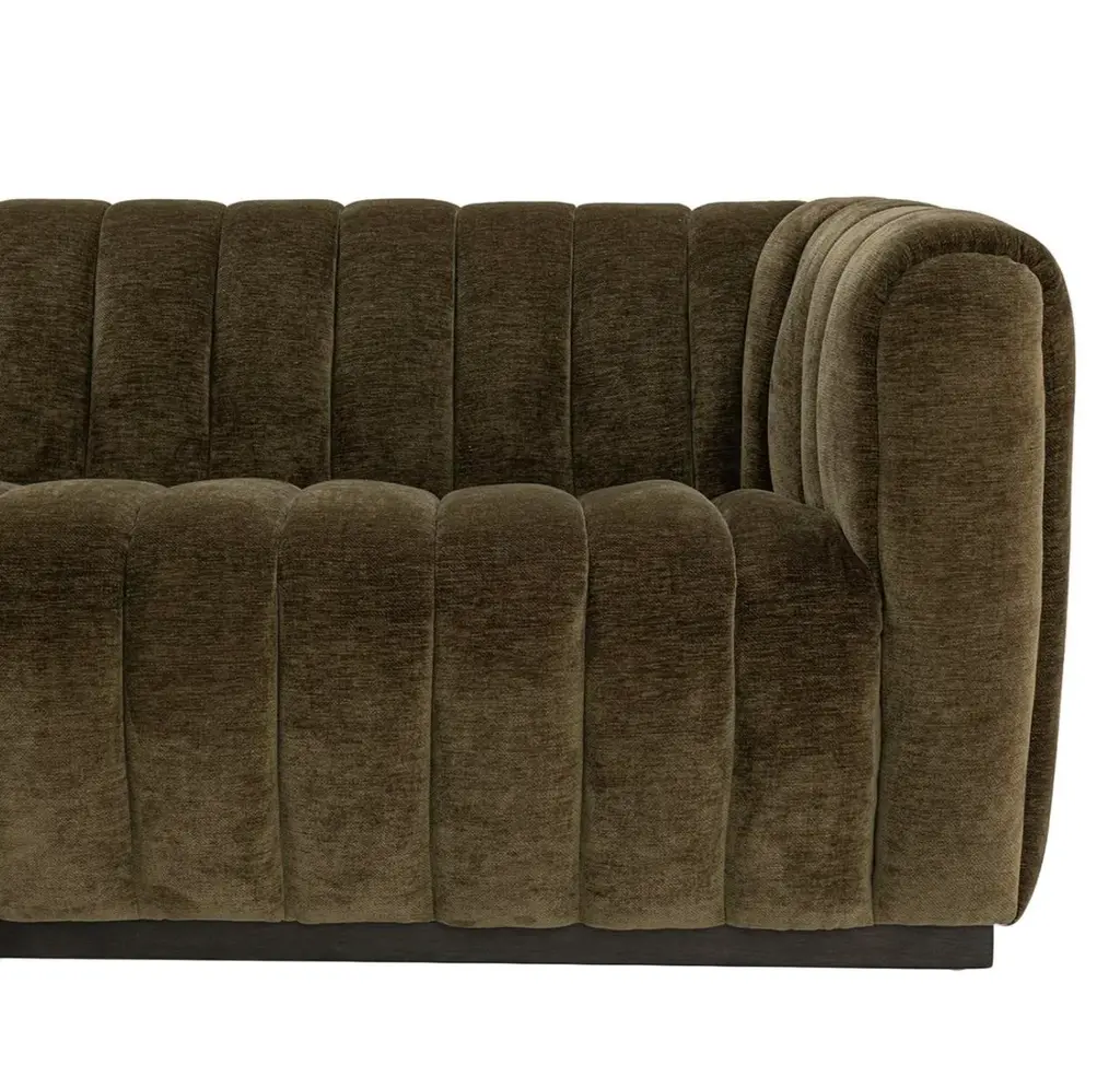 Beautiful olive green toned velvet sofa with classic channel tufting. Midcentury modern style with warm rich color.