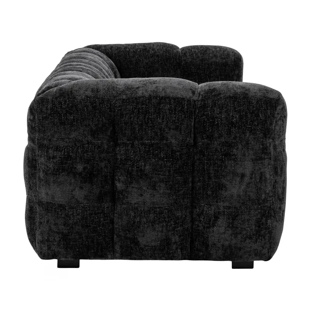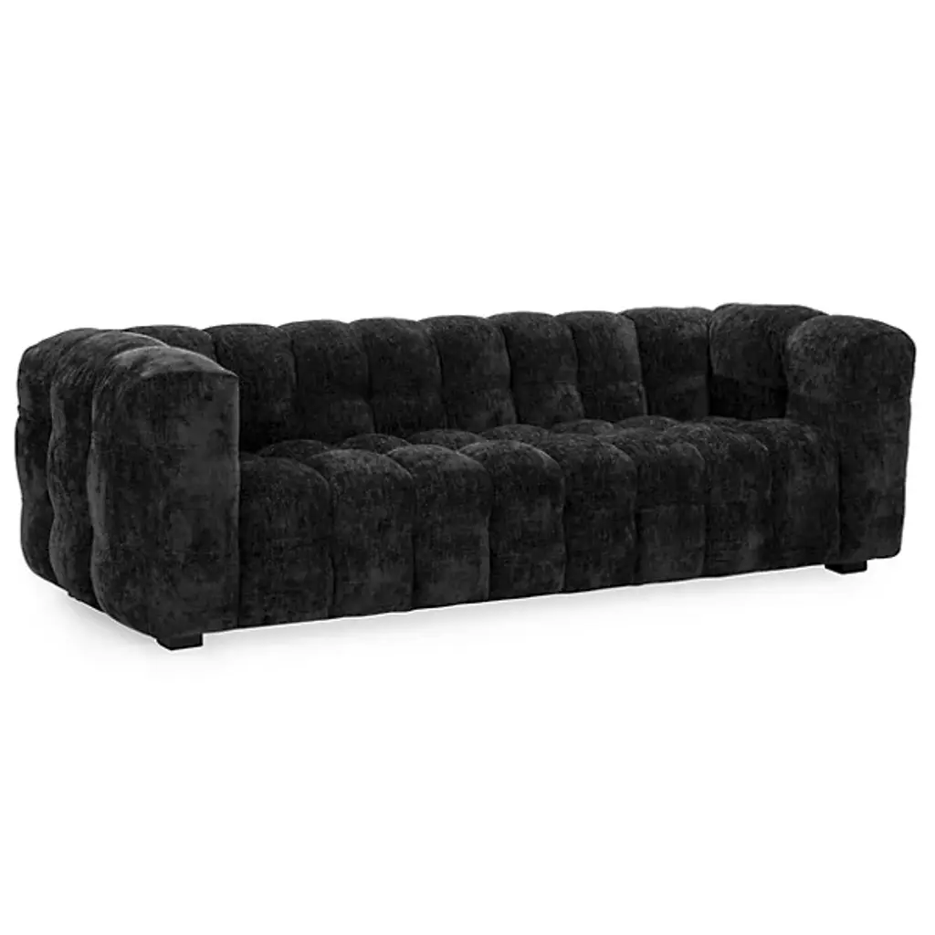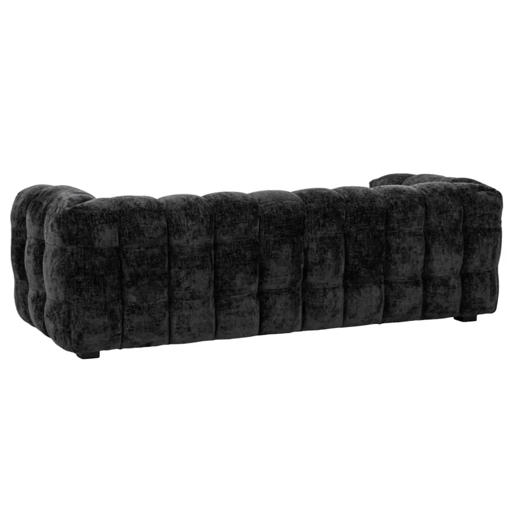Handsome onyx black chenille upholstered sofa with plush square quilt tufting detail. Attractive modern piece wonderful for many interior spaces.