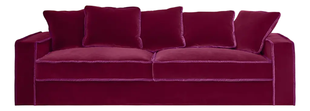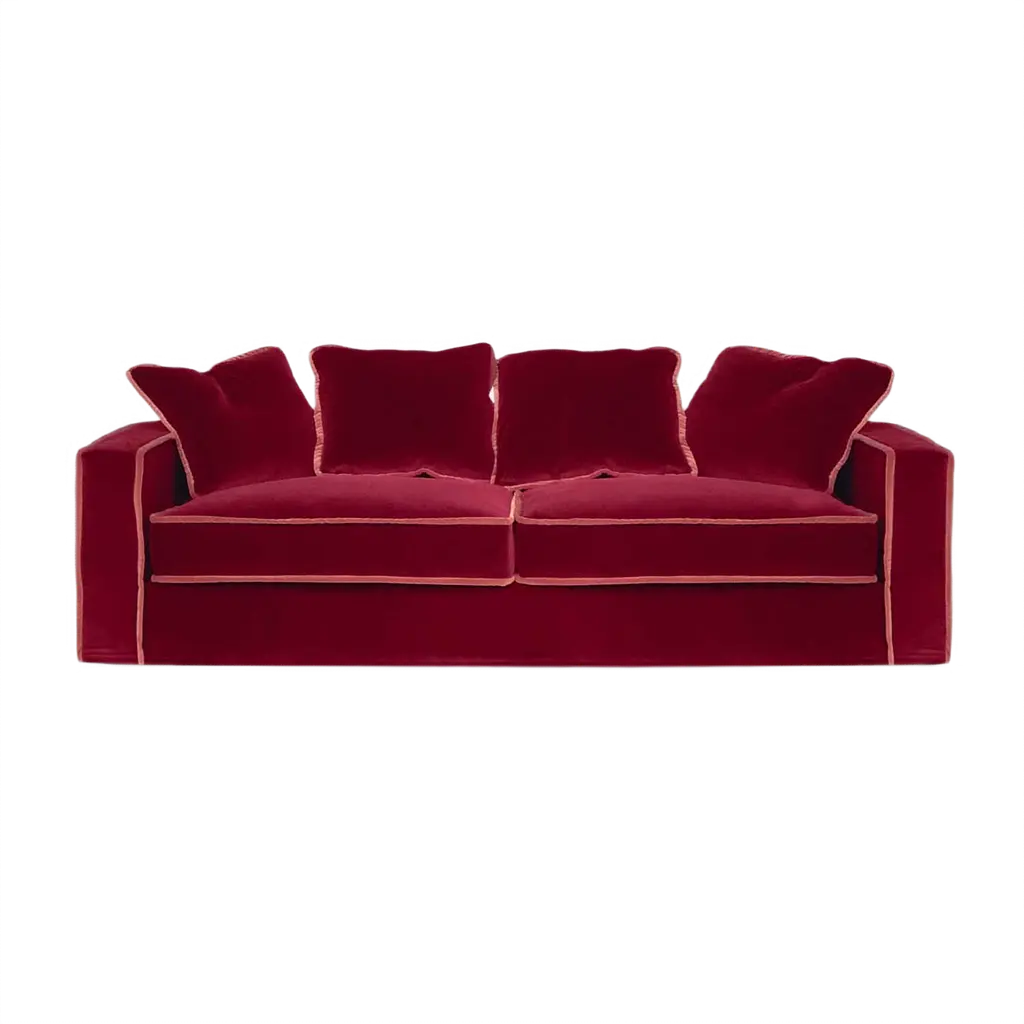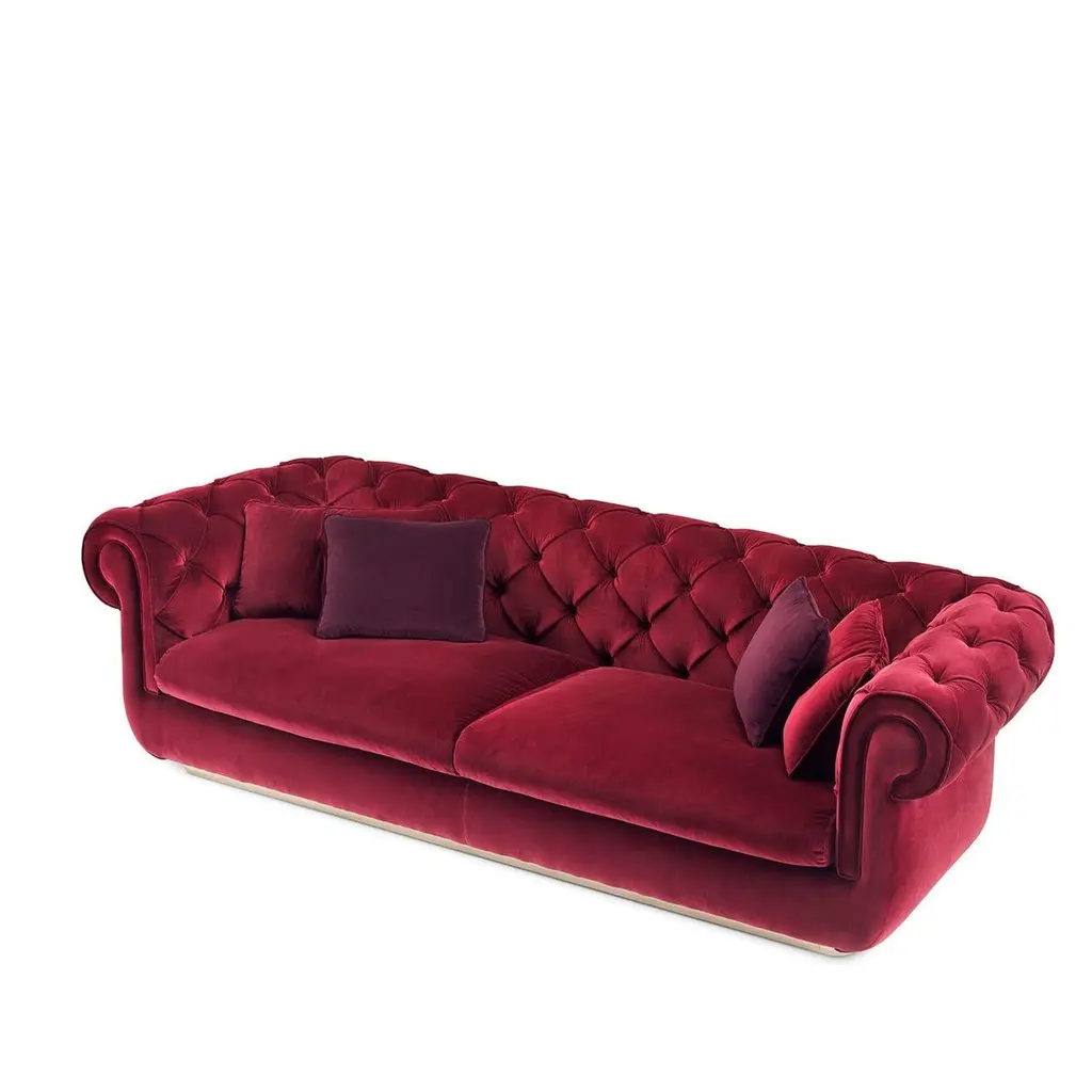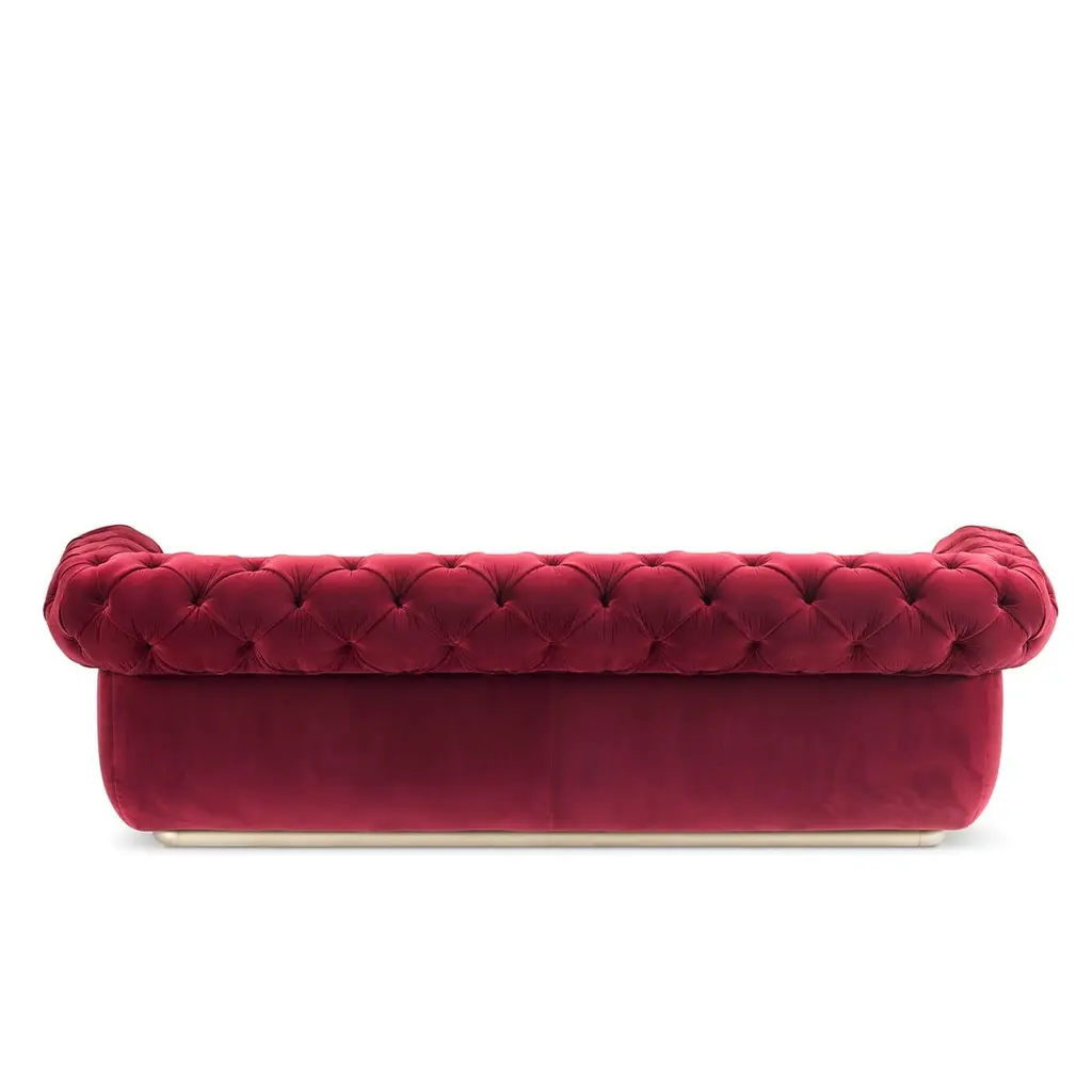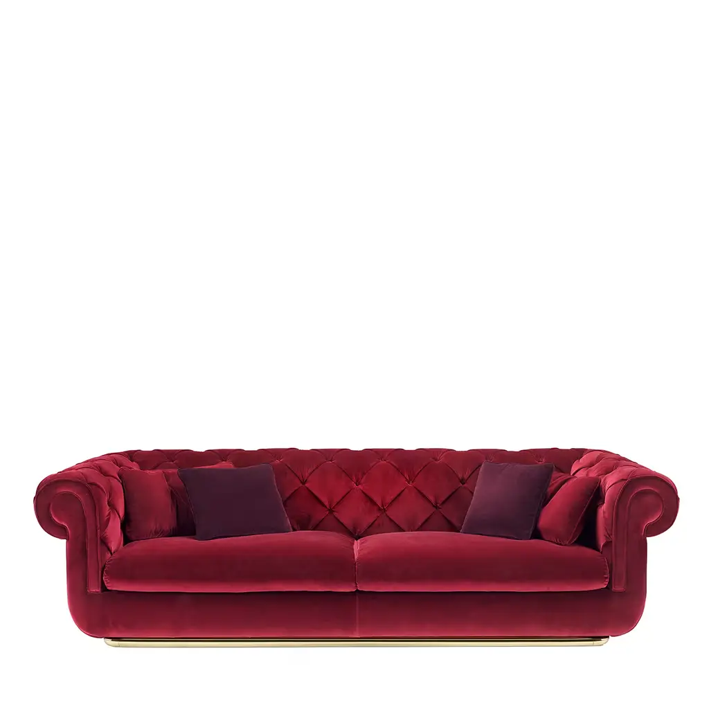 This superb sofa exudes pure regal flair with its palette combining the intense shade of burgundy of its fabric upholstery and glistening golden finish of the base. Marked by rolled profiles adorned with a refined tufted design, the backrest and armrests reveal the clear Chesterfield inspiration that lends this sofa its timeless charm. Designed by Stefano Giovannoni, it is also available in a black variant.