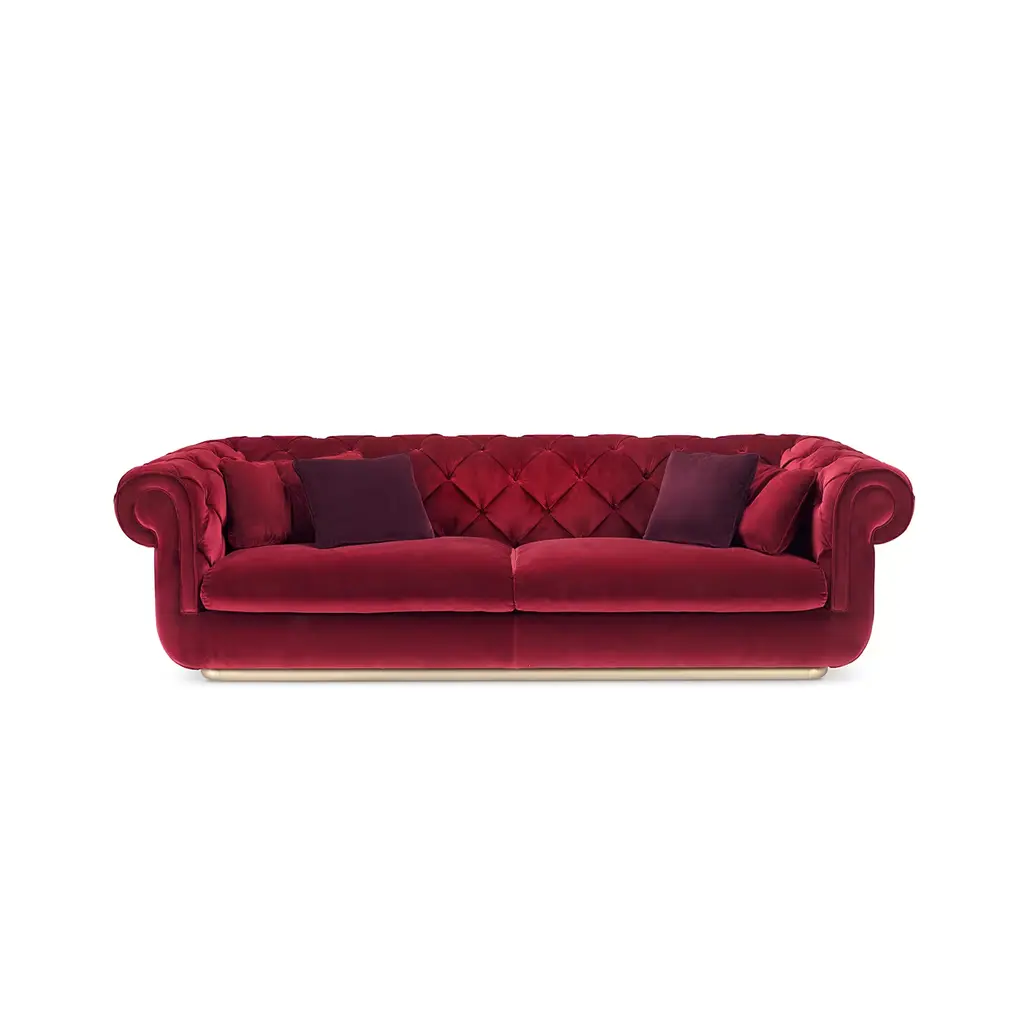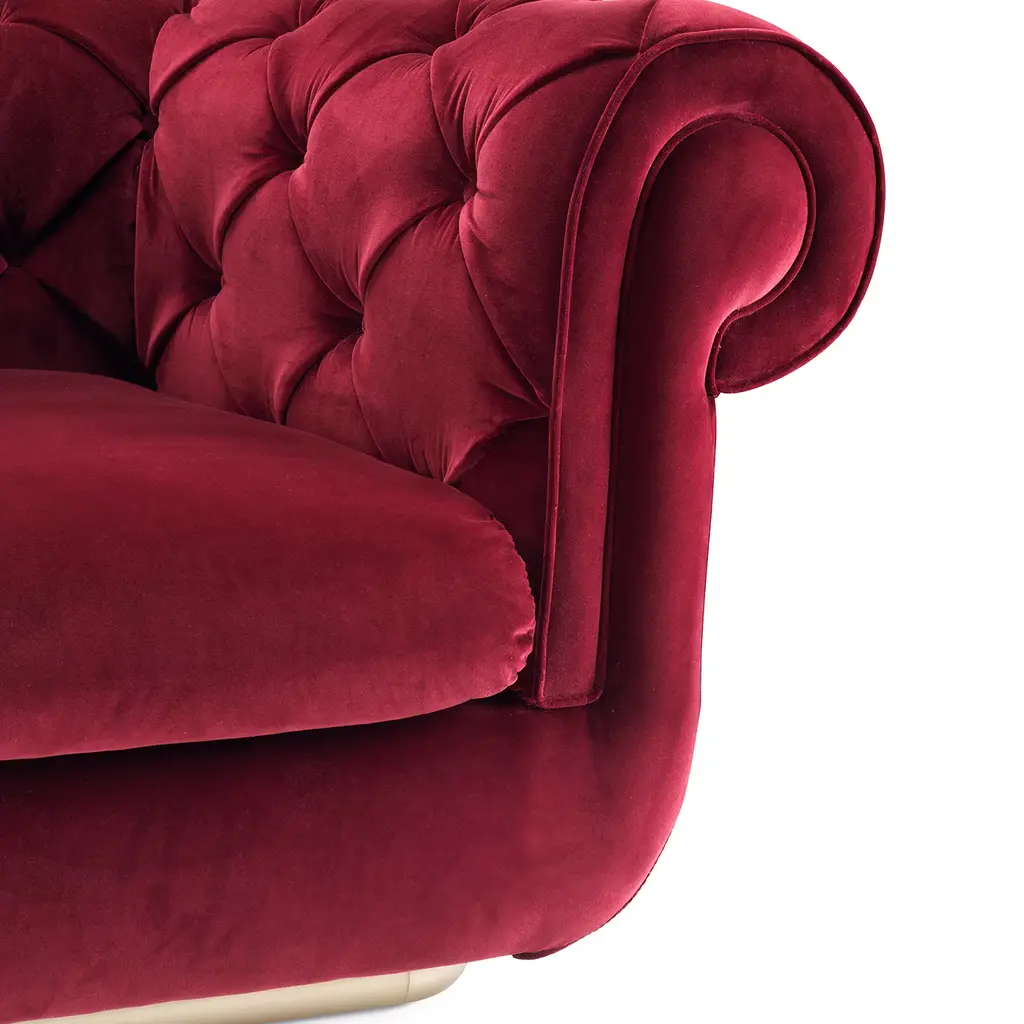 This superb sofa exudes pure regal flair with its palette combining the intense shade of burgundy of its fabric upholstery and glistening golden finish of the base. Marked by rolled profiles adorned with a refined tufted design, the backrest and armrests reveal the clear Chesterfield inspiration that lends this sofa its timeless charm. Designed by Stefano Giovannoni, it is also available in a black variant. For the US market, please contact the Concierge for CAL TB 117 certified fabrics.